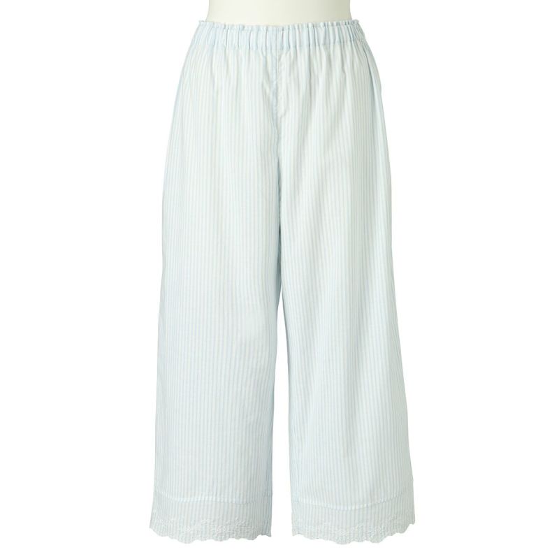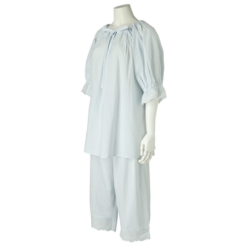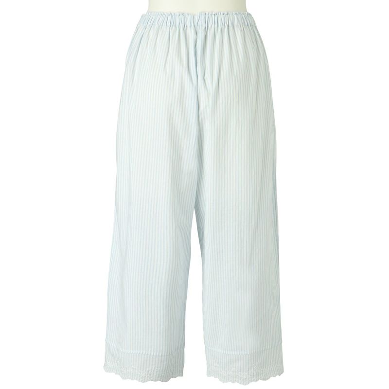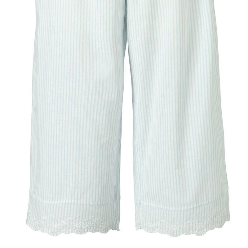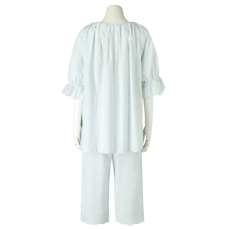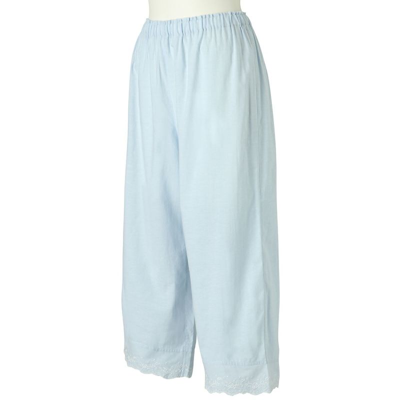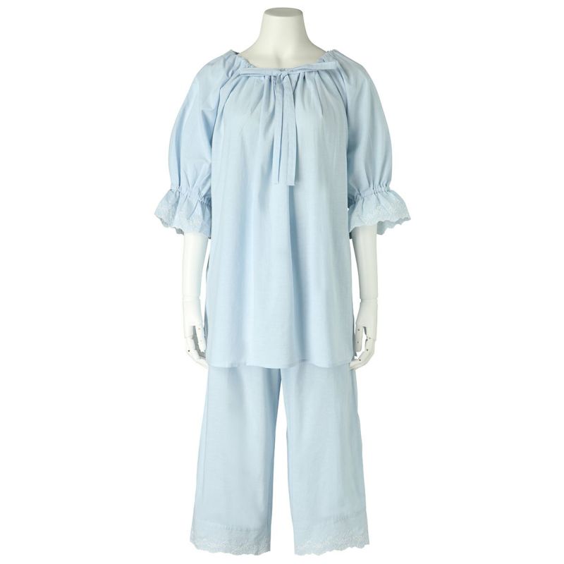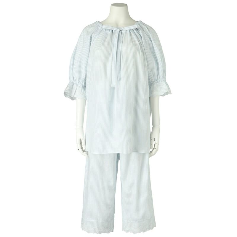 6分袖パジャマは、フェミニンなブラウス風デザイン。襟もとのフリルや袖口のギャザー使いなど愛らしいディティールが満載です。上の襟はフリルにしたエンブロイダイリーレースのハシゴ穴部分にリボンを通した手の込んだディティール。7分丈パンツは裾のエンブロイダリーレースの透け感も軽やか。首回りの開き具合はリボンで調整が可能です。