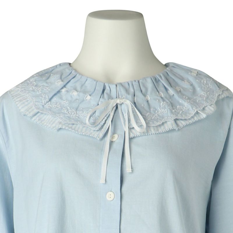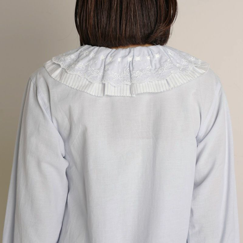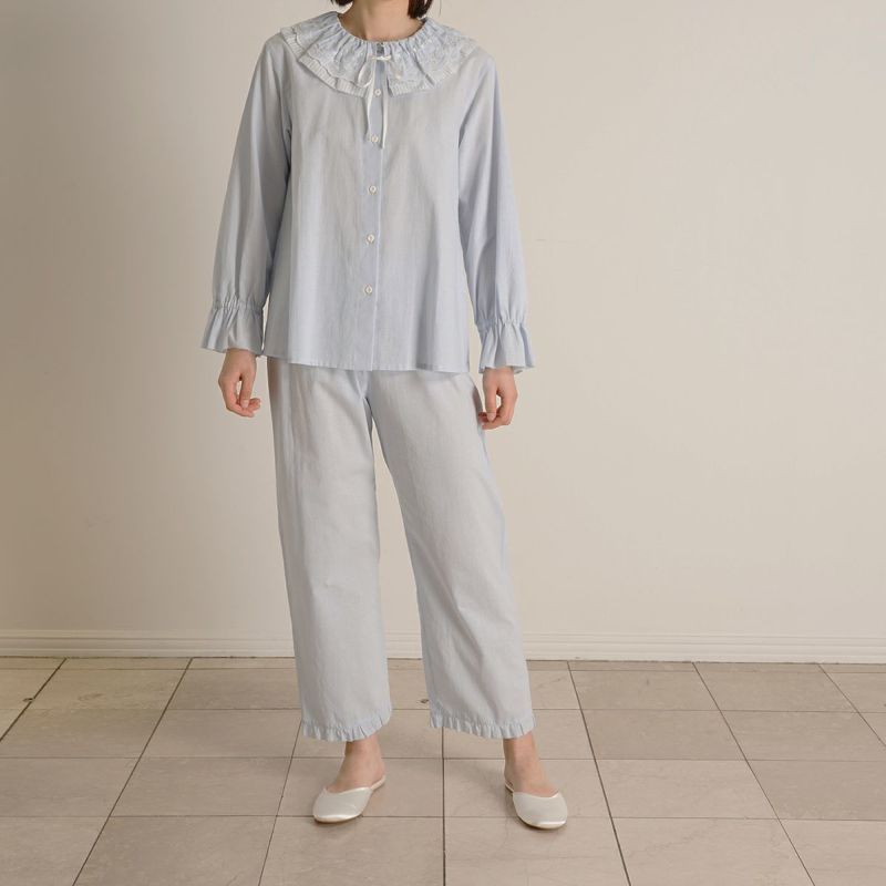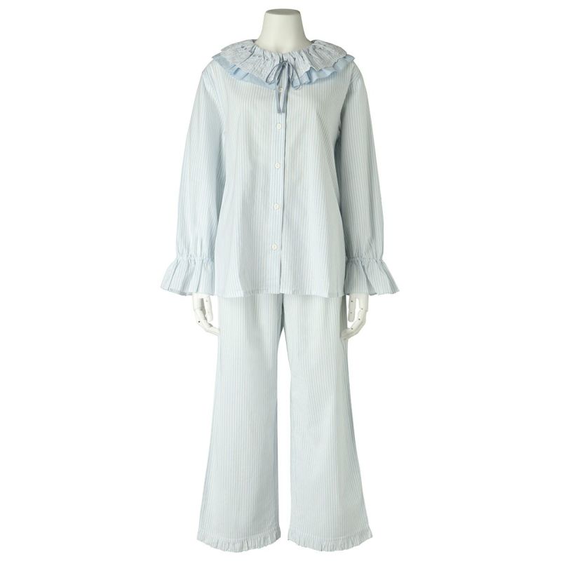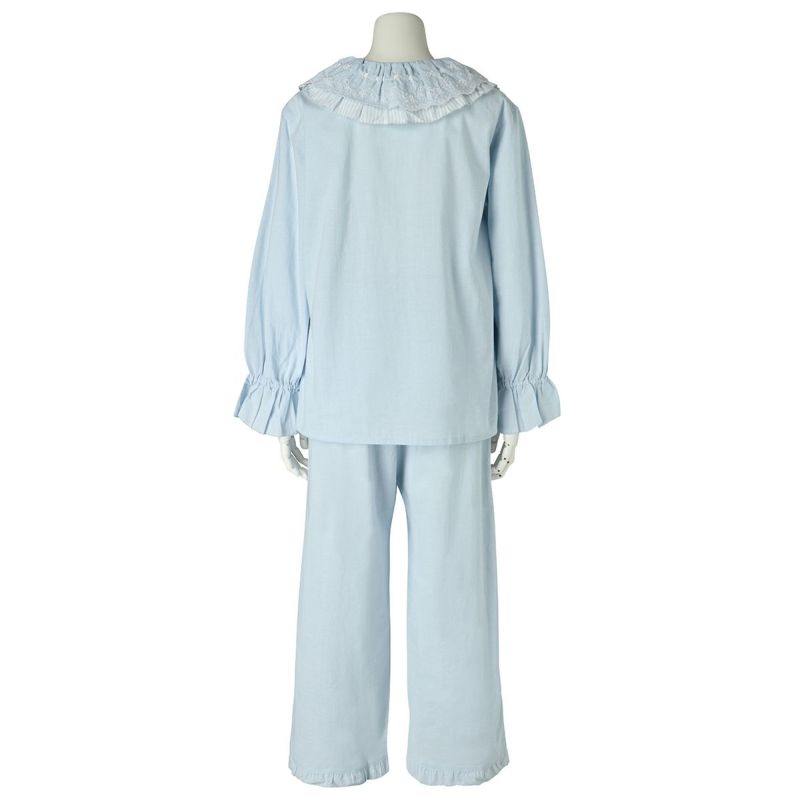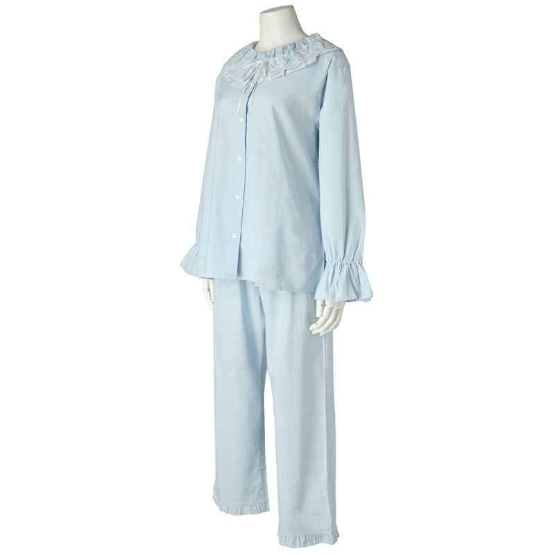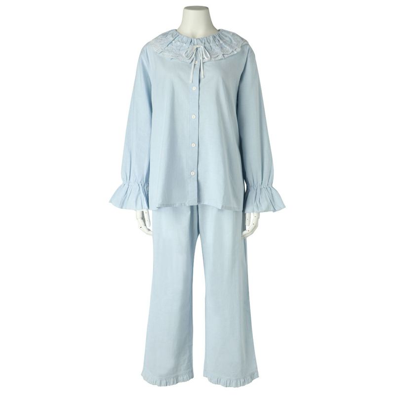二重になった衿ぐりが華やかな前開きタイプの長袖パジャマ。上の襟はフリルにしたエンブロイダイリーレースのハシゴ穴部分にリボンを通した手の込んだディティール。端はスカラップを活かし、よりフェミニンに。下の襟も端をピコカットで仕上げたこだわりの仕様です。パンツの裾もピコカットしたフリルを入れた大人のかわいさあふれるデザインです。