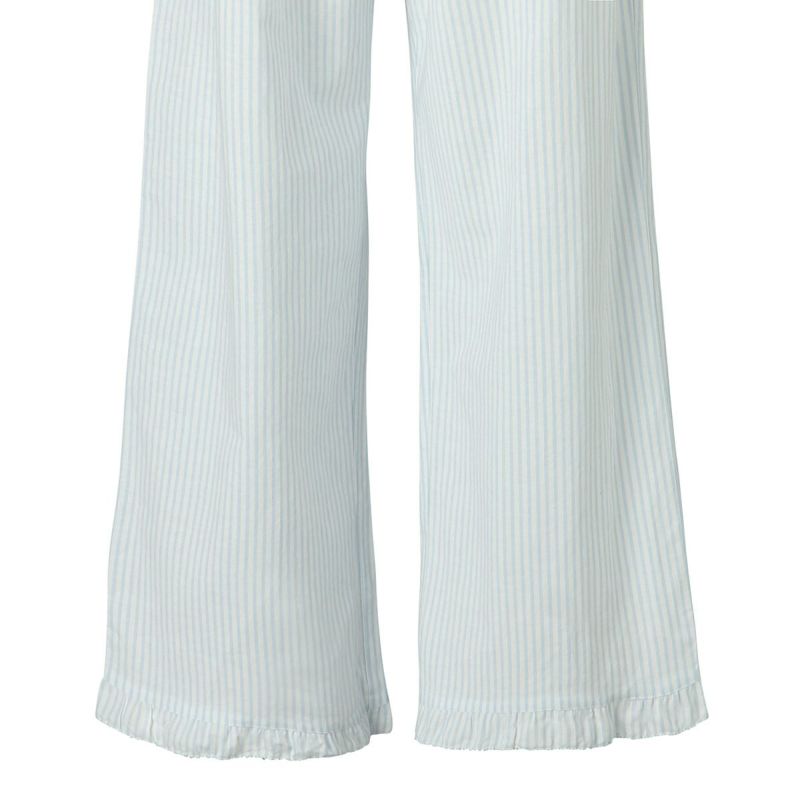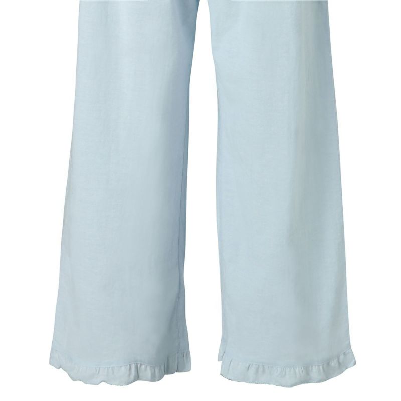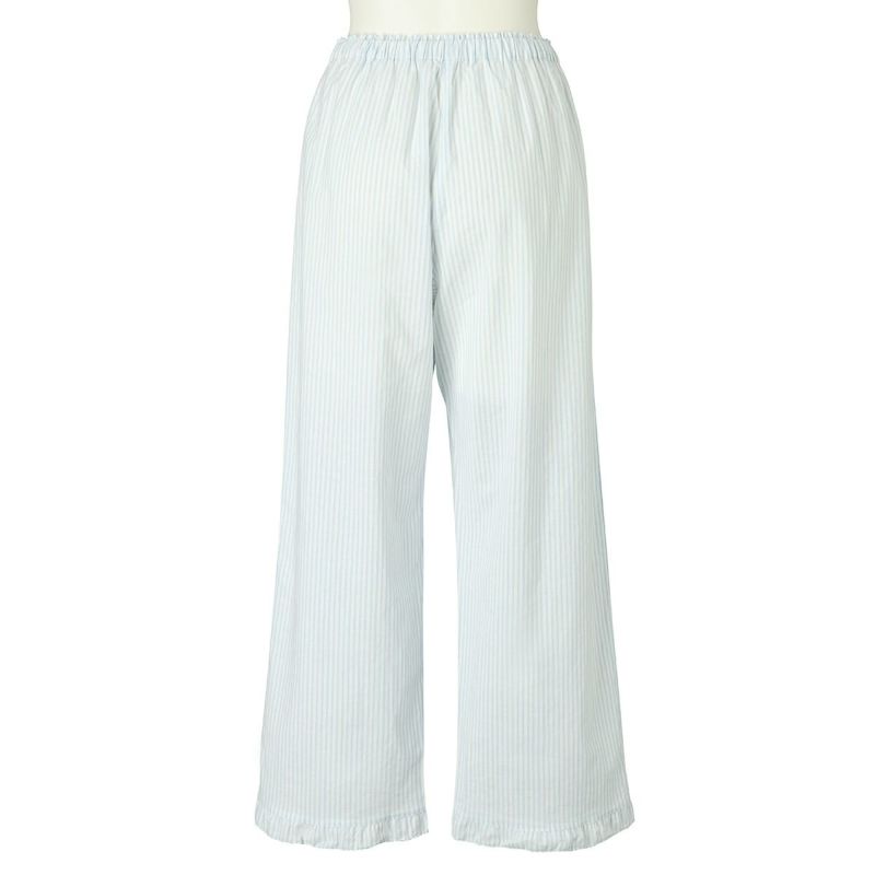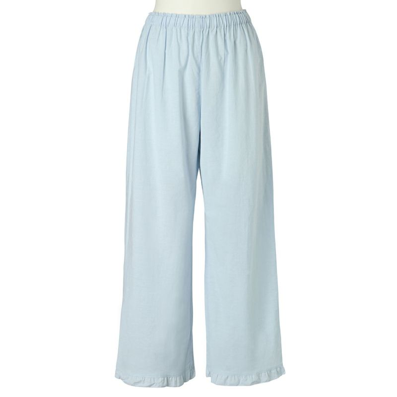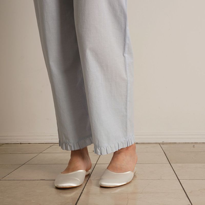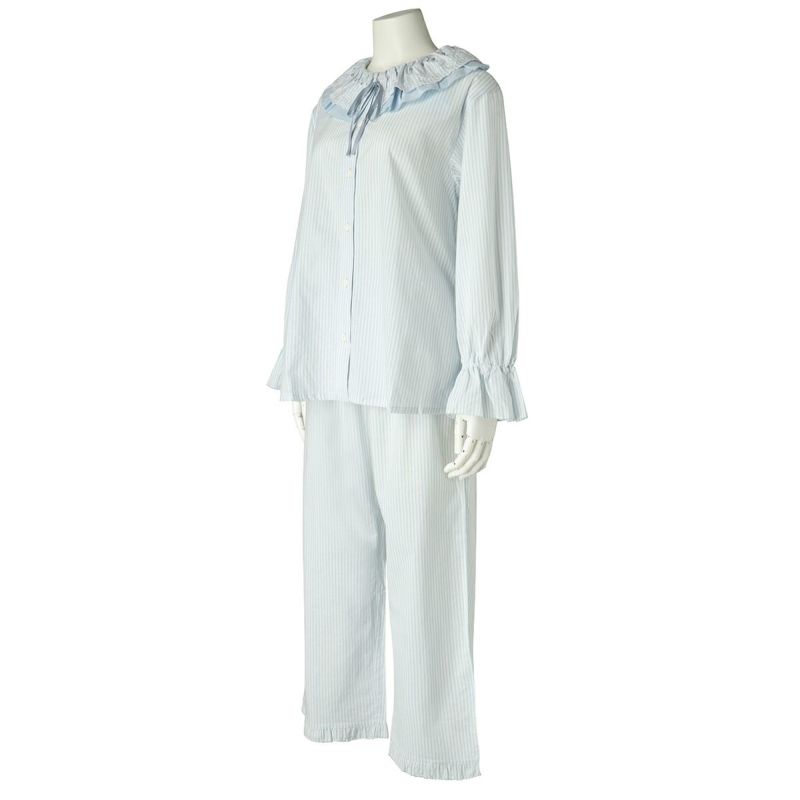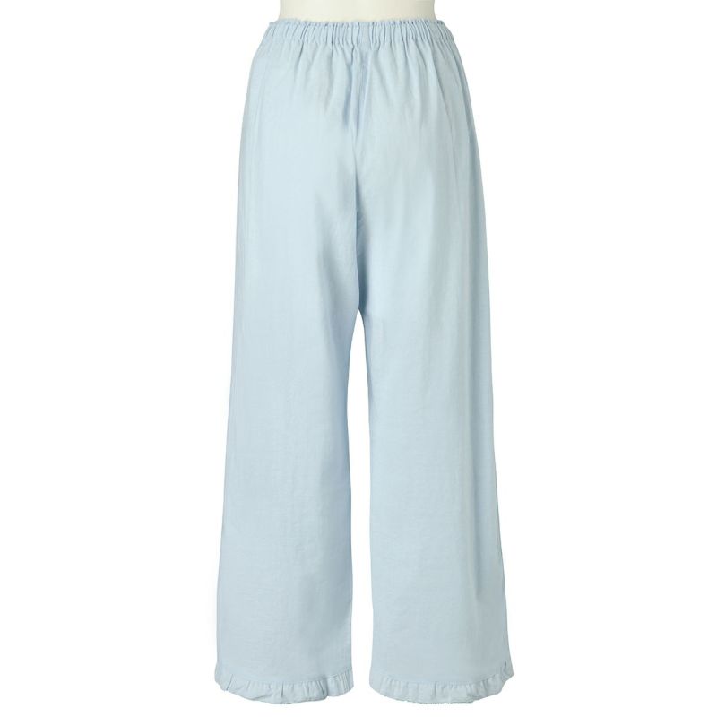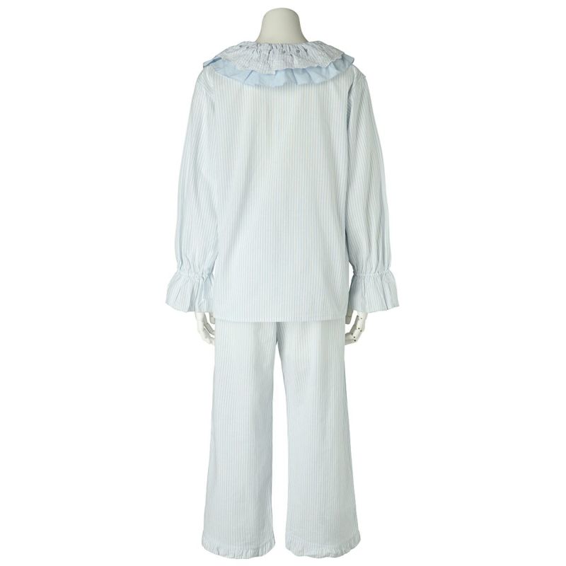 二重になった衿ぐりが華やかな前開きタイプの長袖パジャマ。上の襟はフリルにしたエンブロイダイリーレースのハシゴ穴部分にリボンを通した手の込んだディティール。端はスカラップを活かし、よりフェミニンに。下の襟も端をピコカットで仕上げたこだわりの仕様です。パンツの裾もピコカットしたフリルを入れた大人のかわいさあふれるデザインです。