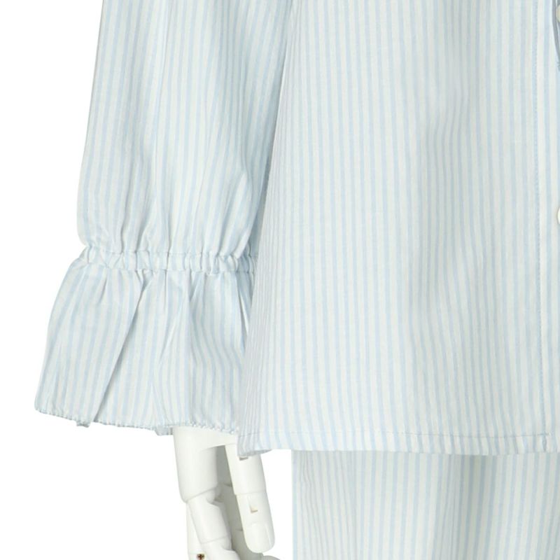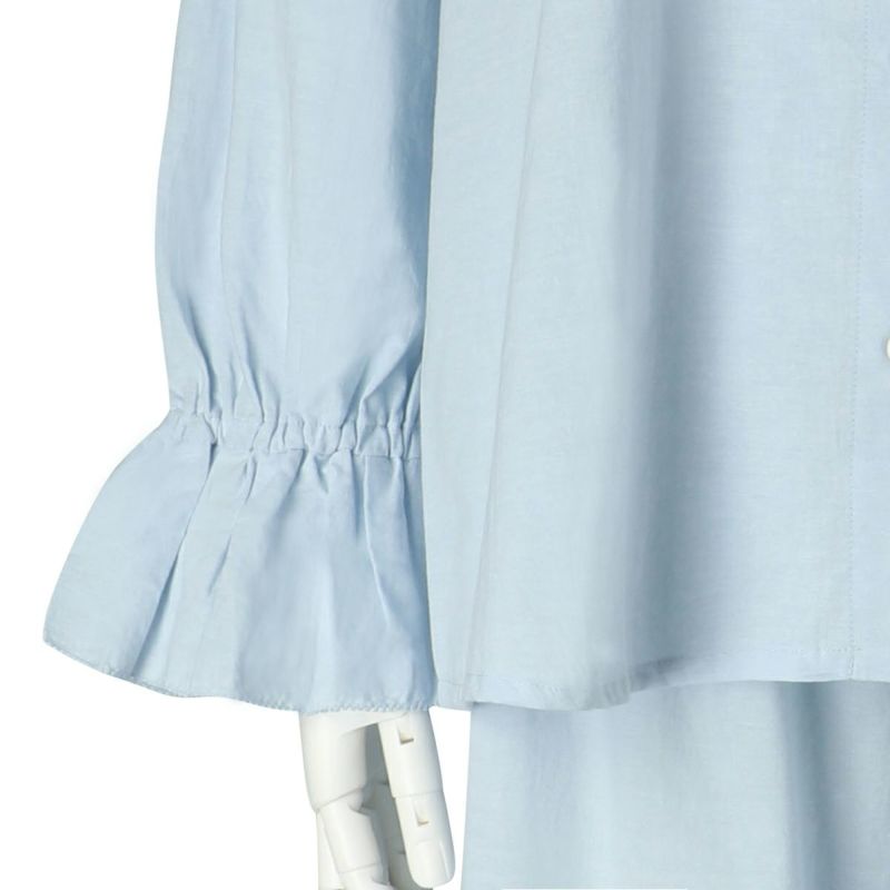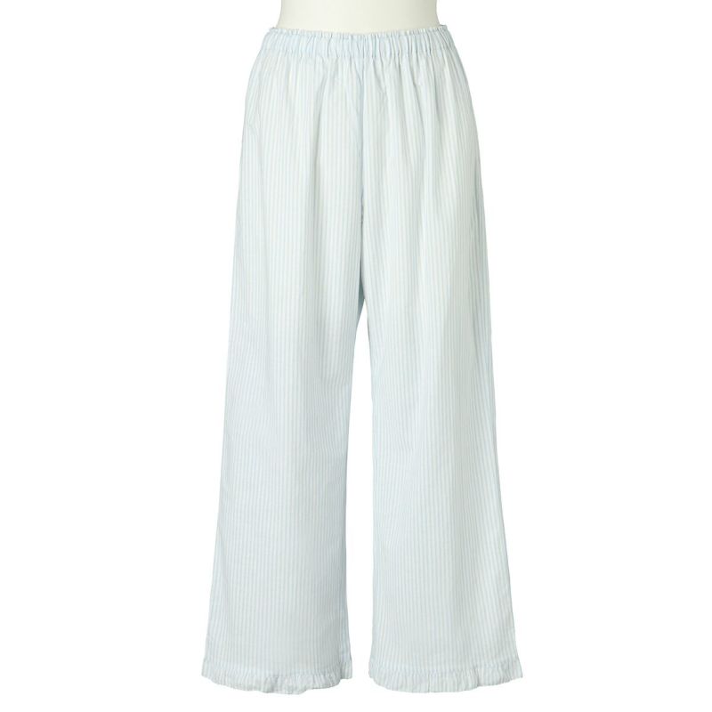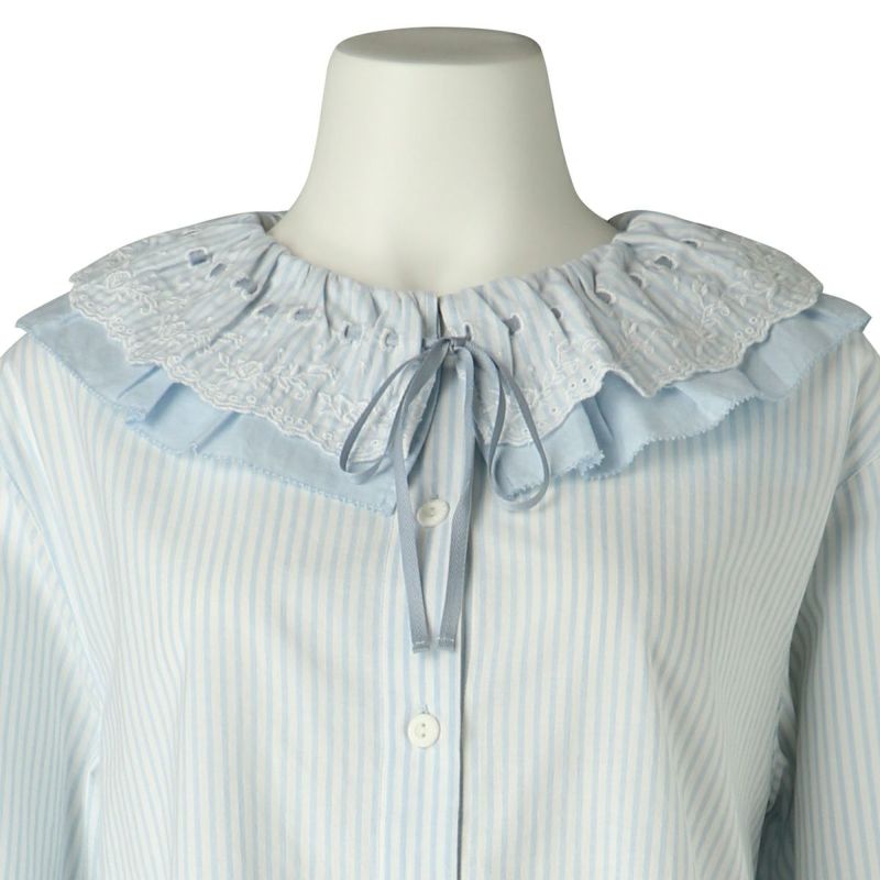 広幅のエンブロイダリーレースがフェミニンなシリーズ。さらっとした新素材コットンシャンブレーワッシャーを無地とストライプの2色をアイテムにより効果的に組み合わせました。春を感じるキッドブルーらしい爽やかでクリーンなカラーリング。