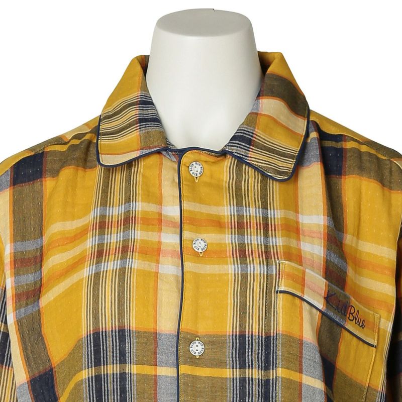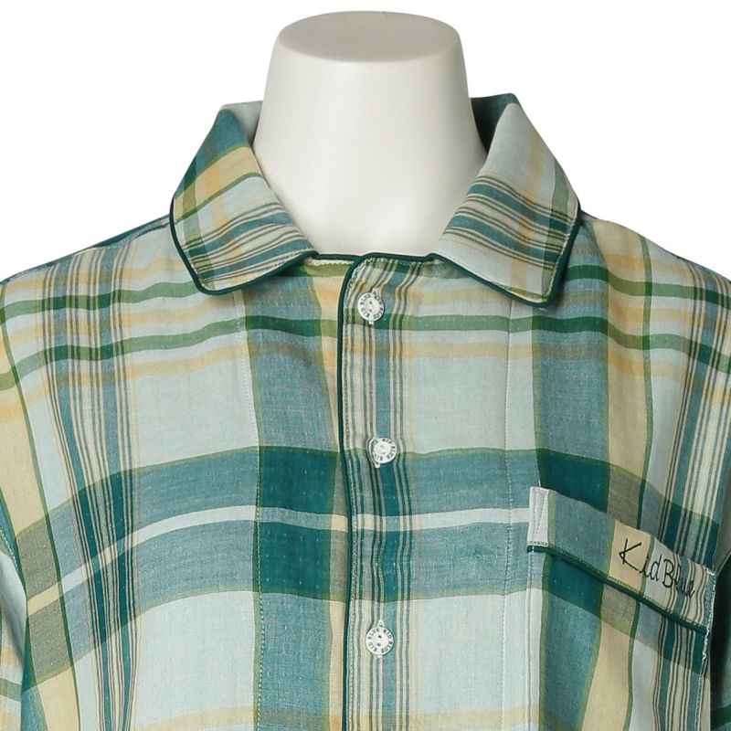 ユニセックスサイズの長袖パジャマ。襟は開襟にもできる2way仕様。胸ポケットのロゴ刺しゅうがアクセント。ベーシックな中にもパイピングなどこだわりのディテールでキッドブルーらしく仕上げました。ボトムはウエスト紐付。
