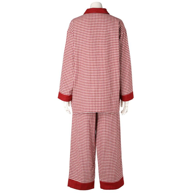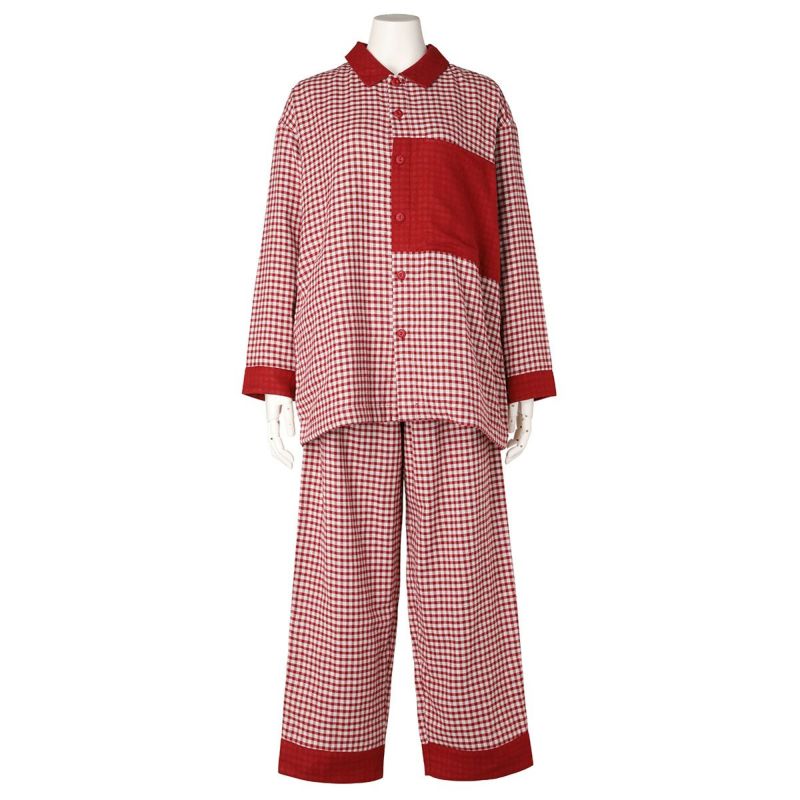 襟や大き目のポケットなど配色を効かせた前開きタイプの長袖パジャマ。部分的に無地の配色生地を使用し、メリハリのある見え感に。ボトムはウエスト紐付き。ユニセックスサイズなのでお好みのサイズ感で着こなして。ギフトにもおすすめ。