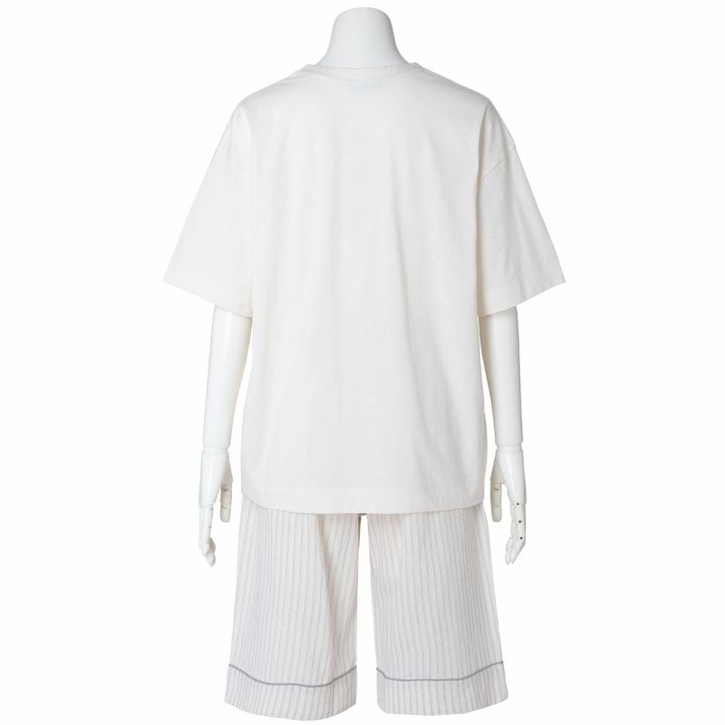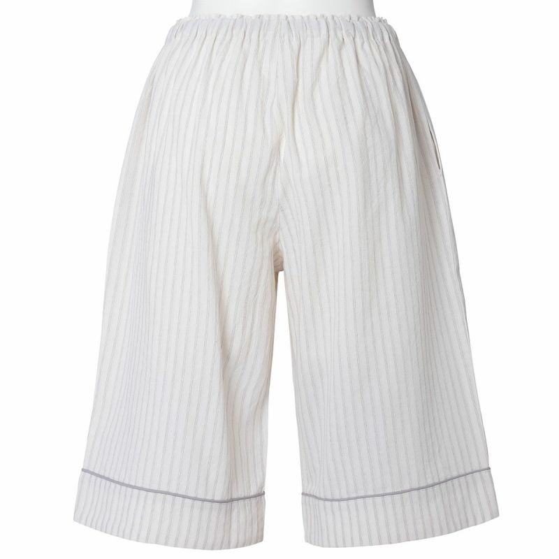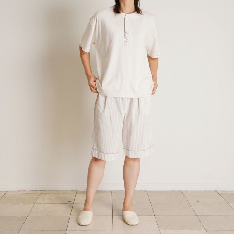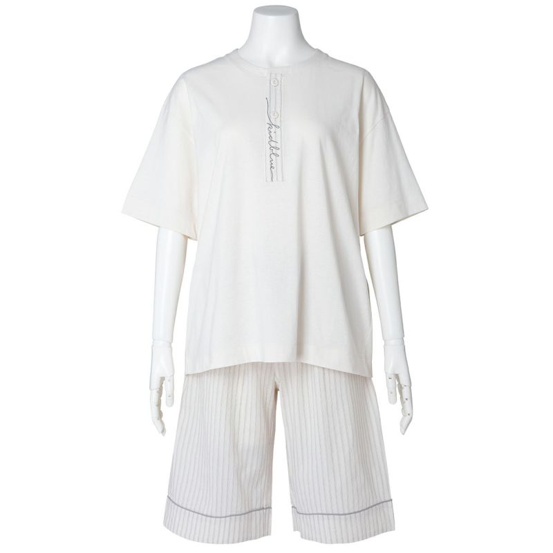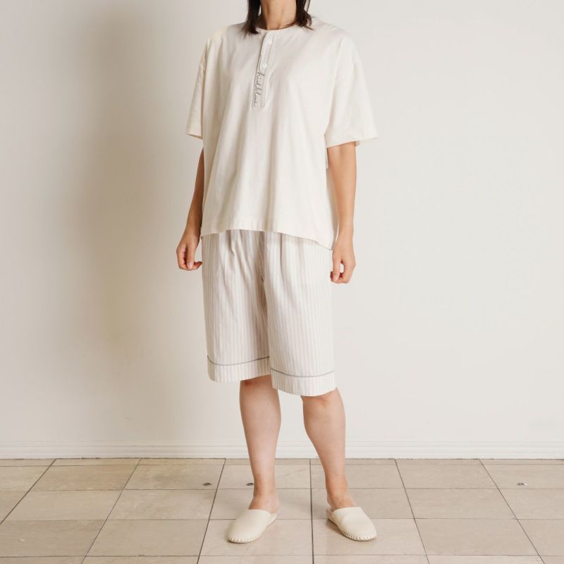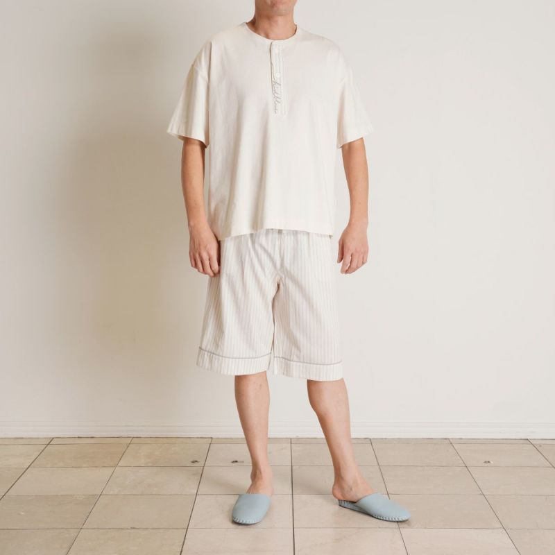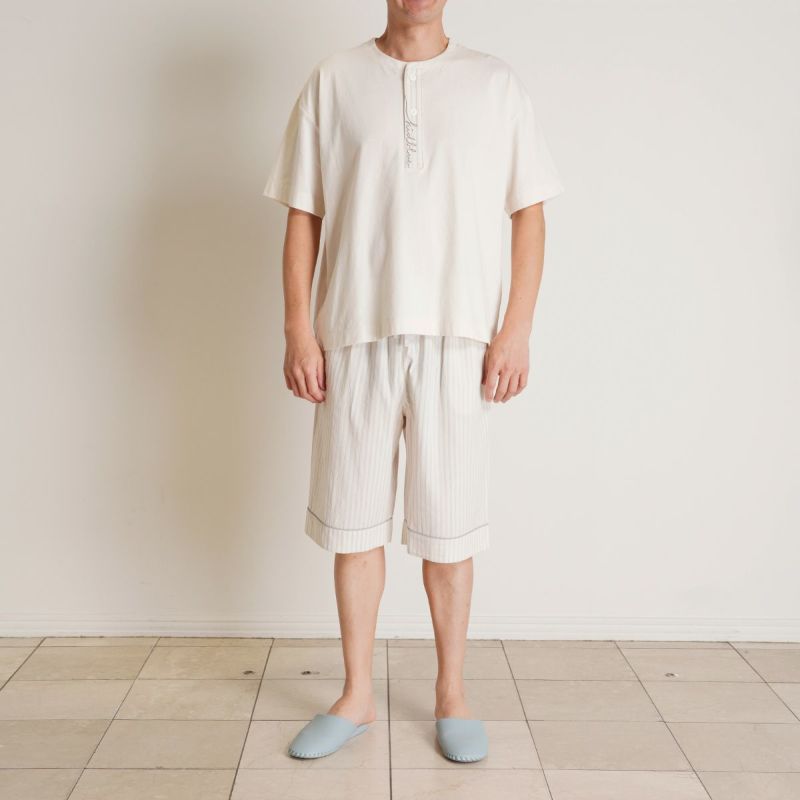 ユニセックスの5分袖パジャマ。かぶりトップスは柔らかく、着心地のよいカットソー。丁寧な首元の仕立てやロゴ刺しゅう入りの前立てがポイント。5分丈ボトムスはパイピングがアクセント。ペアギフトにもおすすめです。