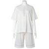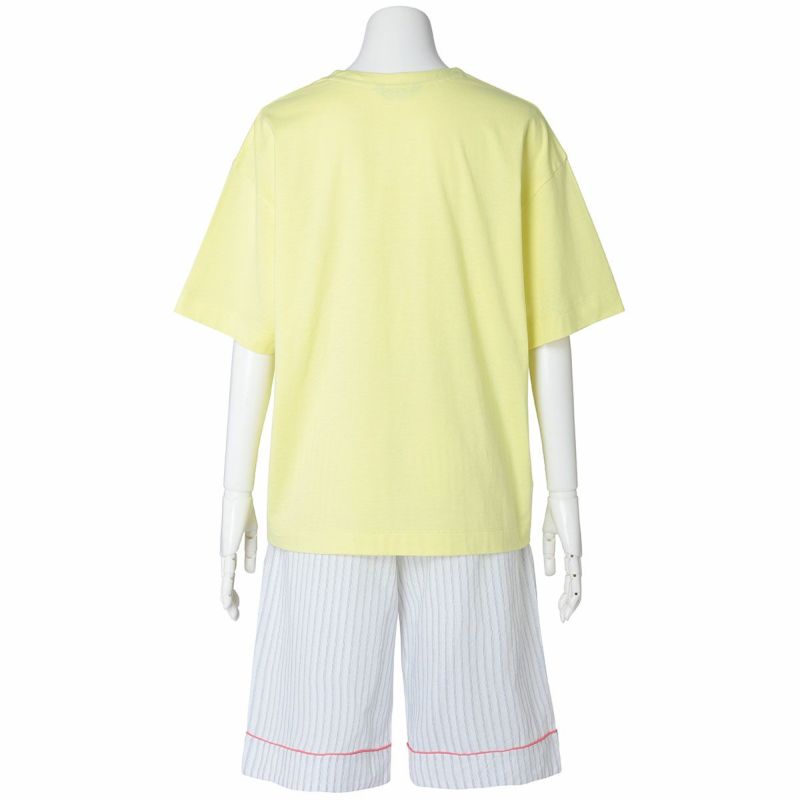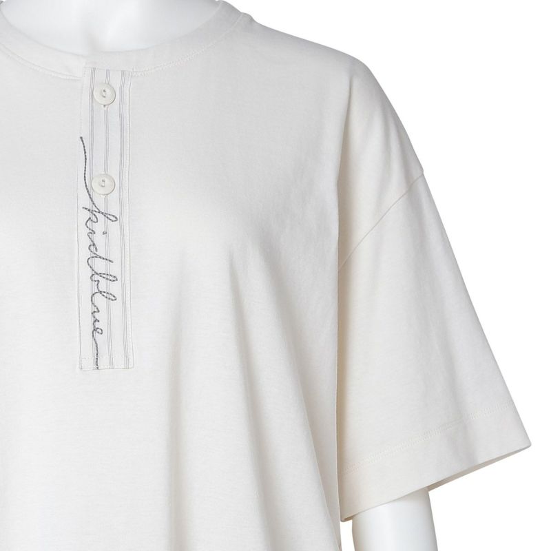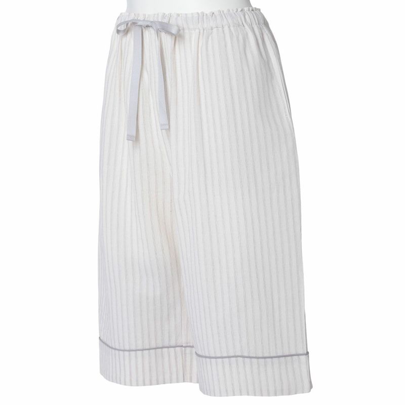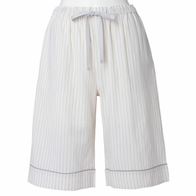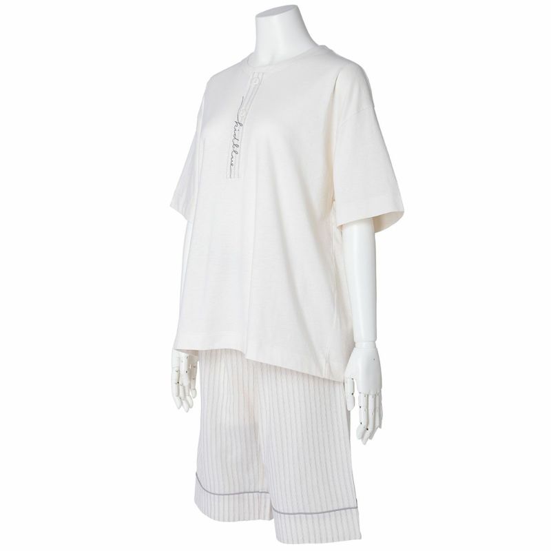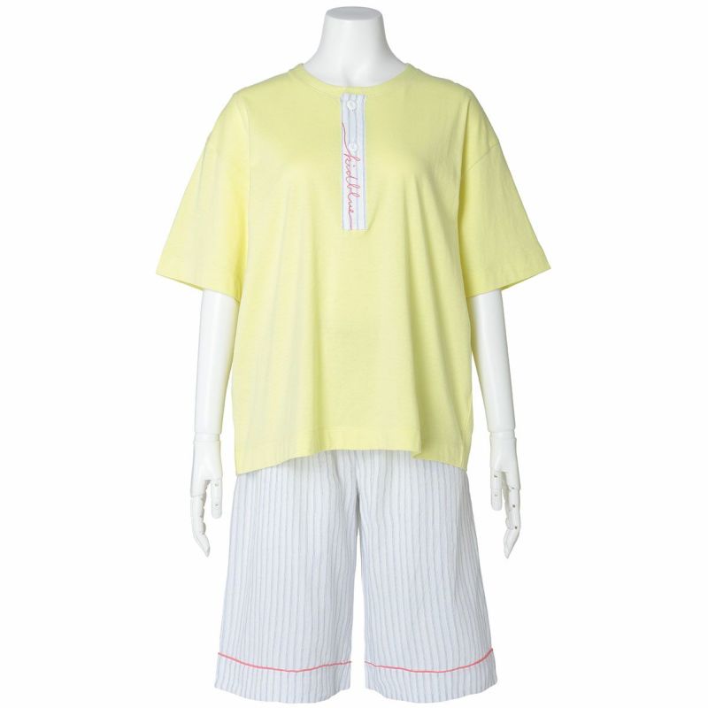 ユニセックスの5分袖パジャマ。かぶりトップスは柔らかく、着心地のよいカットソー。丁寧な首元の仕立てやロゴ刺しゅう入りの前立てがポイント。5分丈ボトムスはパイピングがアクセント。ペアギフトにもおすすめです。