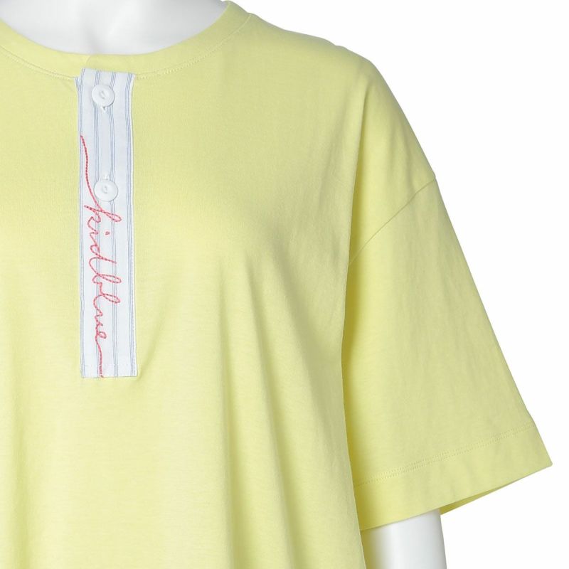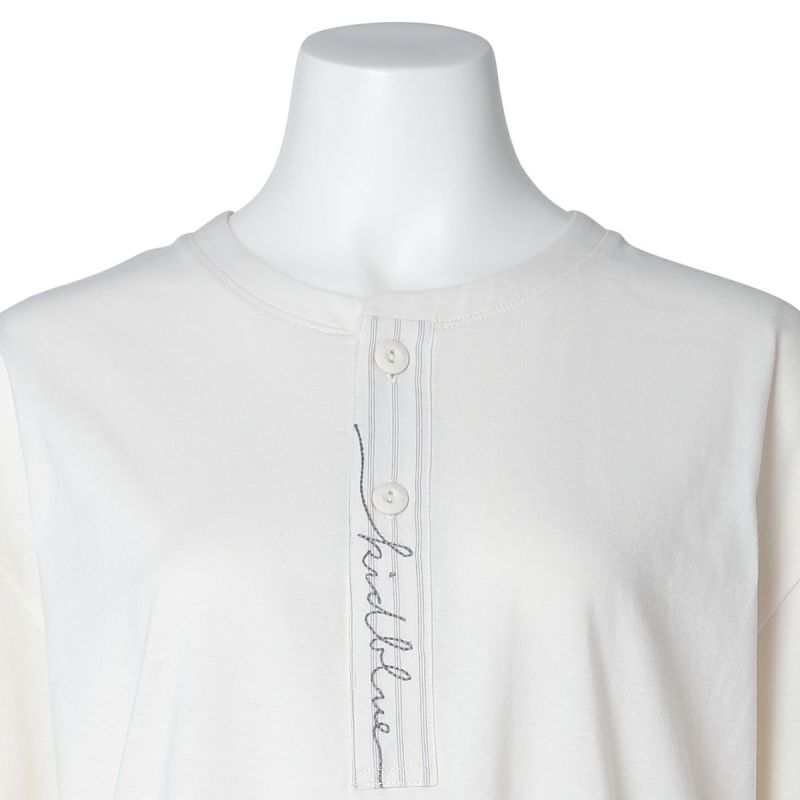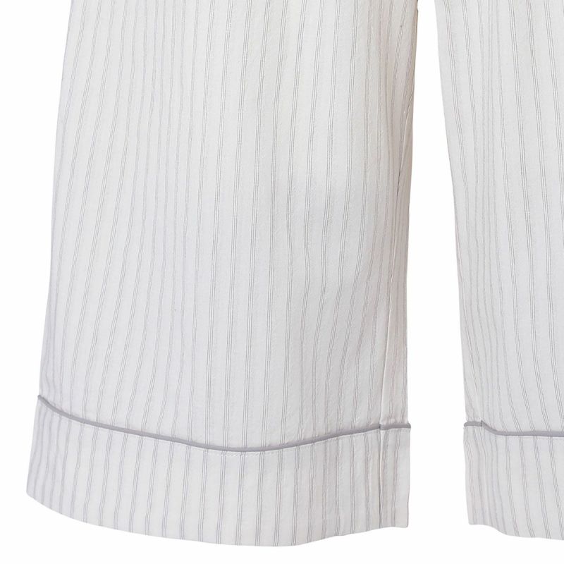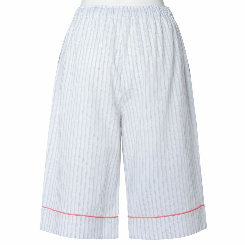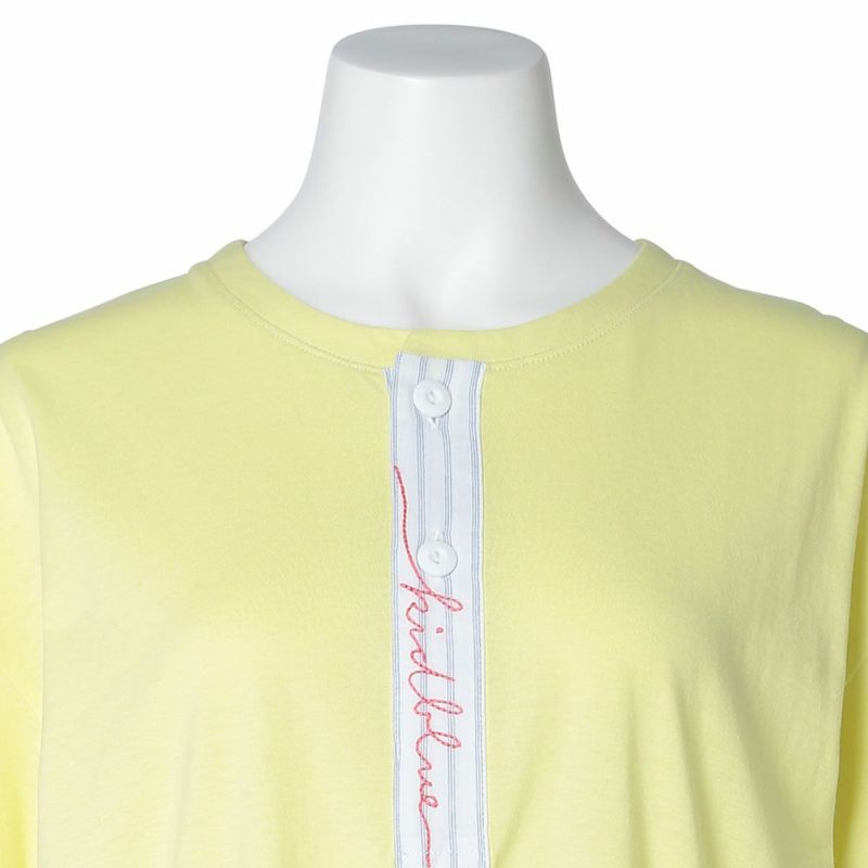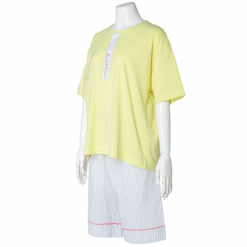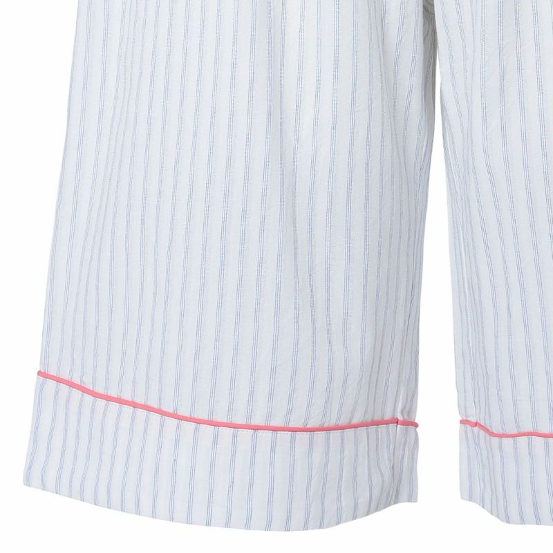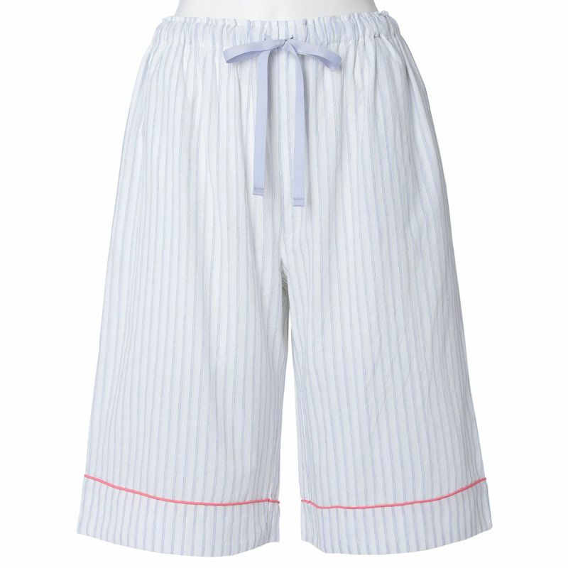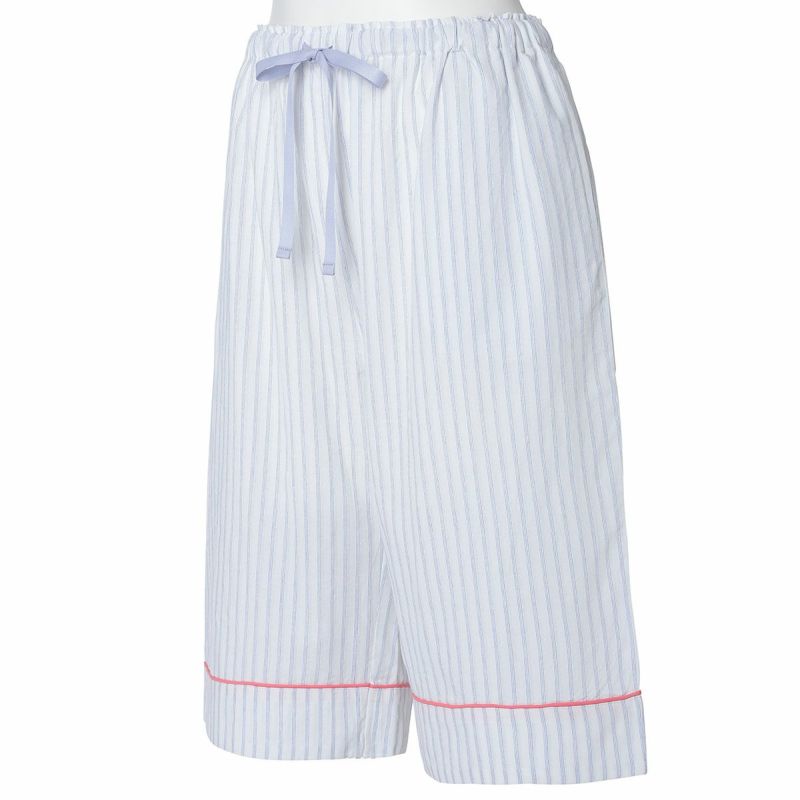 サッカー地のさりげない凹凸感のあるナイトウェアシリーズ。ストライプ方向にナチュラルな表情を生かした新素材。べたつかずさらっと着用できる。配色パイピングと配色ロゴ刺しゅうがデザインポイント◎