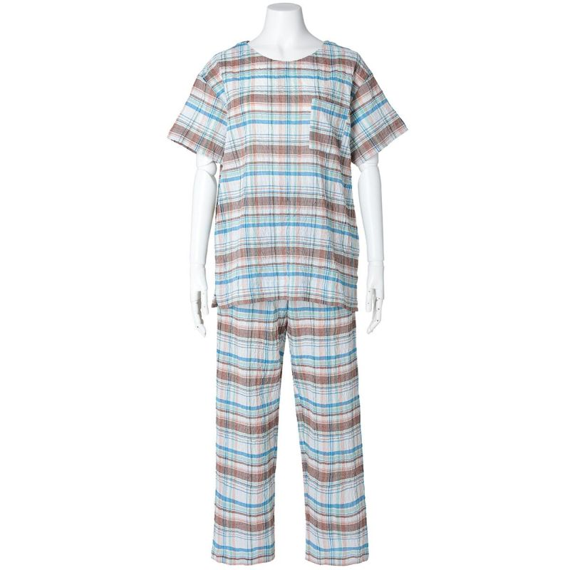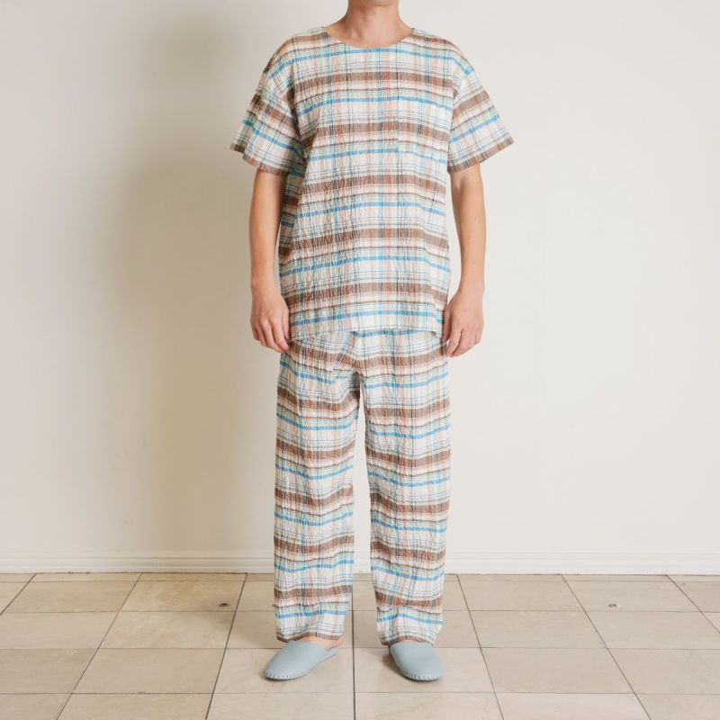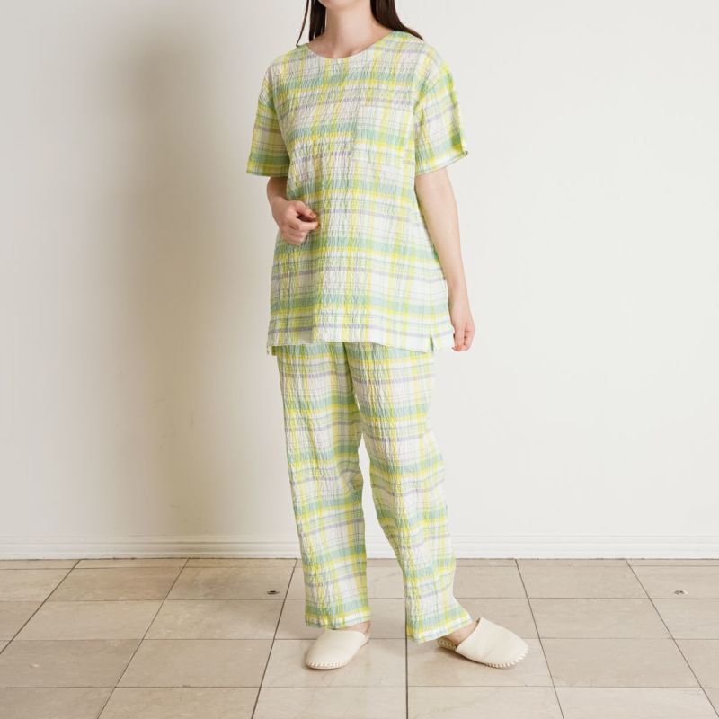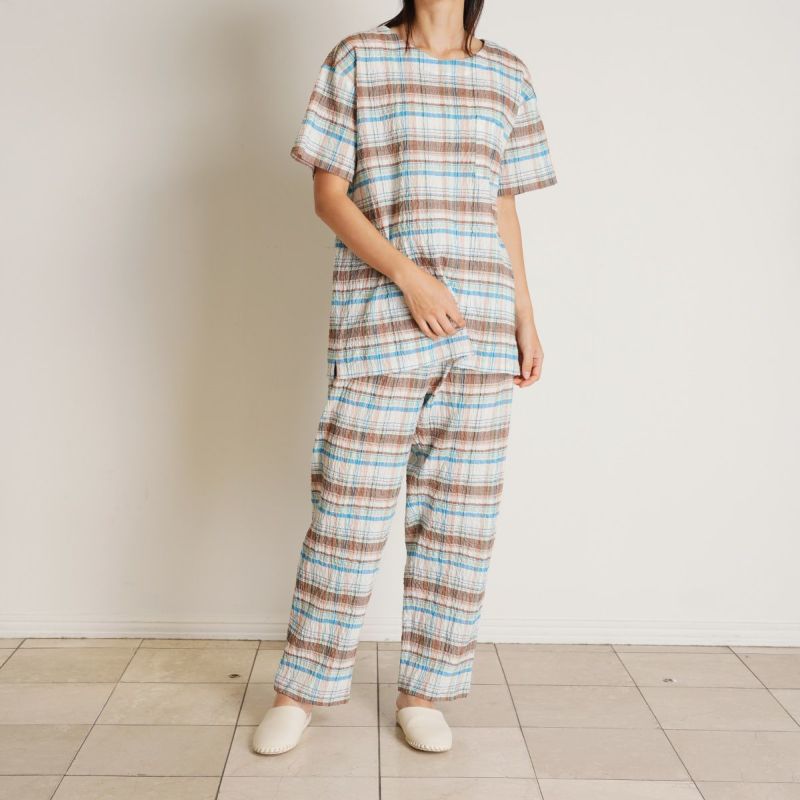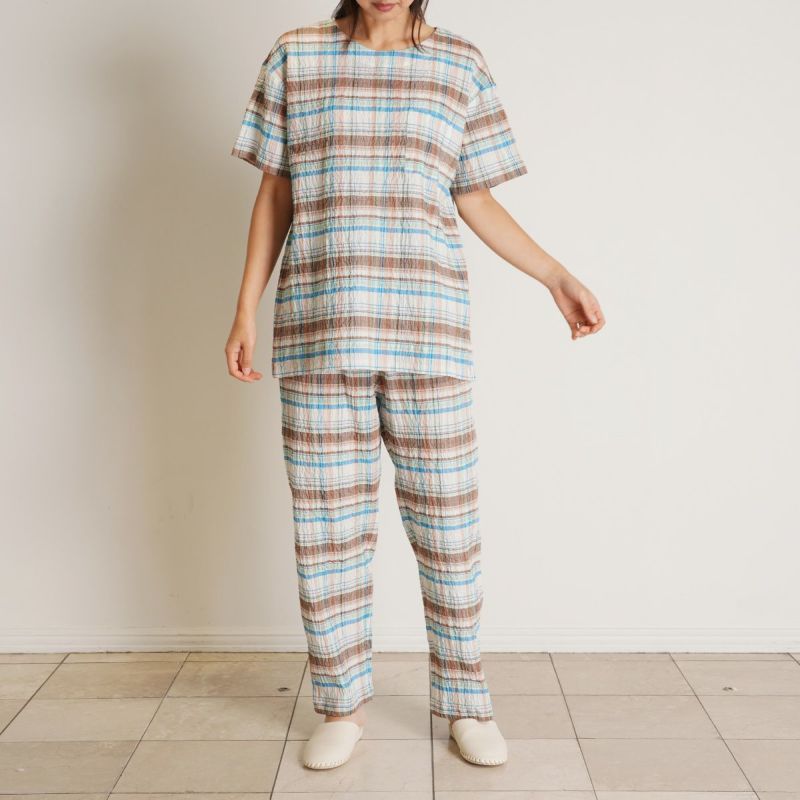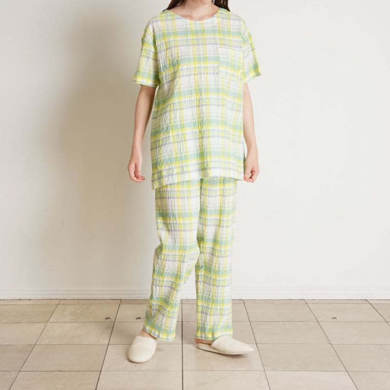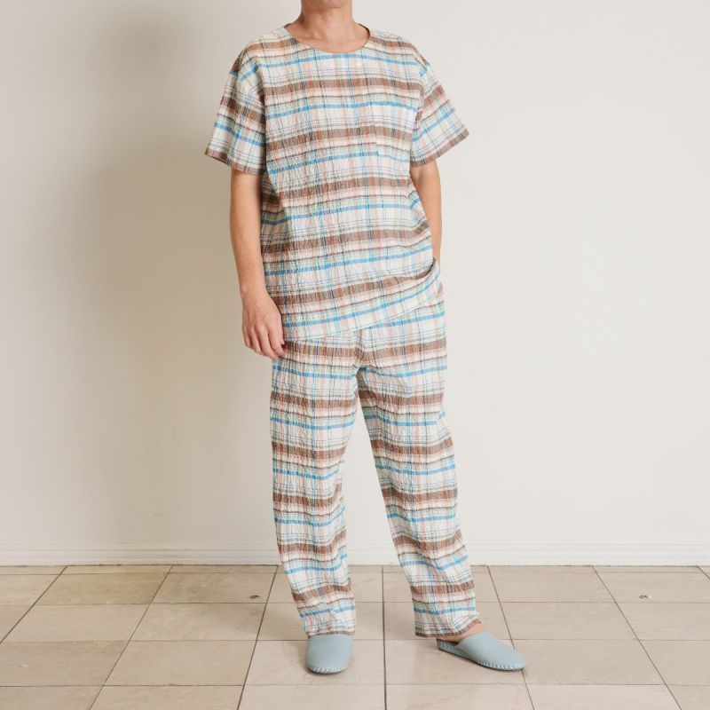 半袖パジャマは、すっきりしたラウンドネックでかぶりタイプのデザイン。パンツはストレートシルエット。ユニセックスなのでサイズ展開も幅広くお好みのサイズ感で選んだり、ペアコーディネートも楽しめます。ギフトにも◎