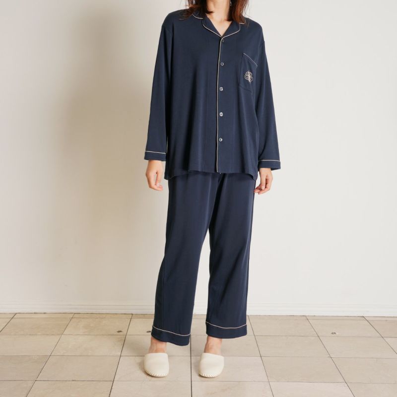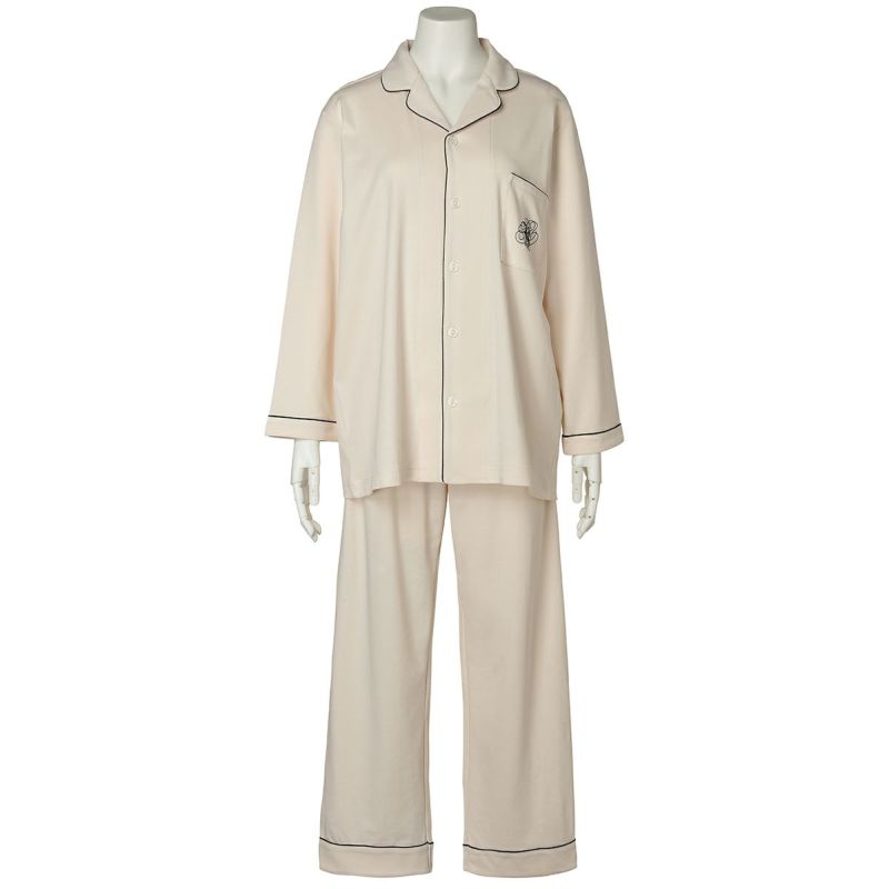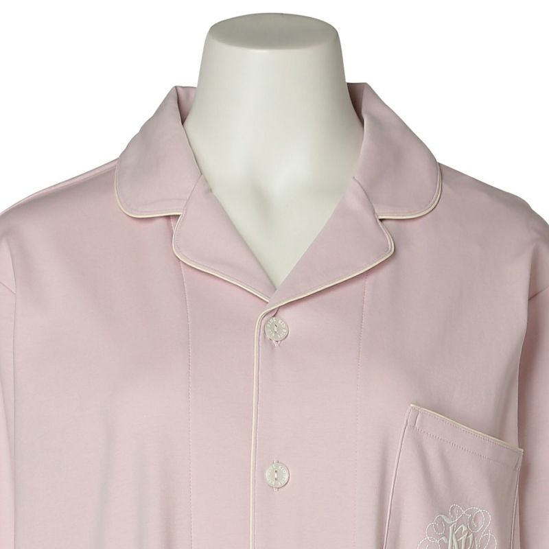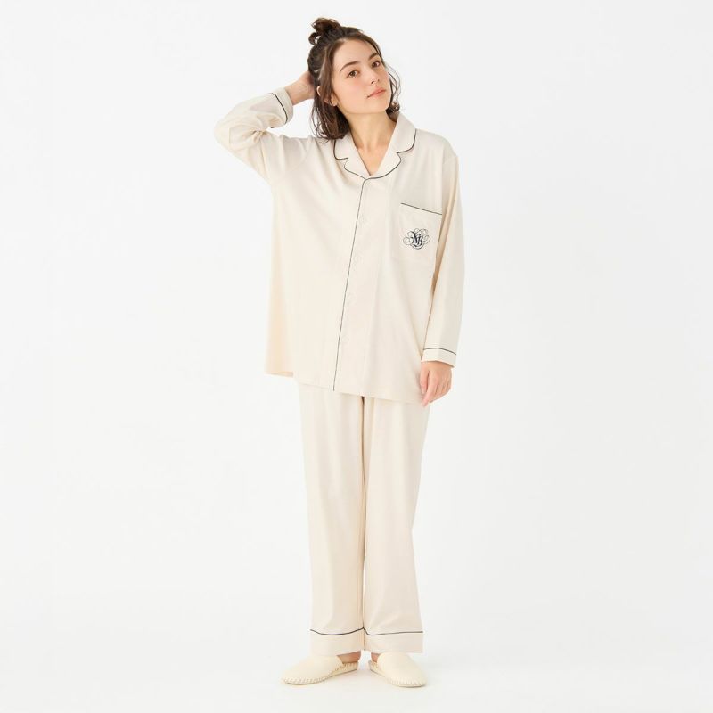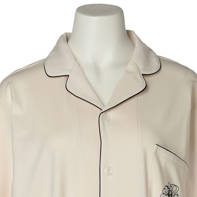 きめの細かい綿100%スムースを使用したグレイスフルコットンシリーズが、素材をブラッシュアップして登場!超長綿の糸を使用しているため、なめらかでしなやかな肌触り。程よい厚みでロングシーズン使いやすい。配色パイピングとロゴ刺しゅうがポイントのホテルパジャマ風デザイン。カラーは使いやすいアイボリー・ネイビーと優しい色合いで肌に映えるピンク。