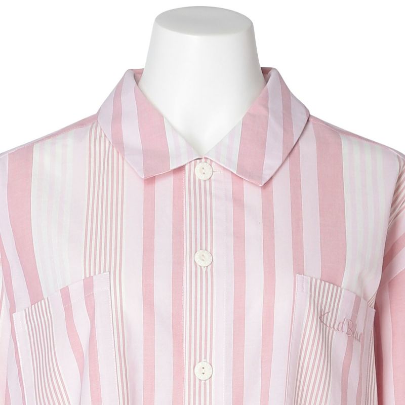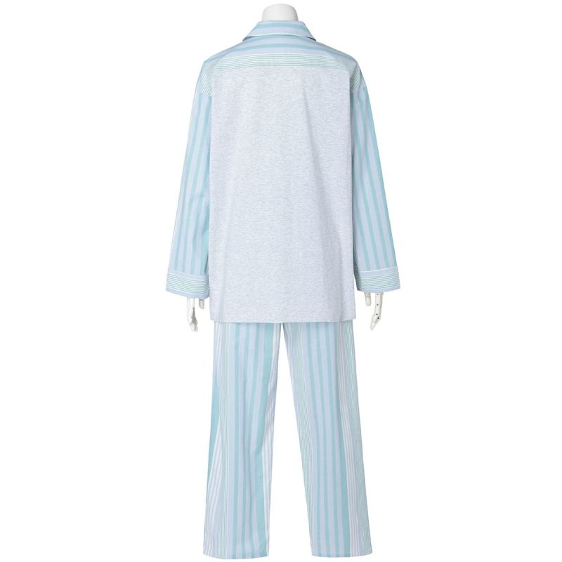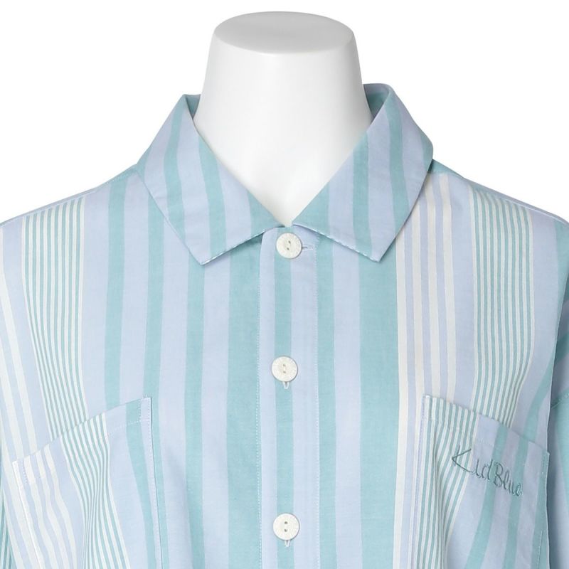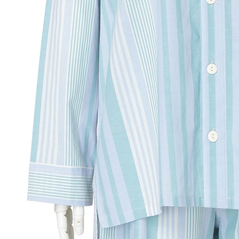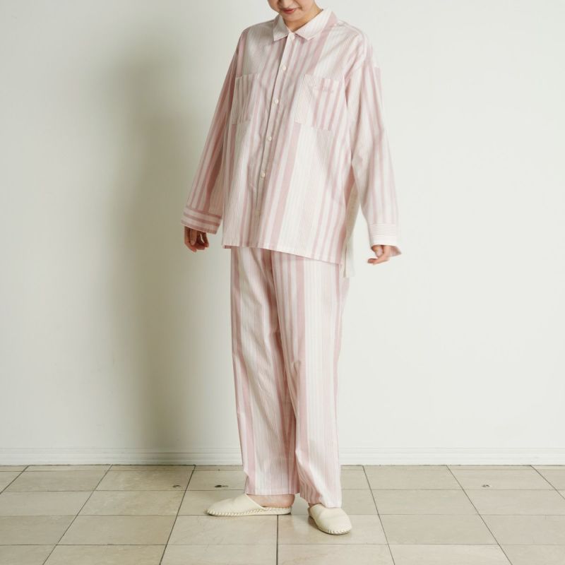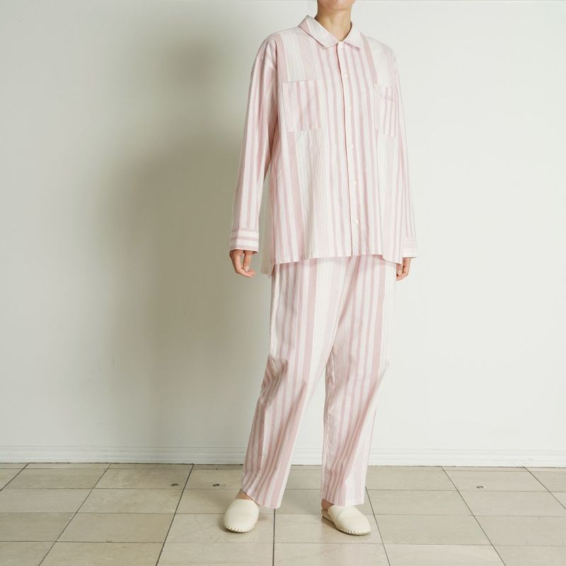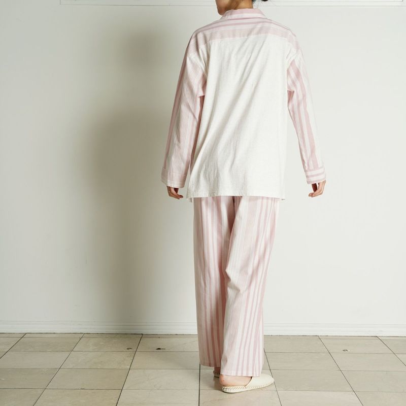 布帛のマルチストライプと杢カラーの天竺を組み合わせた、こだわりのナイトウエアシリーズ。天竺を組み合わせることで生まれる柔らかな肌触りと着心地のよさで快適に。安心の綿100%。落ち着いたパステルトーンで顔映りも明るくみせます。