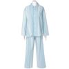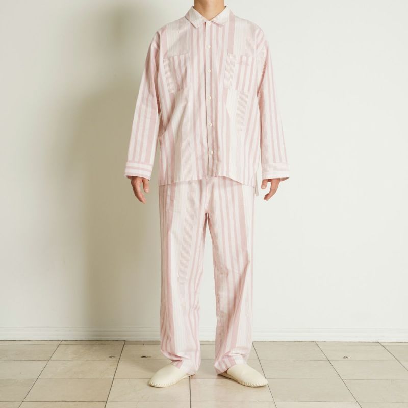 襟付きデザインのベーシックな長袖パジャマ。トップスはボックスシルエットのゆったりとした身幅。後身頃は天竺でリラックス感のある着心地。前後差をつけ裾に施したスリットによりバランスよく仕上げました。胸元のポケットにあしらったロゴ刺繍がデザインポイント。ボトムはウエストゴムにプラス紐付き。