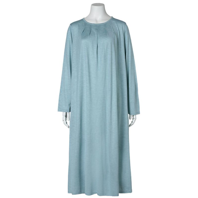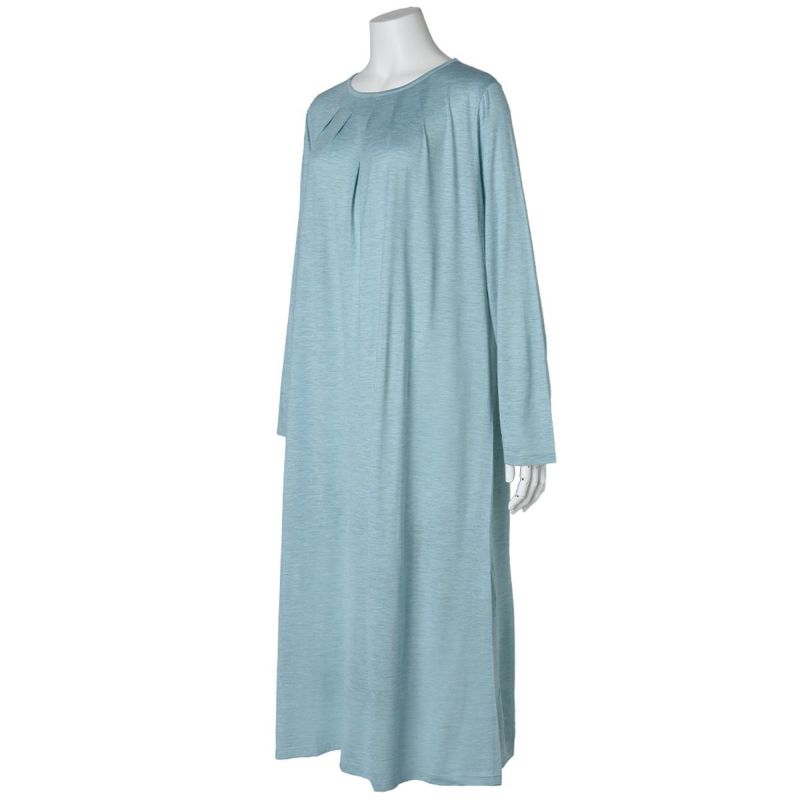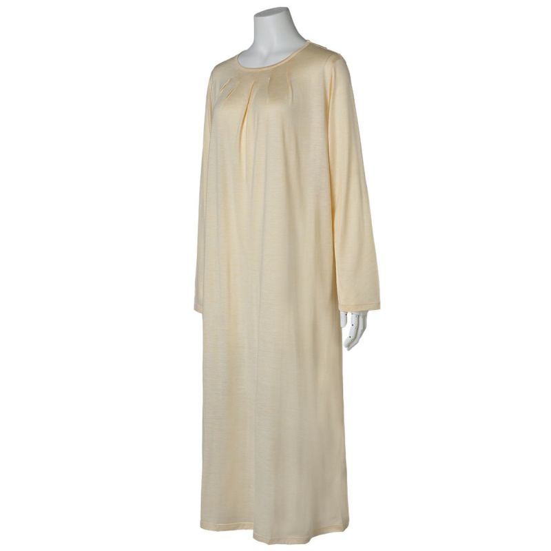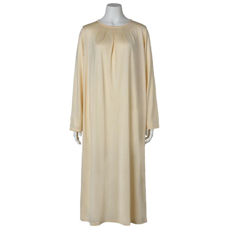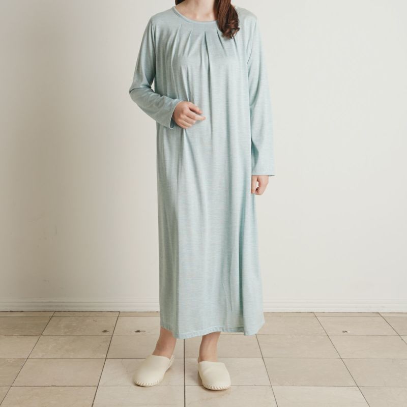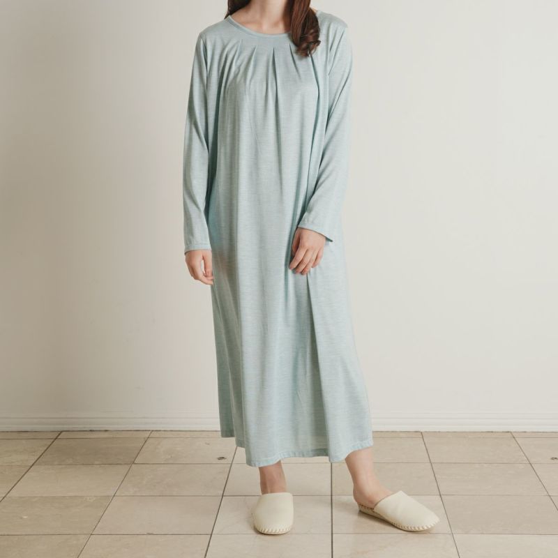 自然な落ち感があり、ストレスなく着ていただける長袖ナイティ。襟ぐりは開きすぎずつまりすぎない、ゆるやかなカーブライン。襟元の丁寧なタックがシンプルな中に上品さを感じさせます。