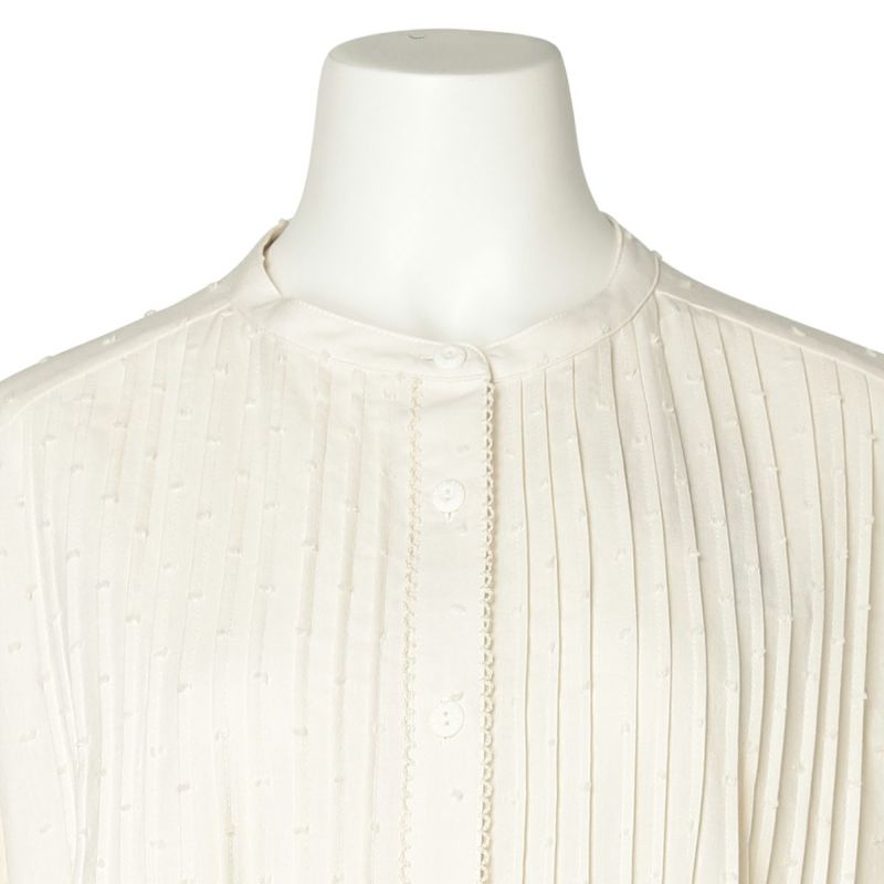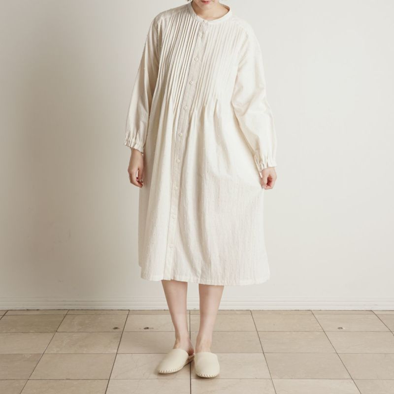 胸元に細かなピンタックを施し丁寧に仕上げました。前立てや袖のピコットがアクセント。袖はふわっとしたインゴムにしほどよい甘さをプラス。全開タイプなのでお部屋着の上からさらっと羽織ったり、リラクシングウェアとしての着用もおすすめ。裾には軽やかに見せるスリット入り。