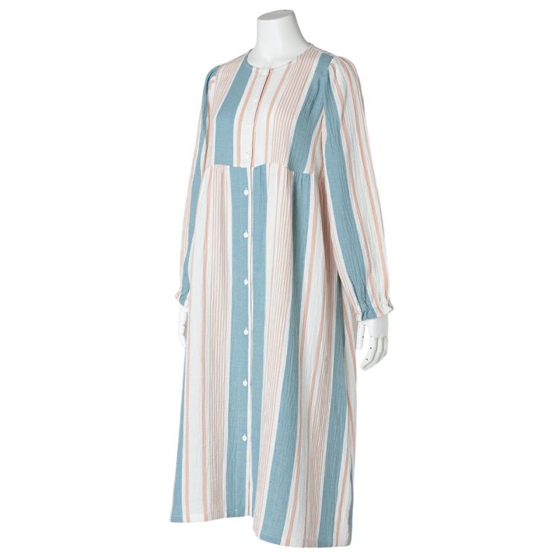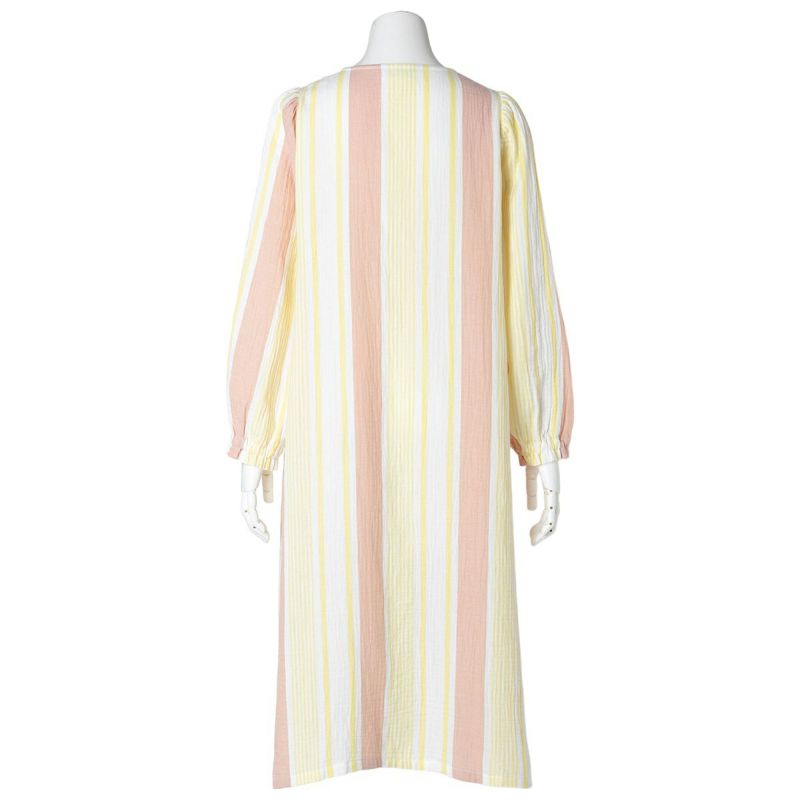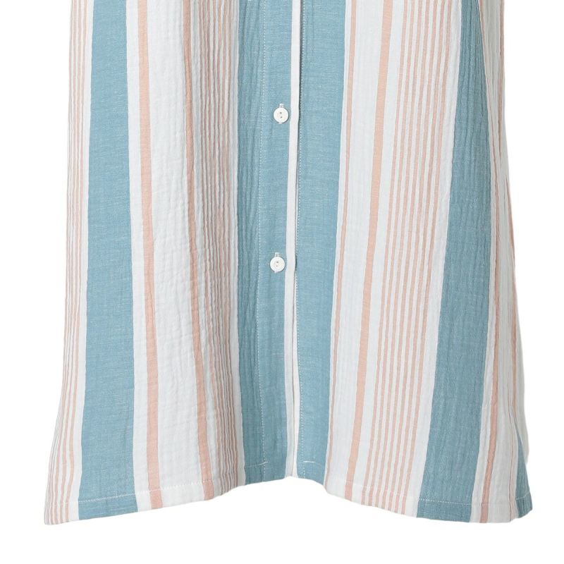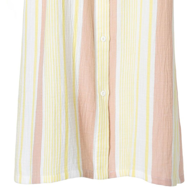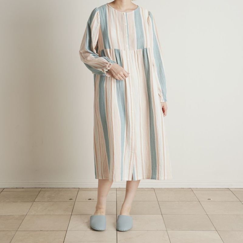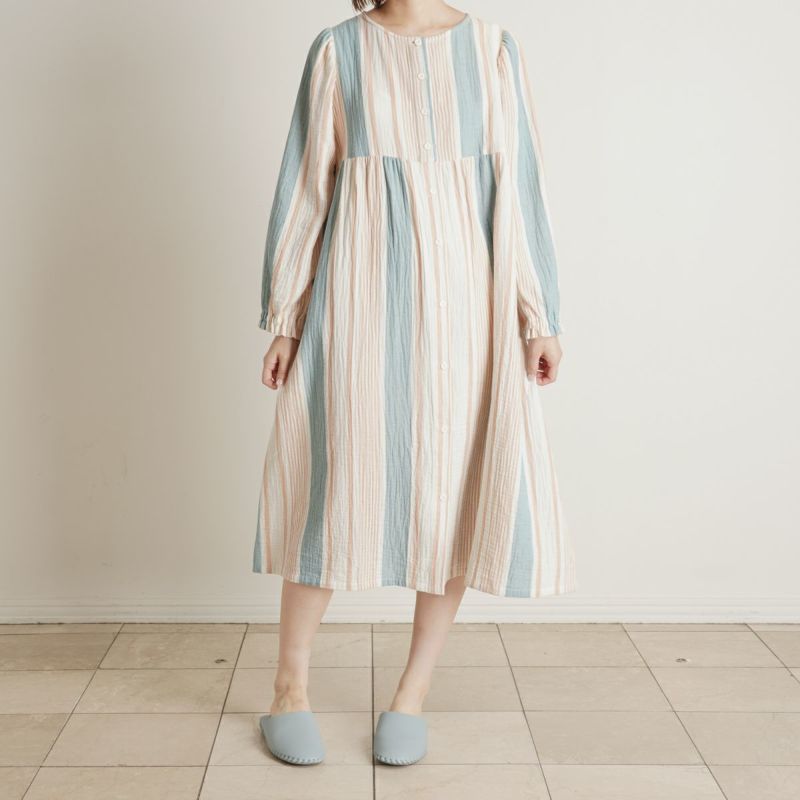 人気のWガーゼ素材のナイトウエアシリーズ。太いランダムなストライプがこなれた印象です。タテヨコで撚りの違う糸を使用することで生地の表面に凹凸を出し、通常のWガーゼより肌離れしやすく柔らかい生地感に仕上げ快適な着心地に。