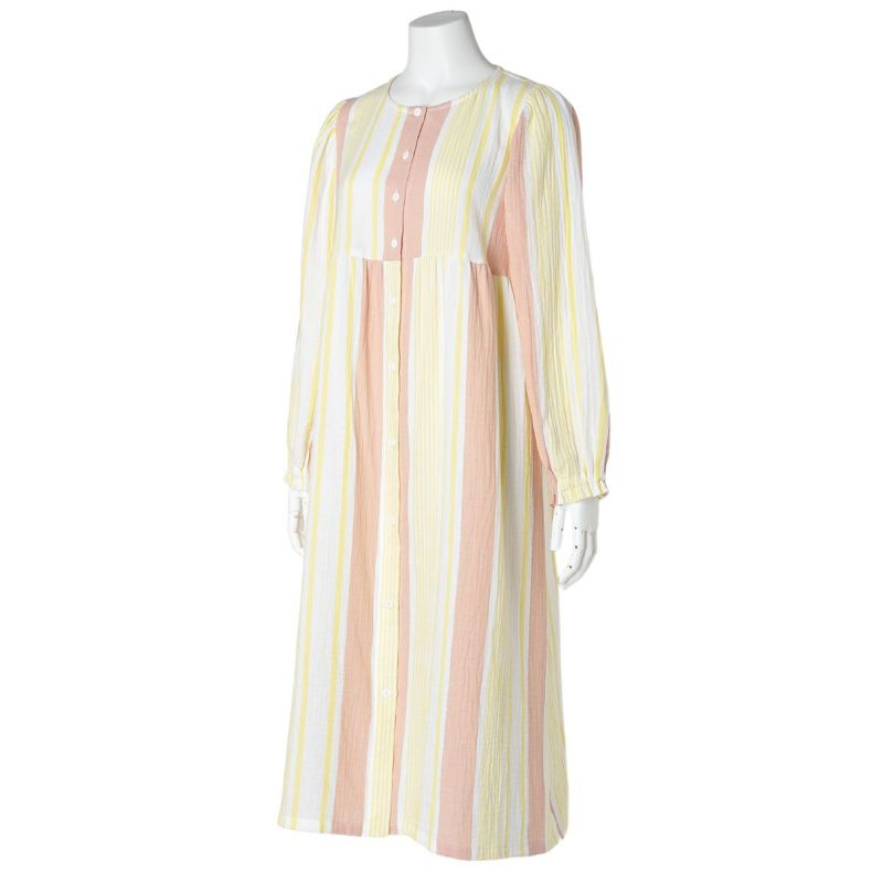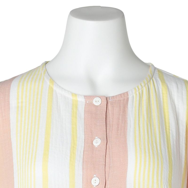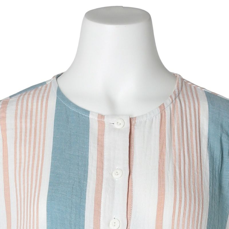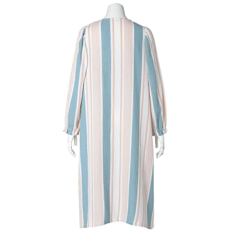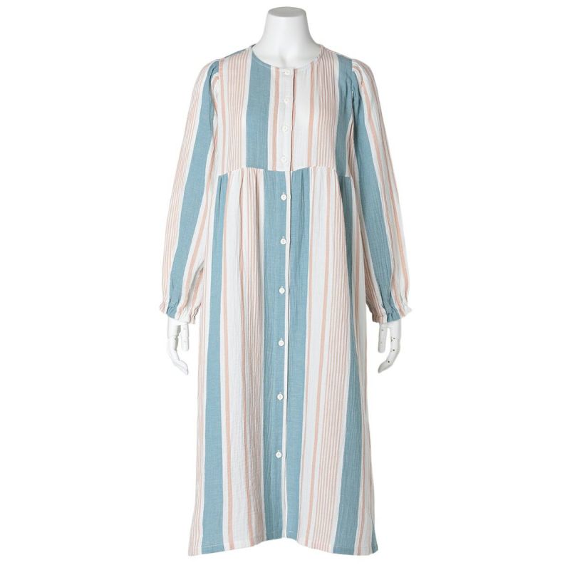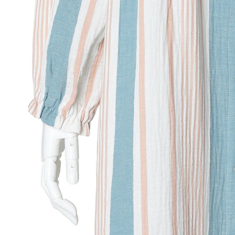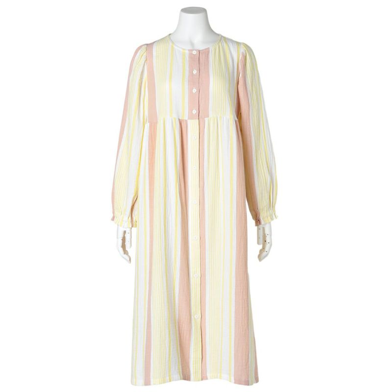 人気のWガーゼ素材のナイトウエアシリーズ。太いランダムなストライプがこなれた印象です。タテヨコで撚りの違う糸を使用することで生地の表面に凹凸を出し、通常のWガーゼより肌離れしやすく柔らかい生地感に仕上げ快適な着心地に。