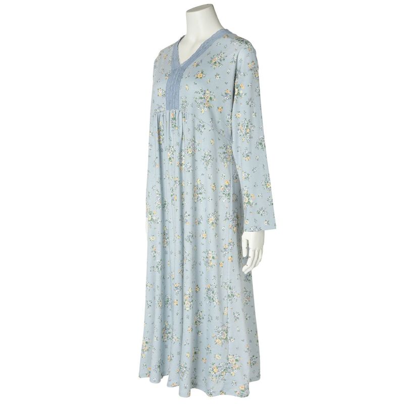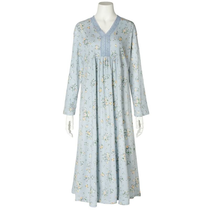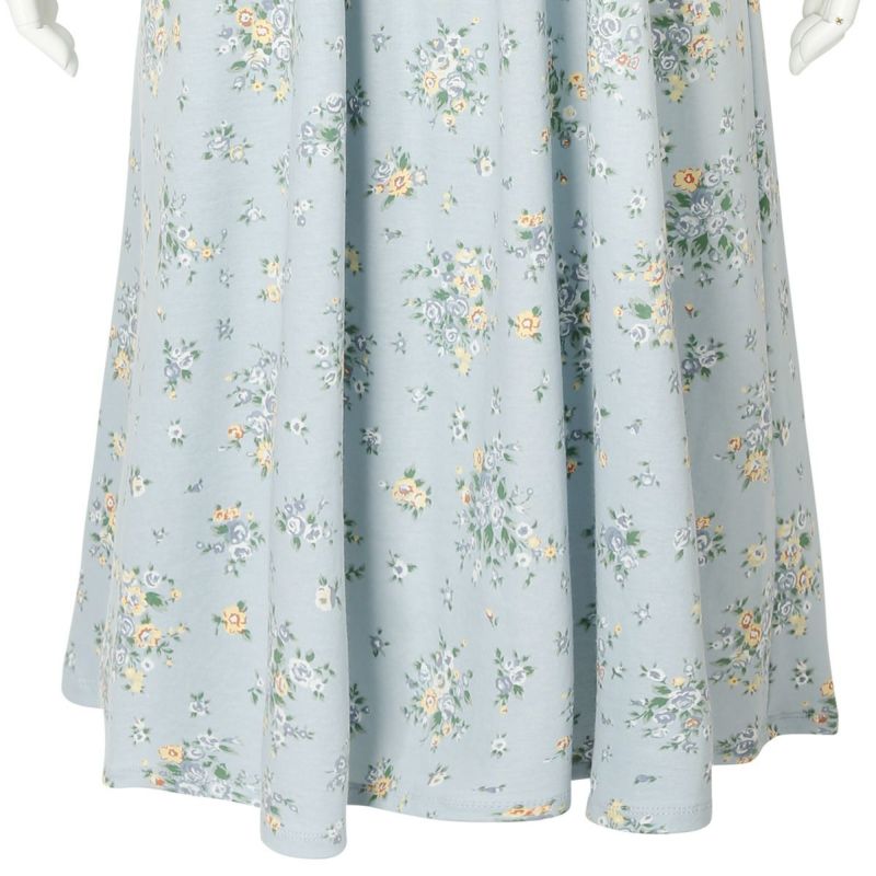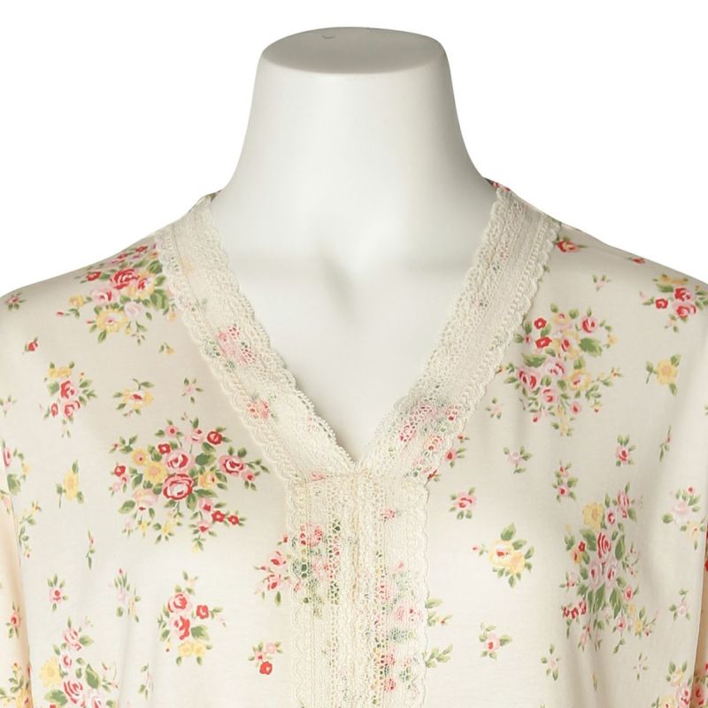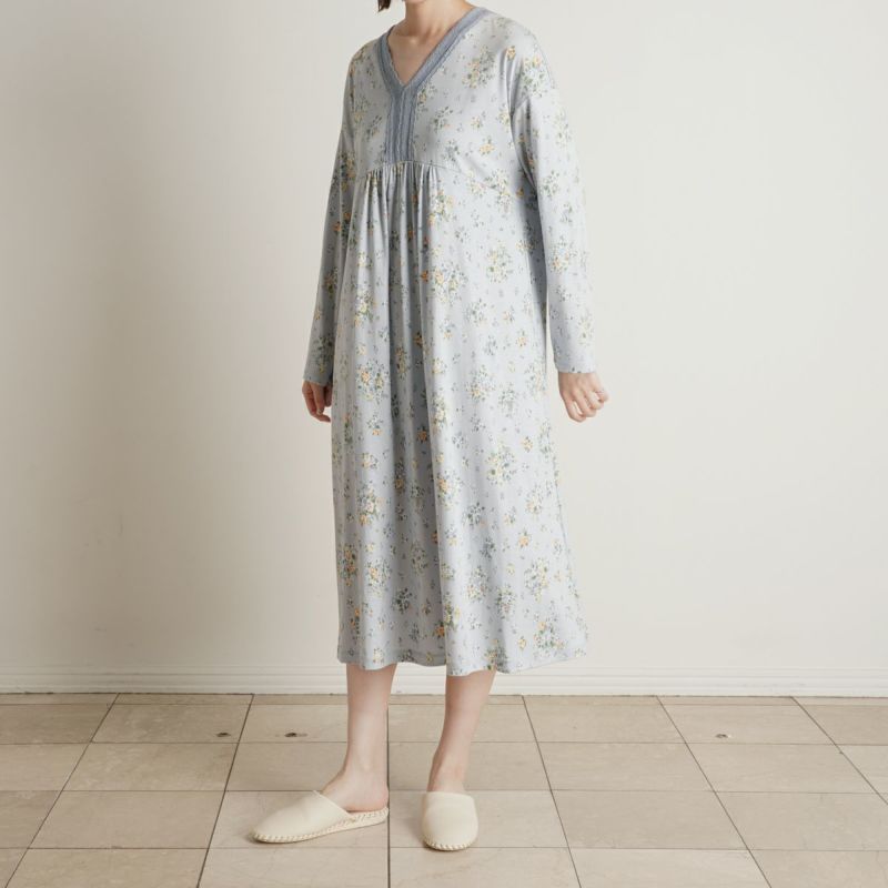 ワンピースタイプのナイトウェアは胸元に施されたレースと切り替えのギャザーでフェミニンに。ゆとりをもたせたドロップショルダー。