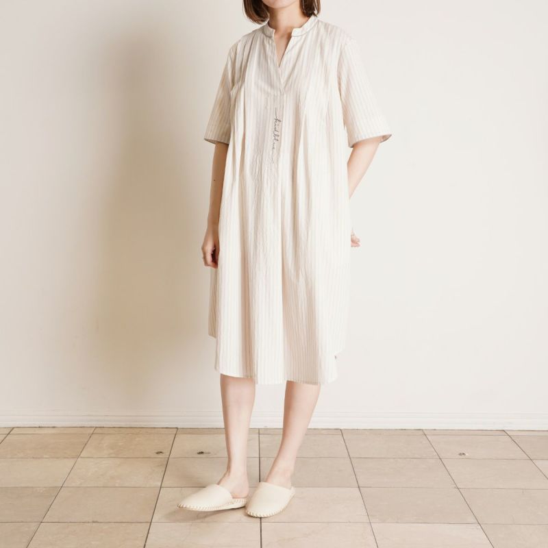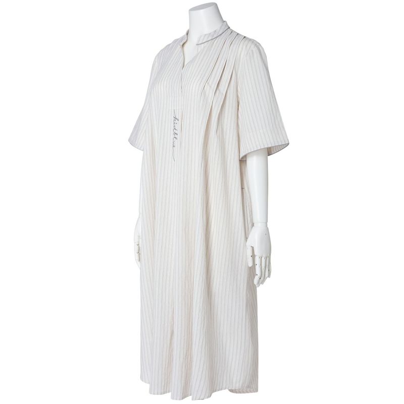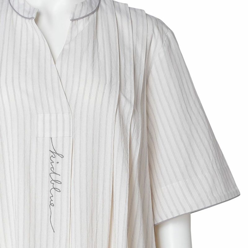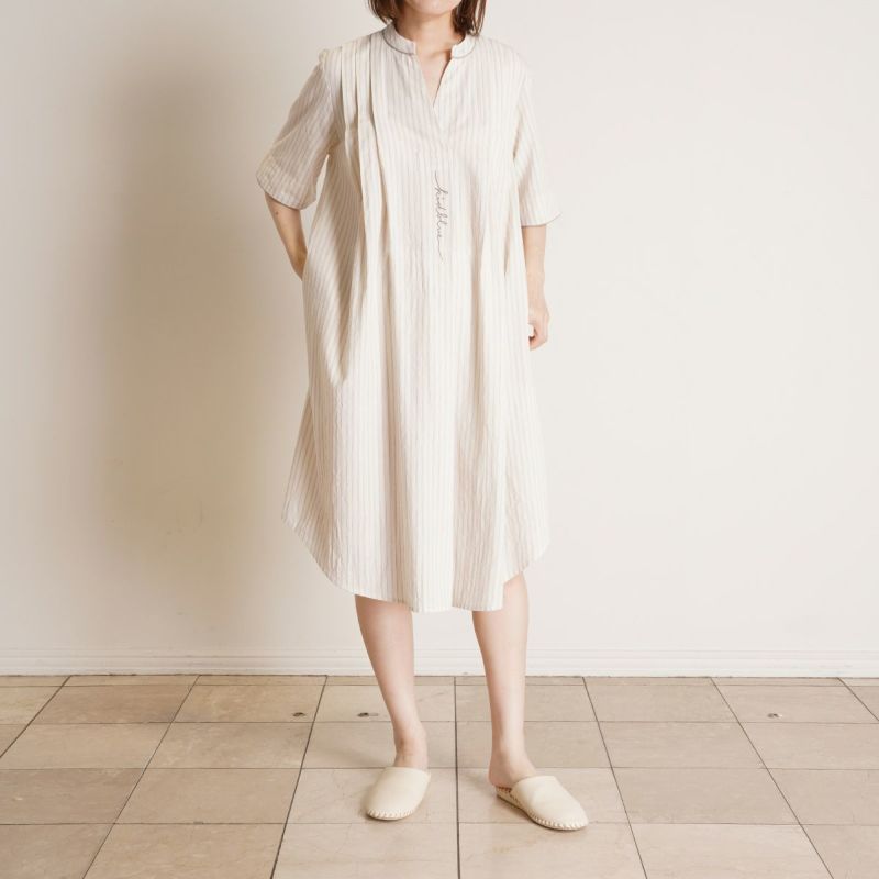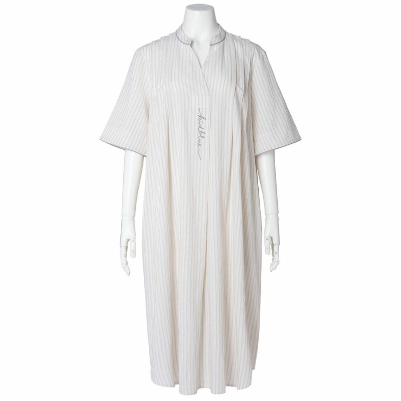 5分袖ナイティは、キーネックがすっきり見えるワンピースデザイン。肩のタックやパイピングがカジュアルな素材ながらも品よく見せます。パイピングやロゴ刺しゅうがアクセントになり、シンプルながらも洗練された印象に。下にスパッツやレギンスを合わせて、部屋着やワンマイルウェアとしての着用もおすすめです。
