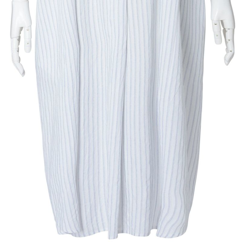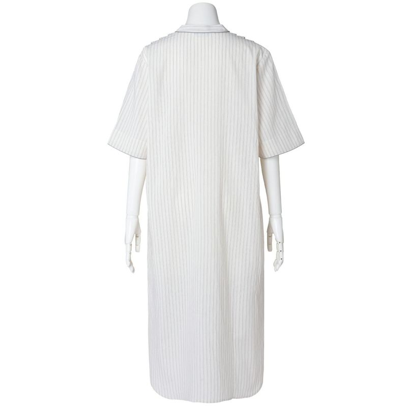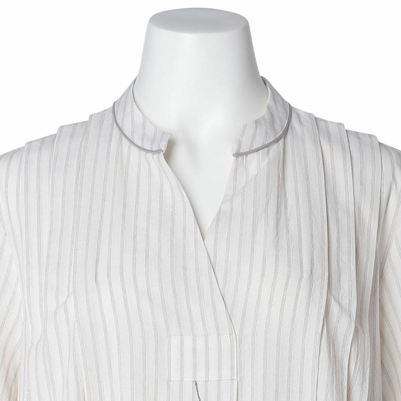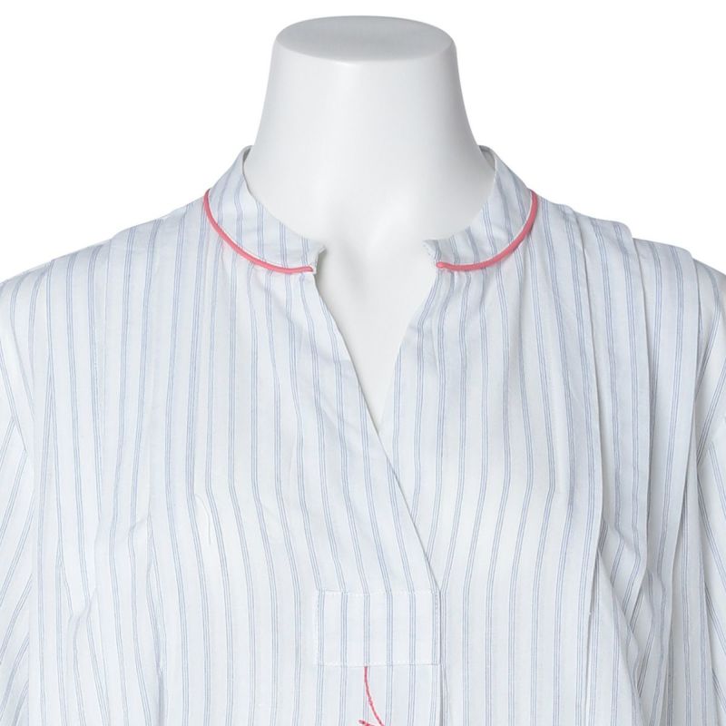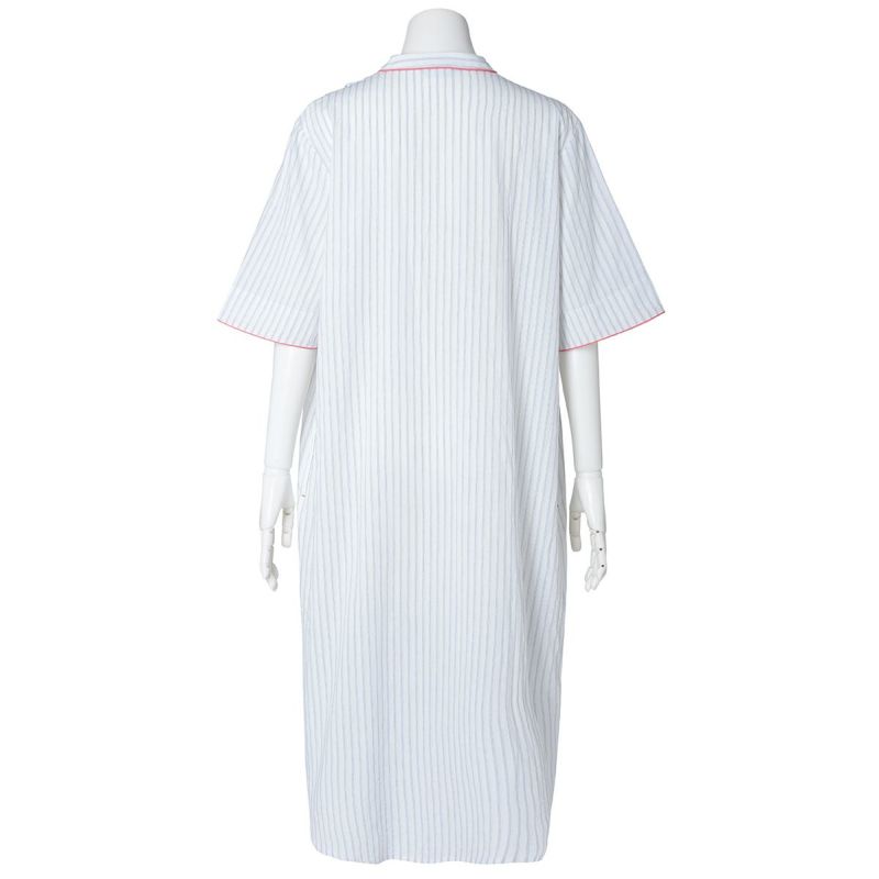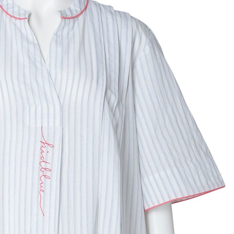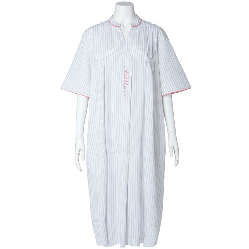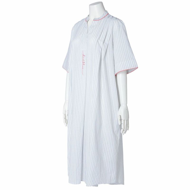 サッカー地のさりげない凹凸感のあるナイトウェアシリーズ。ストライプ方向にナチュラルな表情を生かした新素材。べたつかずさらっと着用できる。配色パイピングと配色ロゴ刺しゅうがデザインポイント◎