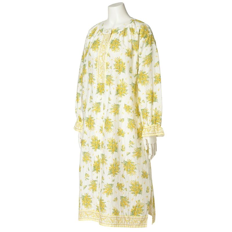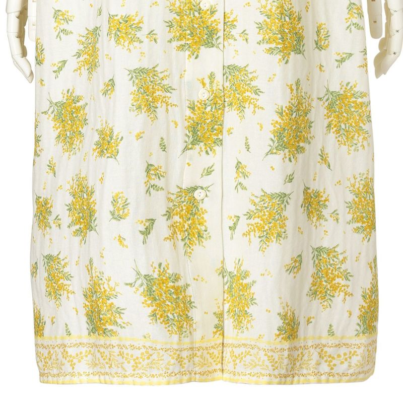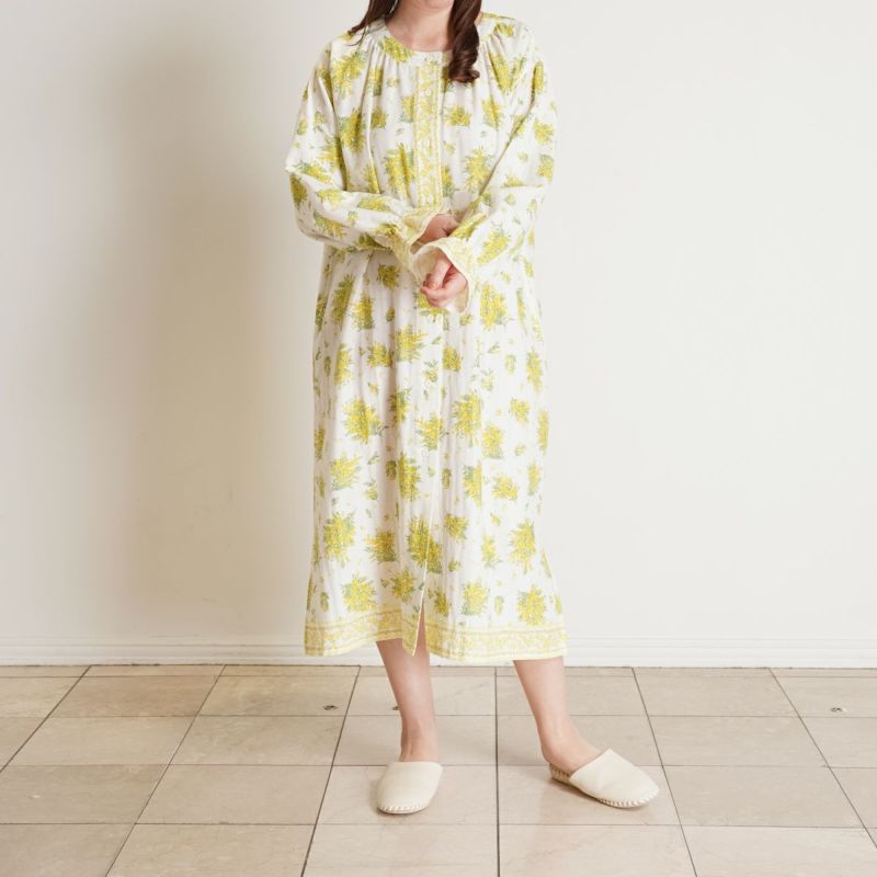 ミモザ柄が明るく華やかなナイトウエアが登場。綿100%のWガーゼ素材でより柔らかな印象に仕上げました。ミモザ柄をパネル状にプリントし、別柄で縁模様をライン状にあしらったこだわりの素材を使用。ミモザのイエローを活かしたアイボリーと爽やかなサックスカラーの2色展開。
