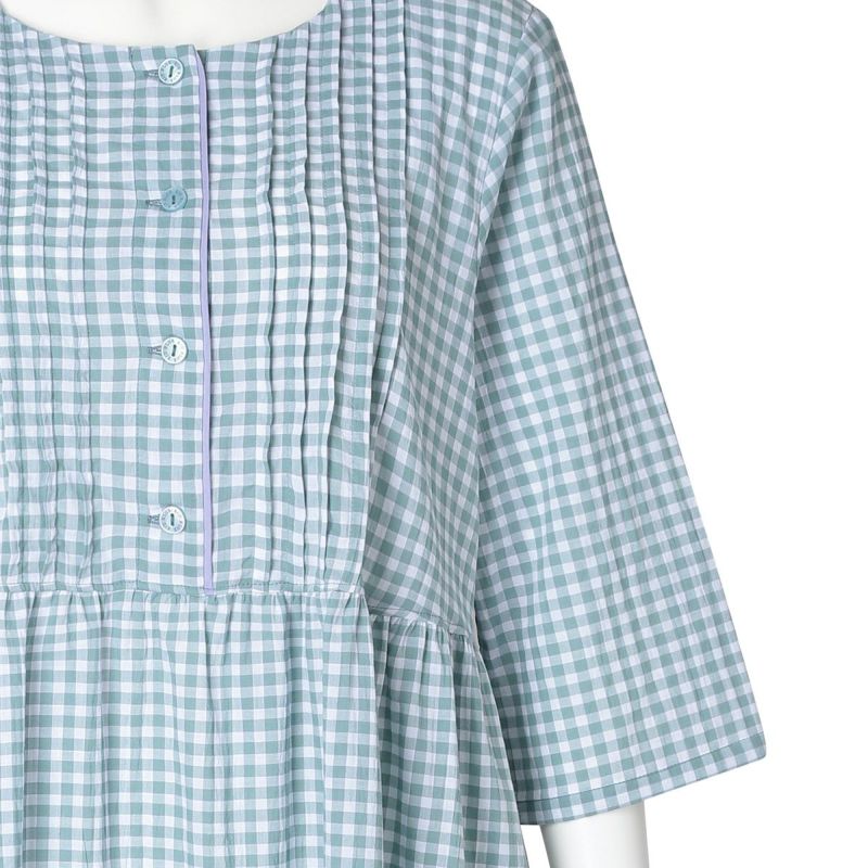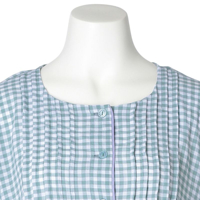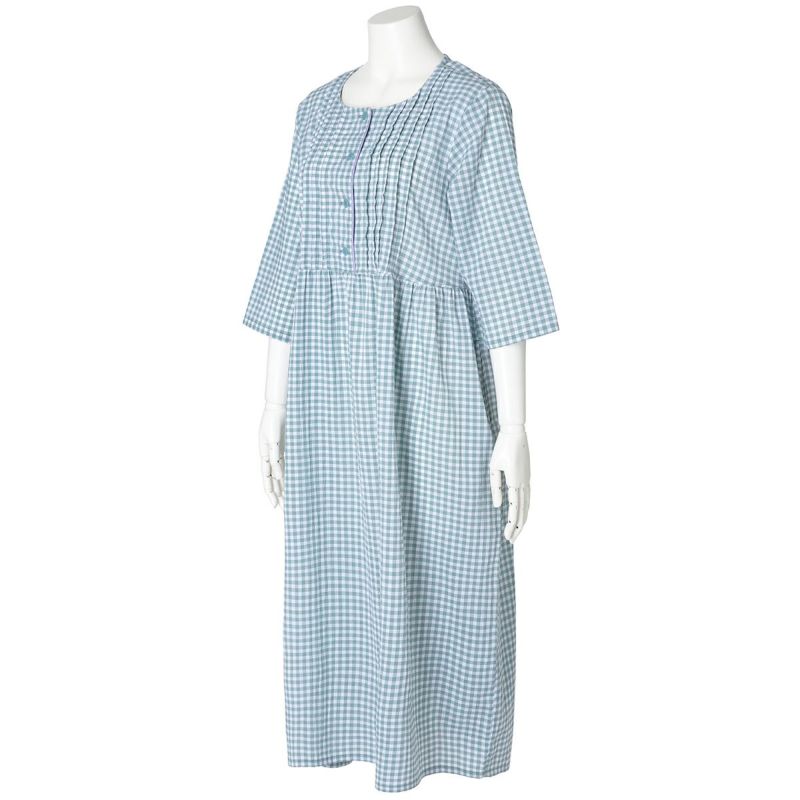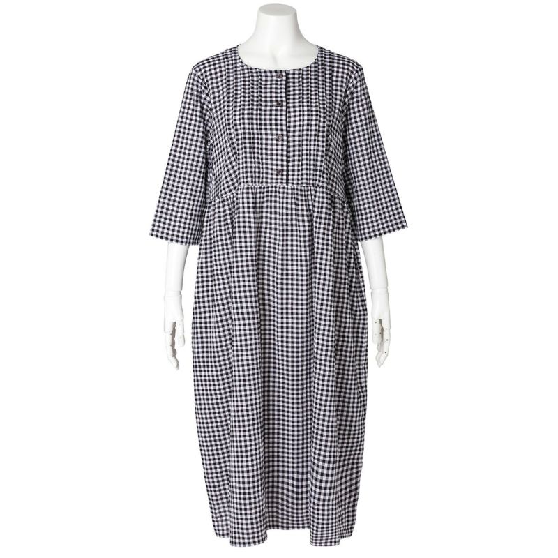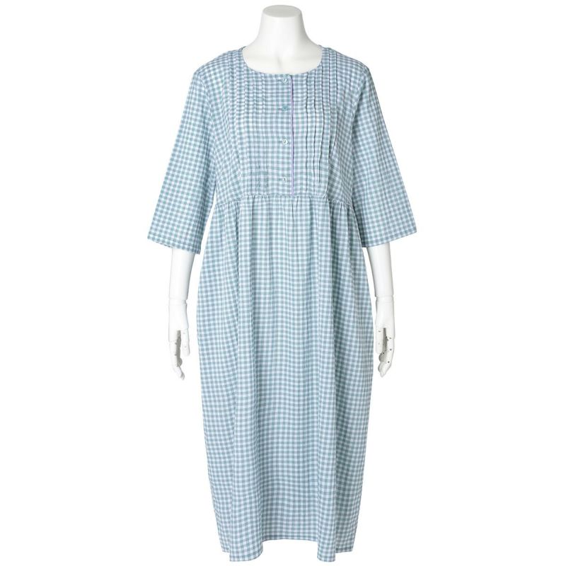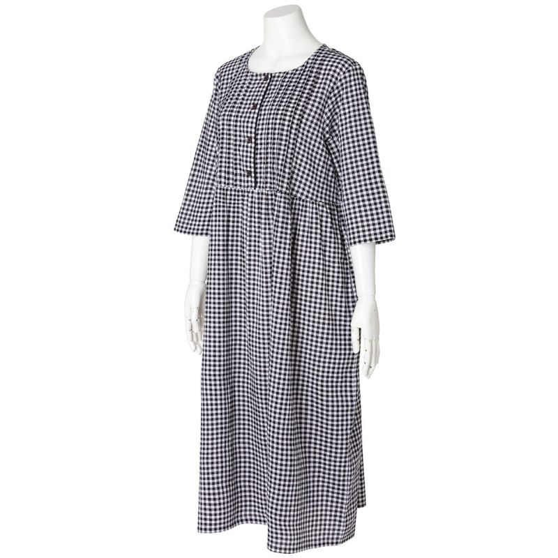 7分袖ナイティは、胸元に立体感のあるピンタックを施し丁寧に仕上げました。チェックの中から1色取った前立ての配色パイピングですっきり上品な印象に。ウエスト切り替えでふんわりと広がるシルエットがかわいい。ゆったりした身幅で快適な着心地。リラクシングウエアとしてもおすすめ。両サイド便利なポケット付き。
