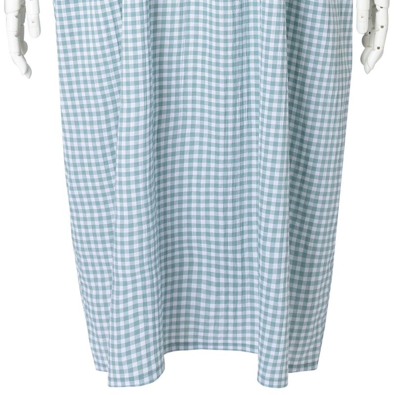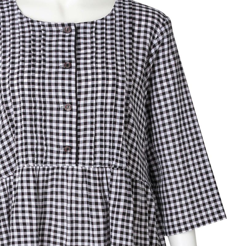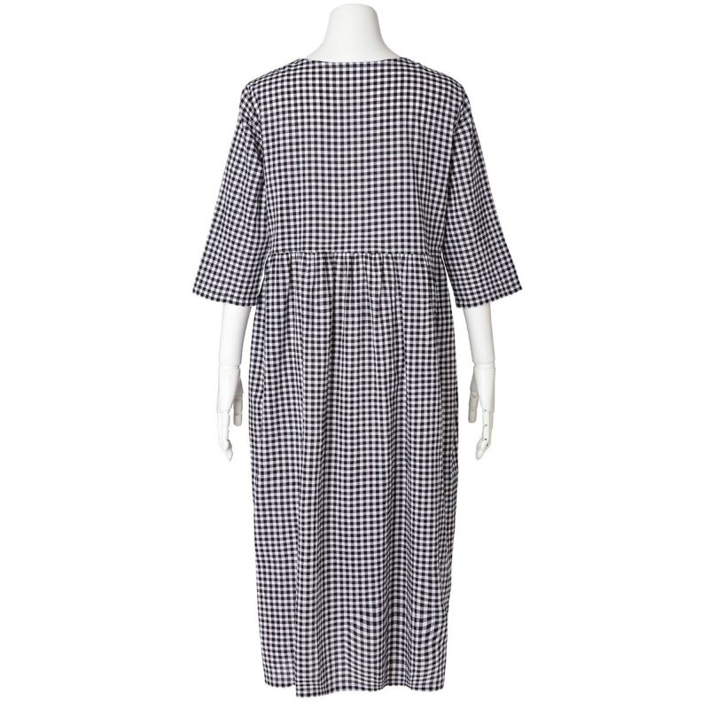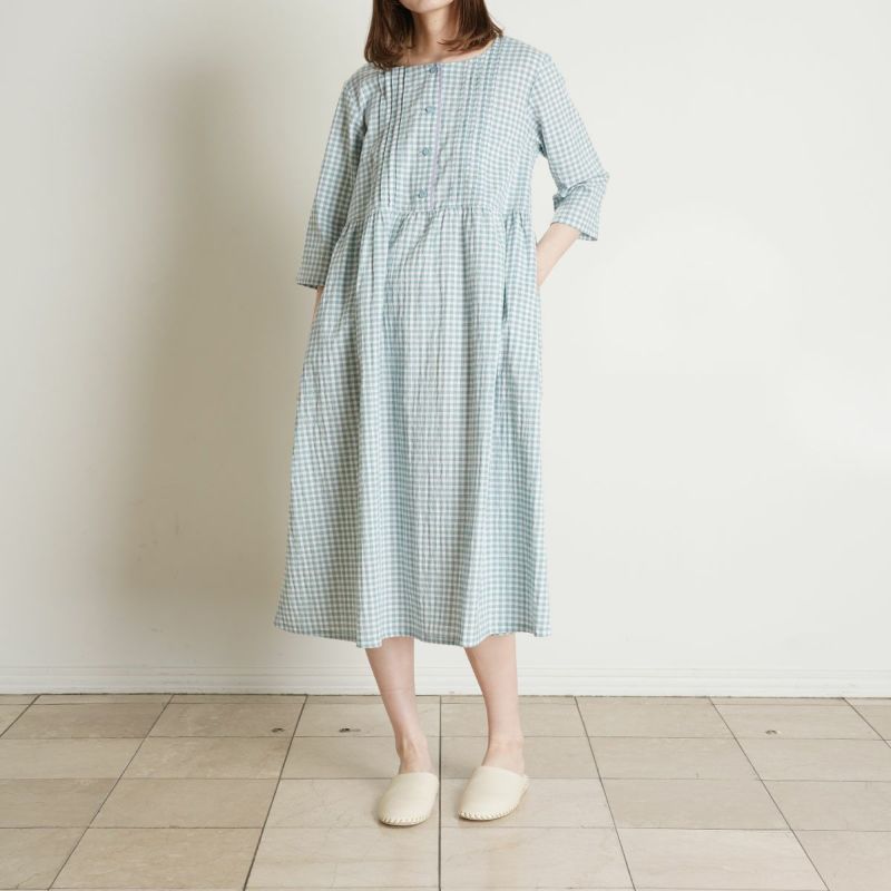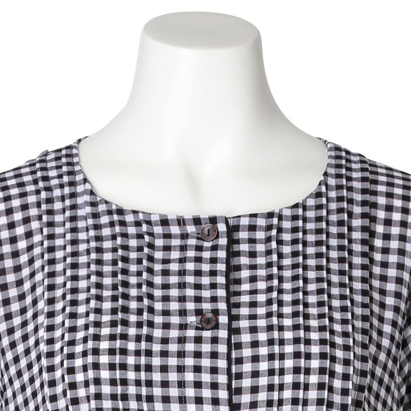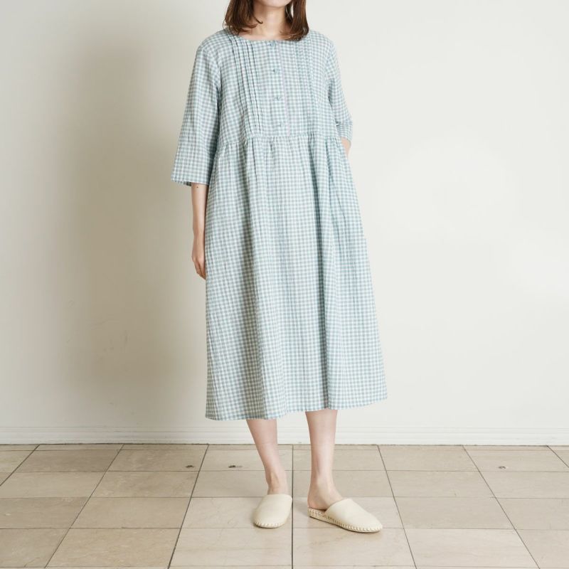 7分袖ナイティは、胸元に立体感のあるピンタックを施し丁寧に仕上げました。チェックの中から1色取った前立ての配色パイピングですっきり上品な印象に。ウエスト切り替えでふんわりと広がるシルエットがかわいい。ゆったりした身幅で快適な着心地。リラクシングウエアとしてもおすすめ。両サイド便利なポケット付き。