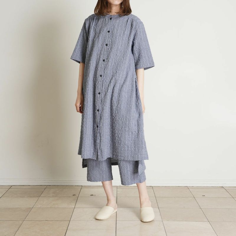 5分袖ナイティは、すっきりしたIライン。深めのスリット入りで動きやすく、前後差を入れました。 肩のタック&ギャザーがさりげないアクセントに。8分丈のボトム付きなので、安心して着用できるデザインです。