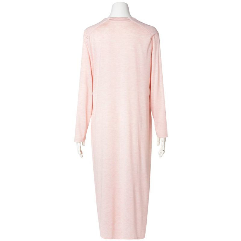 前身頃はギャザーをとりボディラインが目立たないシルエットに。寝心地に配慮し前身頃のみウエストゴム。共布シルクリボンでかわいらしさをプラス。