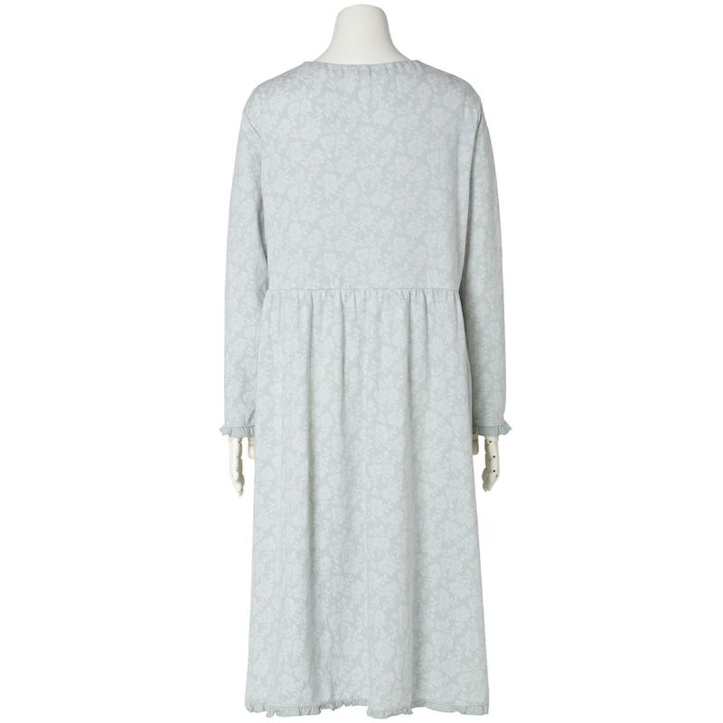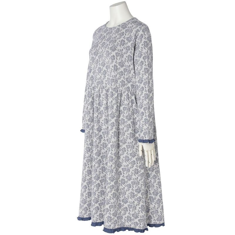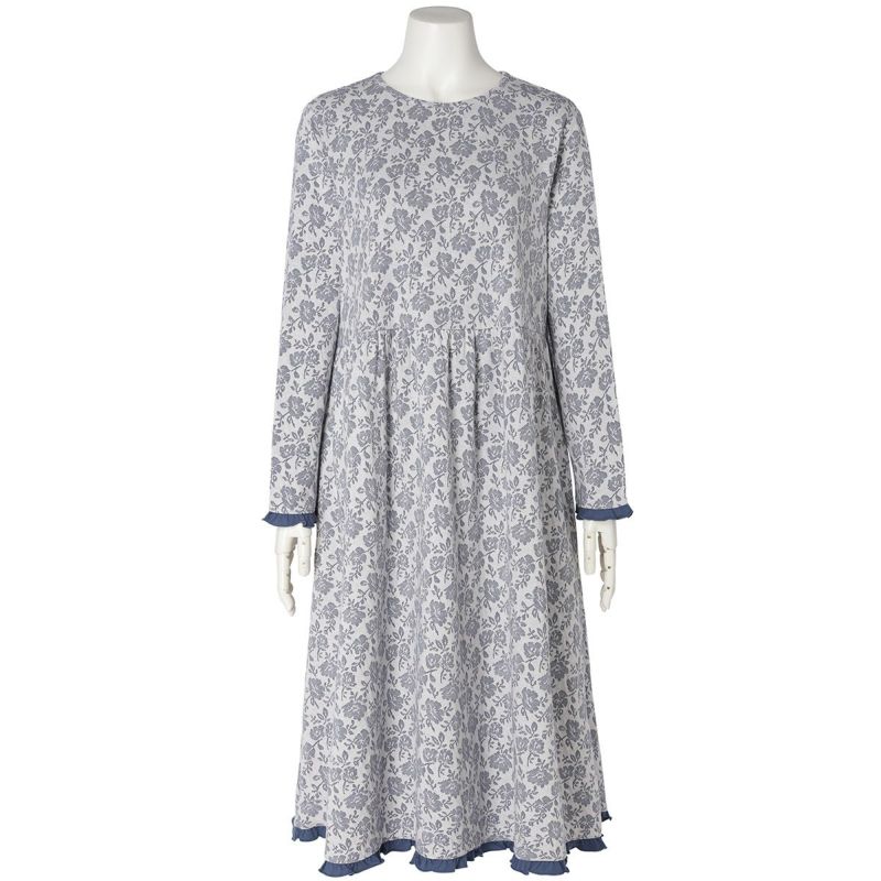 ナイティはゆったり着れる胸下切り替えギャザーの人気パターン。袖口と裾に施した波打つようなフリルがかわいらしい。首元は後ろの襟ぐりをゴム仕様にし着脱しやすさとおしゃれな見え感を両立。ポケット付き。