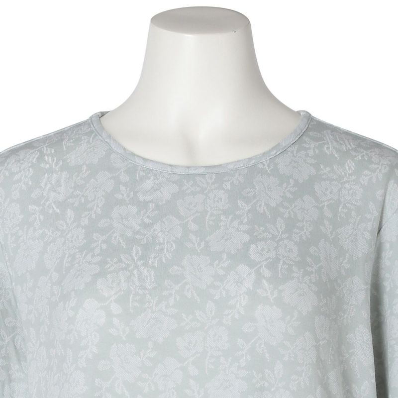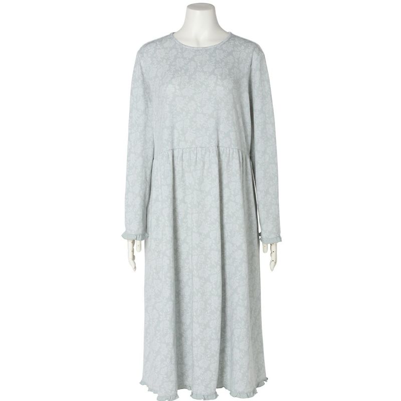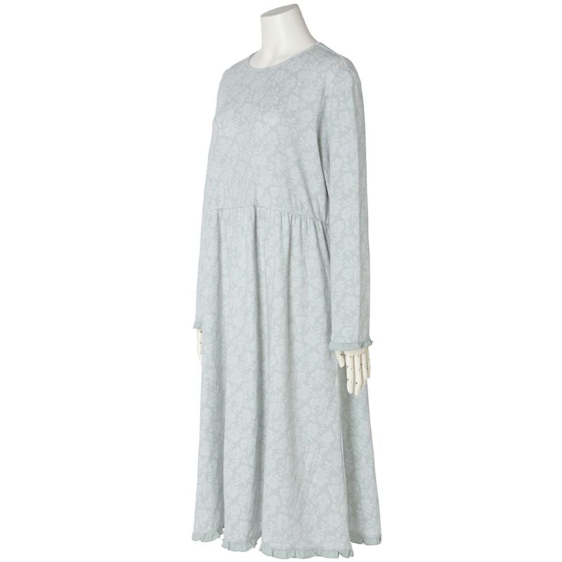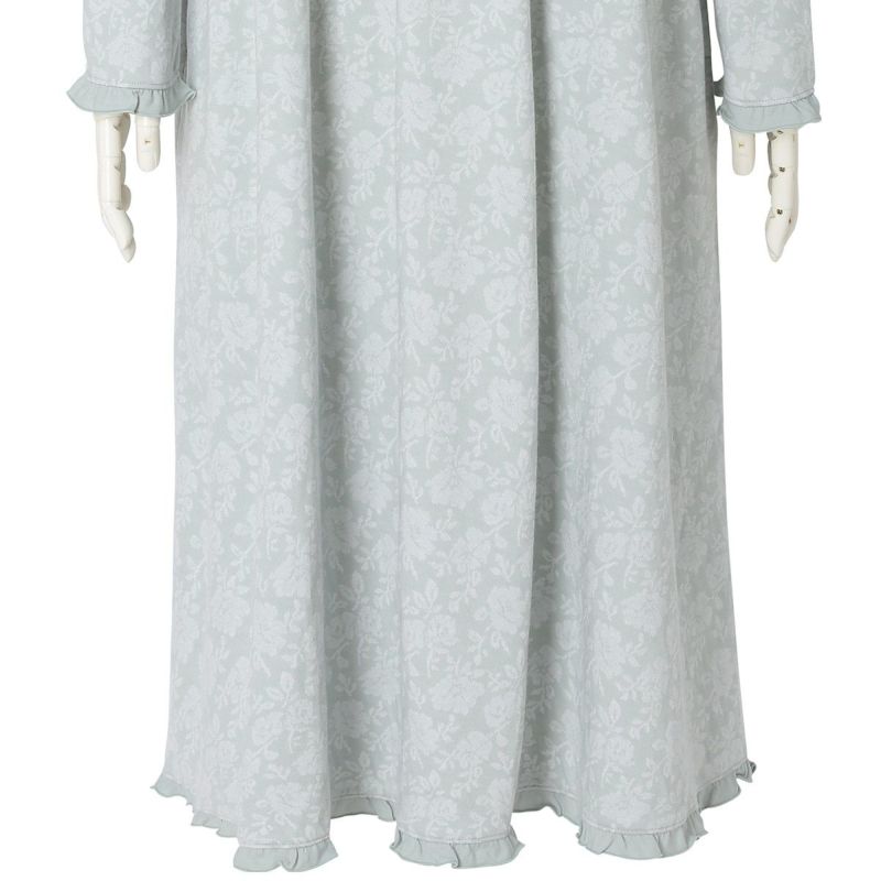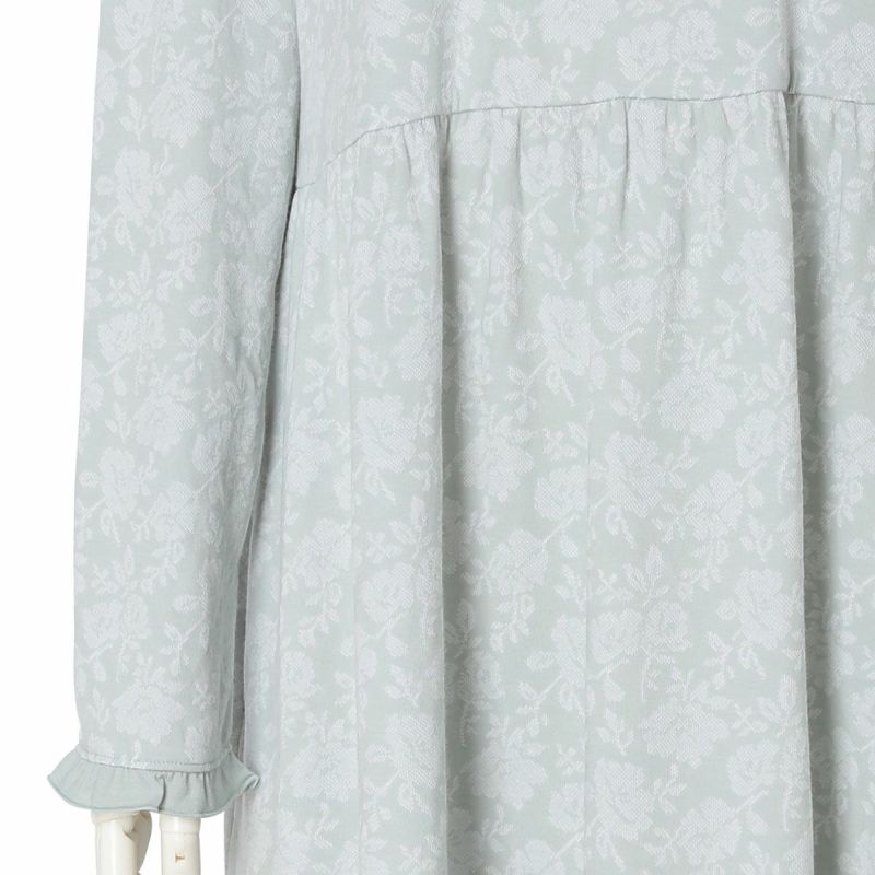 花柄のジャカード素材が目を引くナイトウエアシリーズ。綿100%の2枚の天竺素材をジャガード織で繋ぎ合わせ、ふっくらとした厚みとやわらかさを実現しました。天竺のフリルでかわいらしいアクセントを施し、落ち着きの中に華やかな印象をつくります。