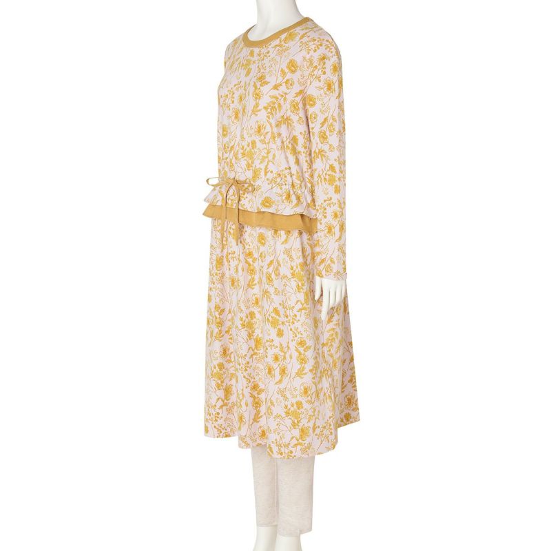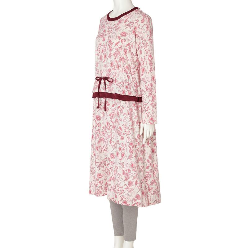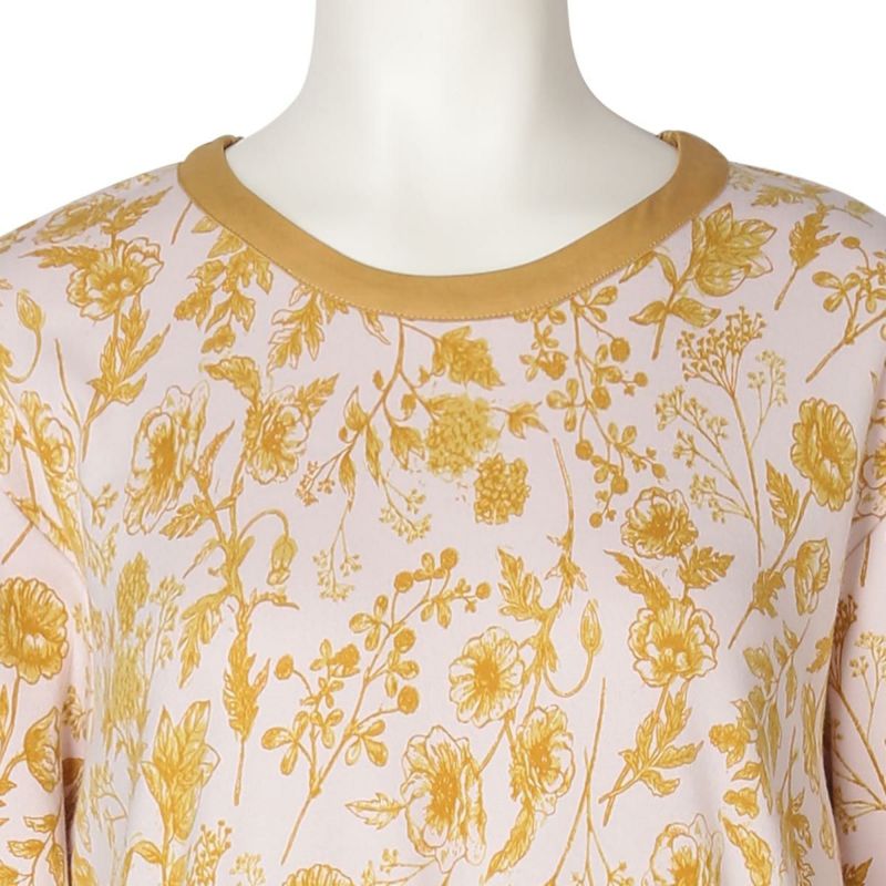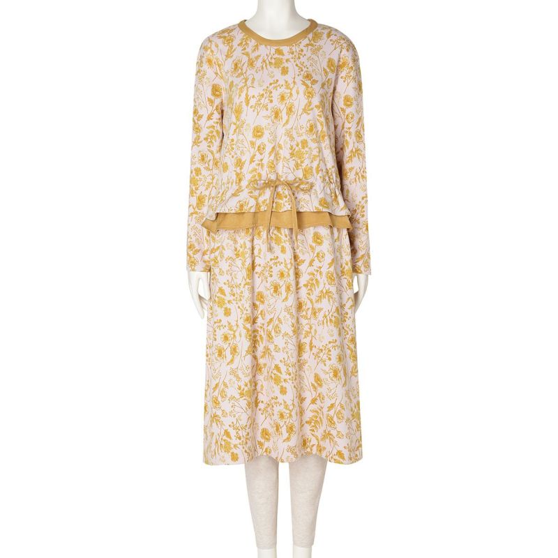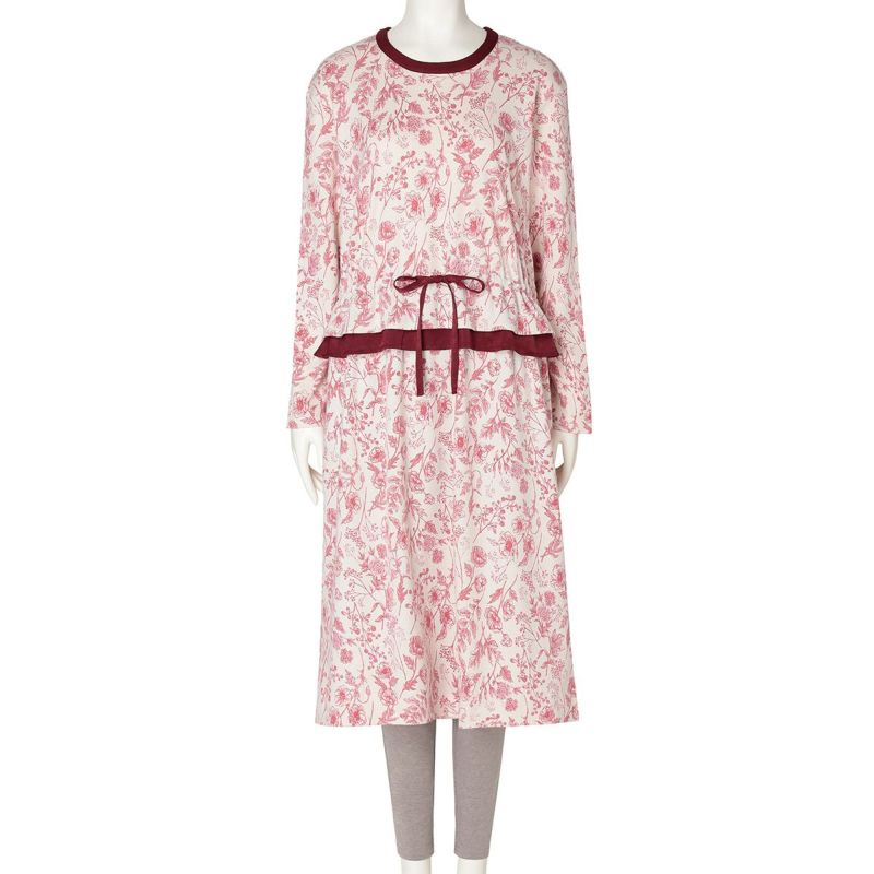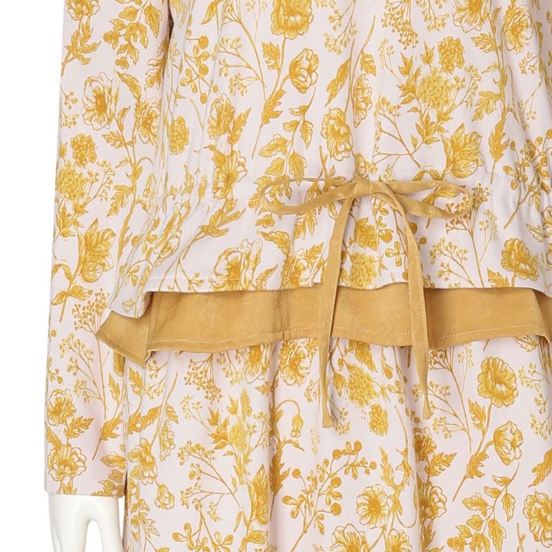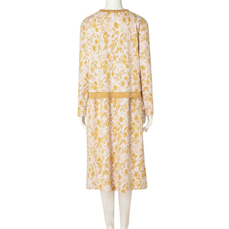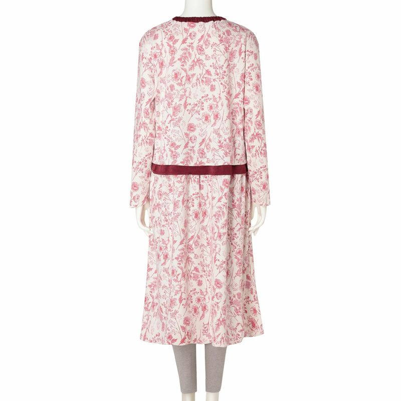 繊細な線画タッチの花柄にサテンフリルを添えたエレガントで華やかな魅力あふれるナイトウエアシリーズ。着心地がよい中肉厚の綿スムース素材。両面起毛加工をほどこし柔らかくウォーム感あり。大人のかわいらしさがあるピンクと、マットなゴールドのような花が描かれるイエローの2色展開です。