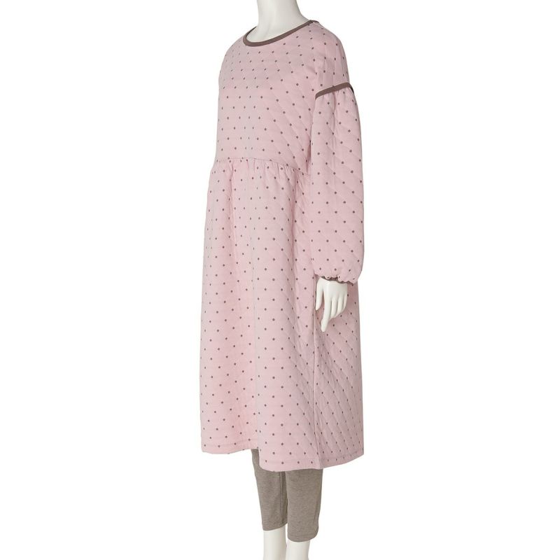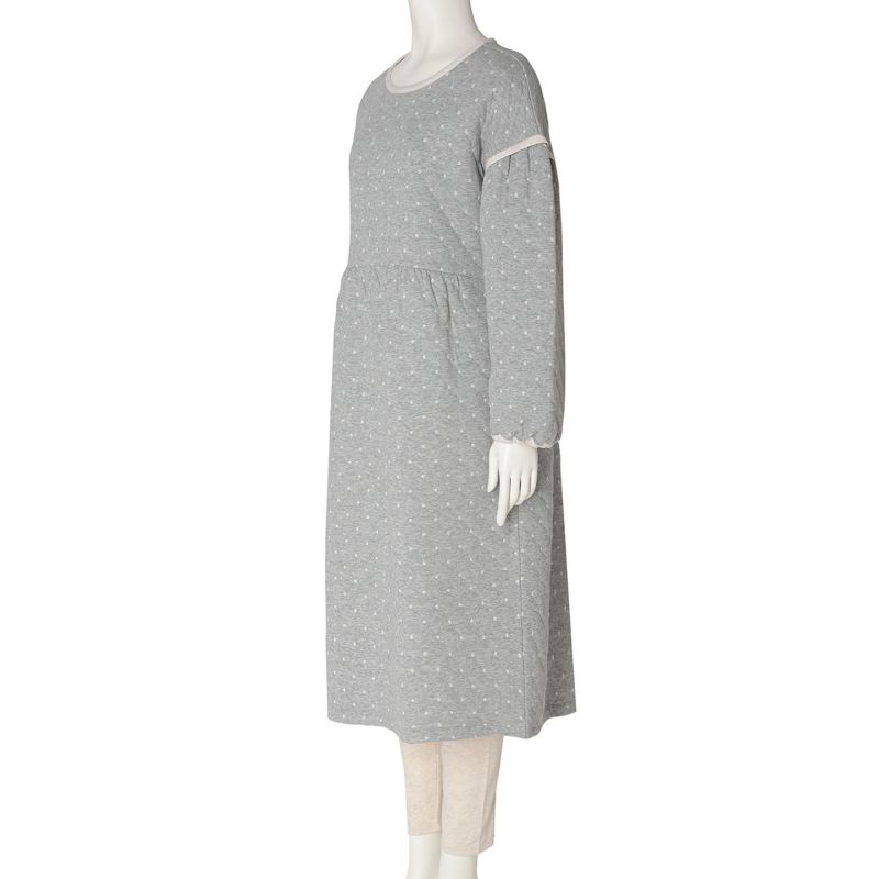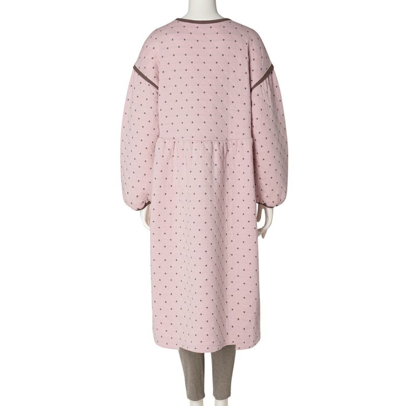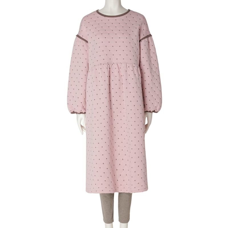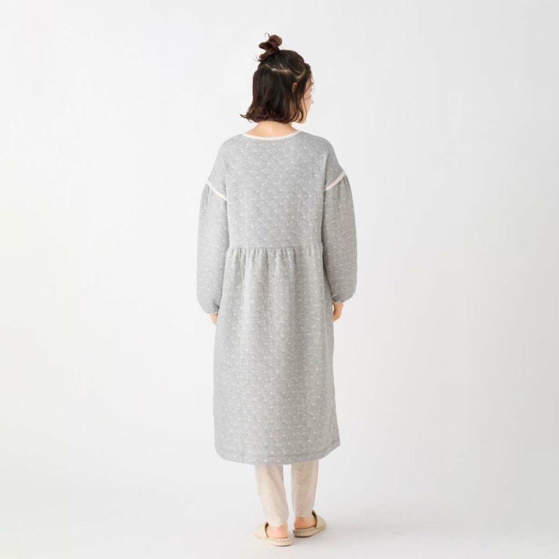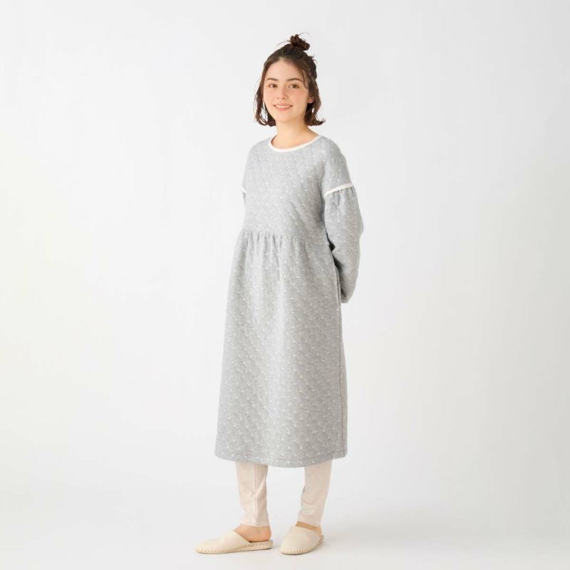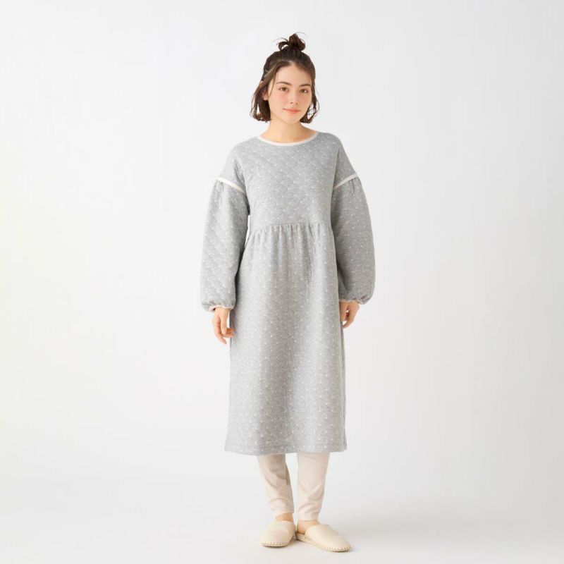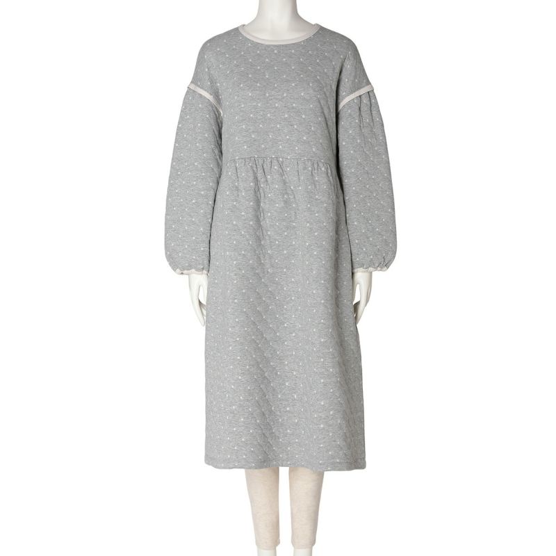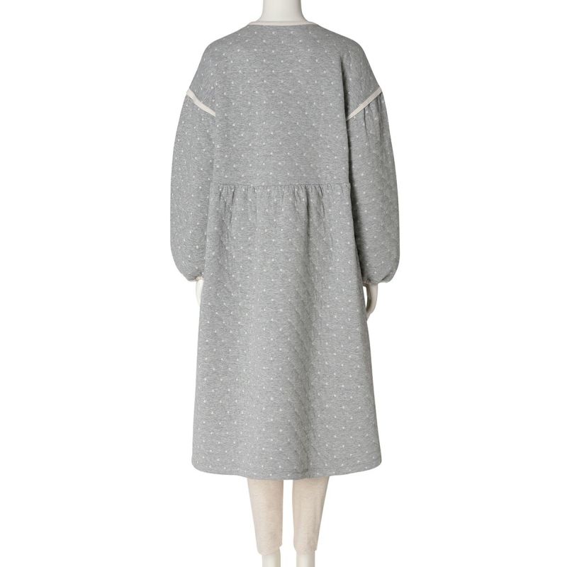 ゆったり着れる胸下切り替えギャザーのナイティ。ドロップショルダーでリラックスしたシルエット。袖口はまくったり家事のしやすいゴム入りのパフスリーブで、甘さをプラス。パイピングを効かせ大人のバランスに仕上げました。
