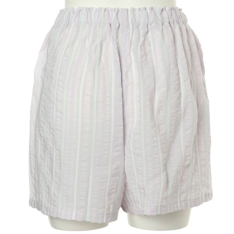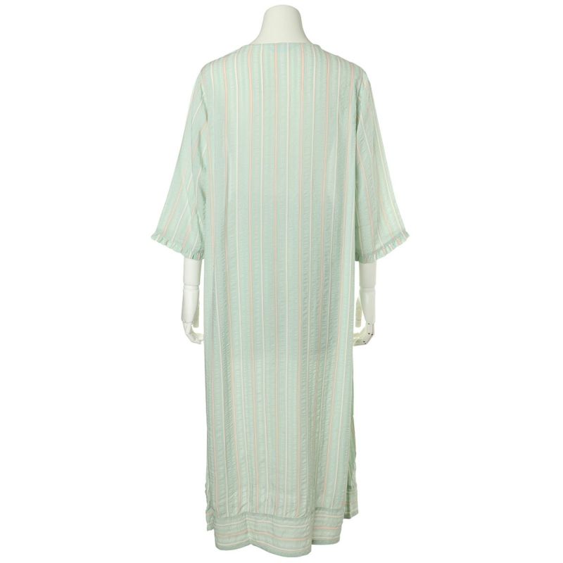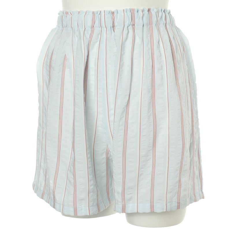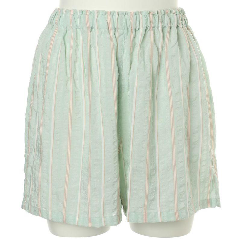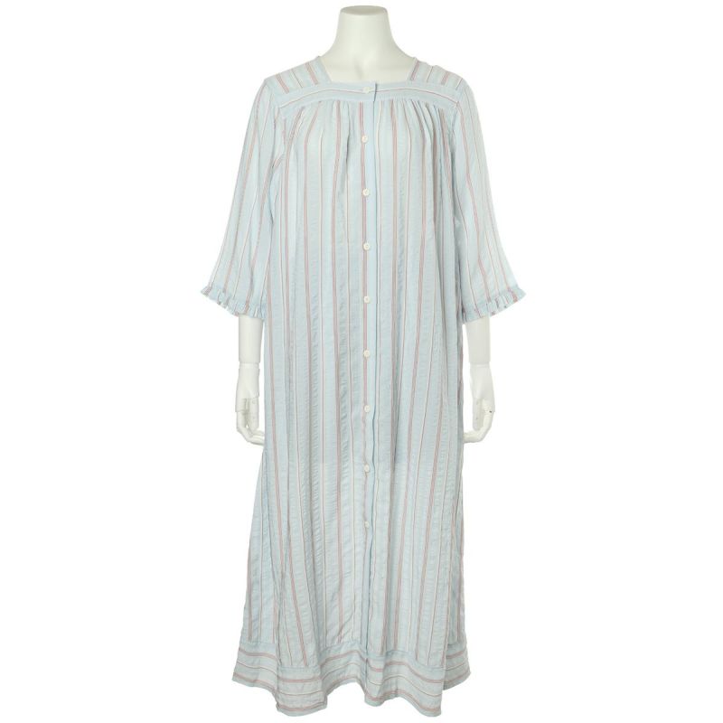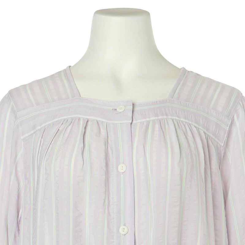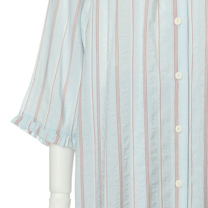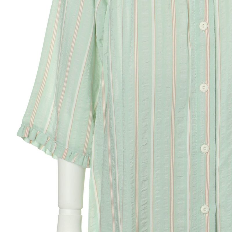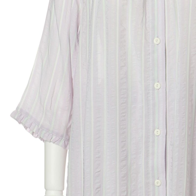 レーヨン混のサッカー素材を使用、自然な落ち感と凹凸がありシワが気になりにくいのが特徴。縦ラインを強調するストライプ柄は細見え効果も◎