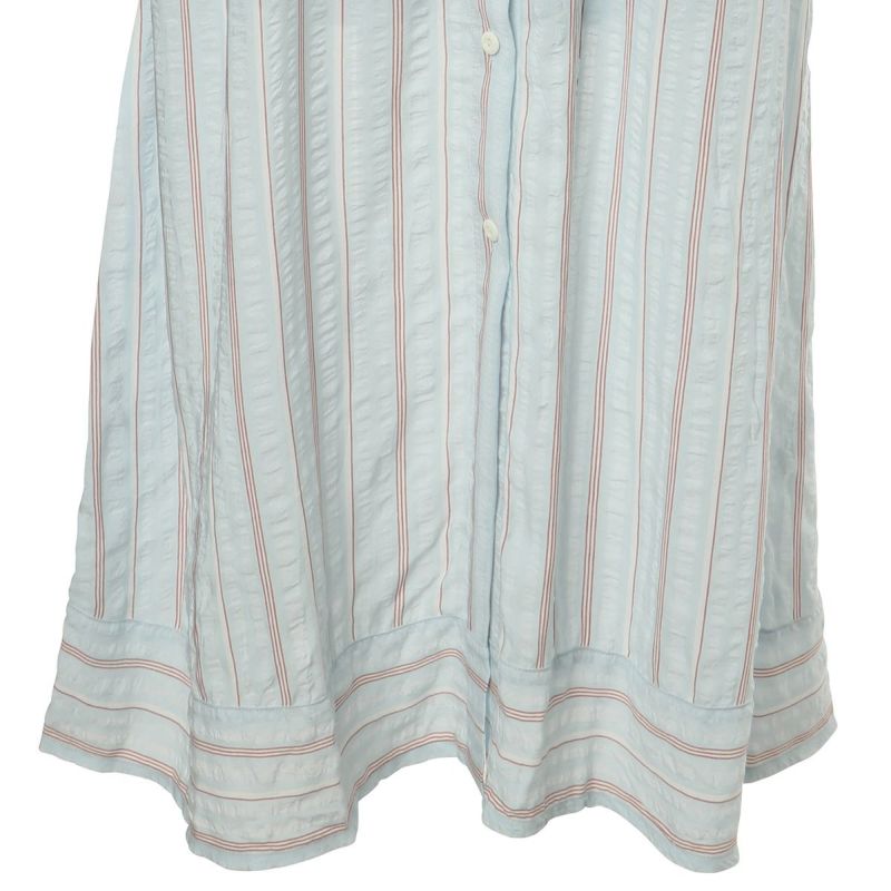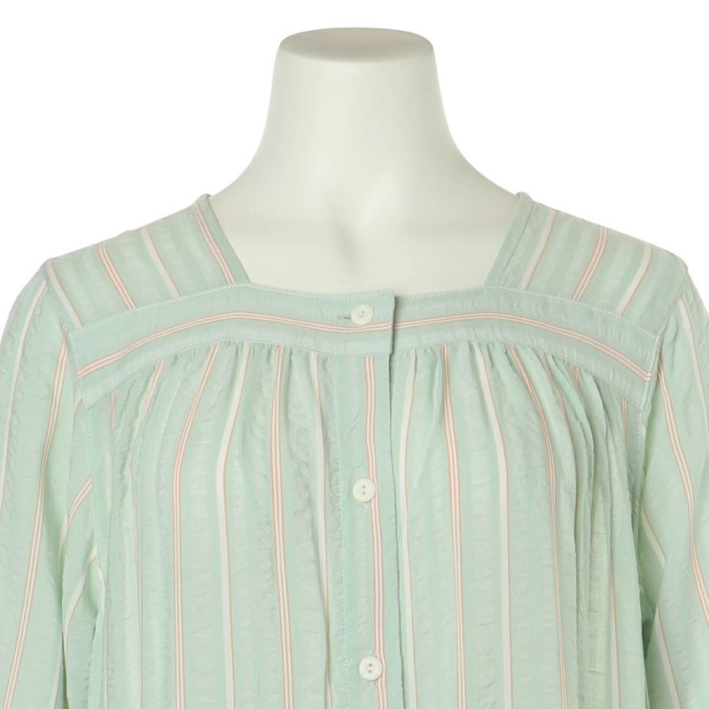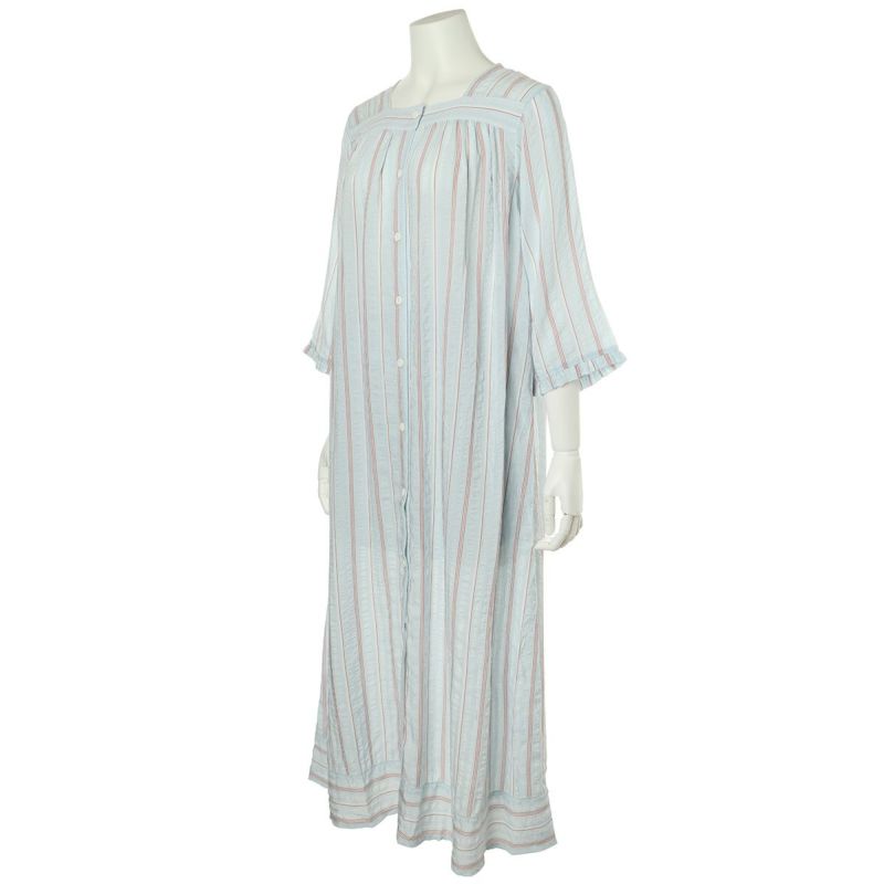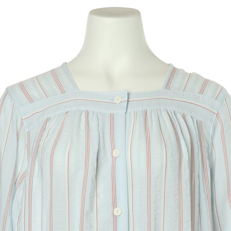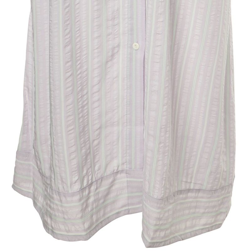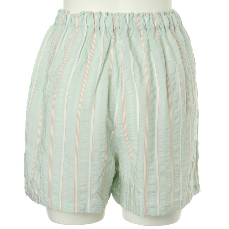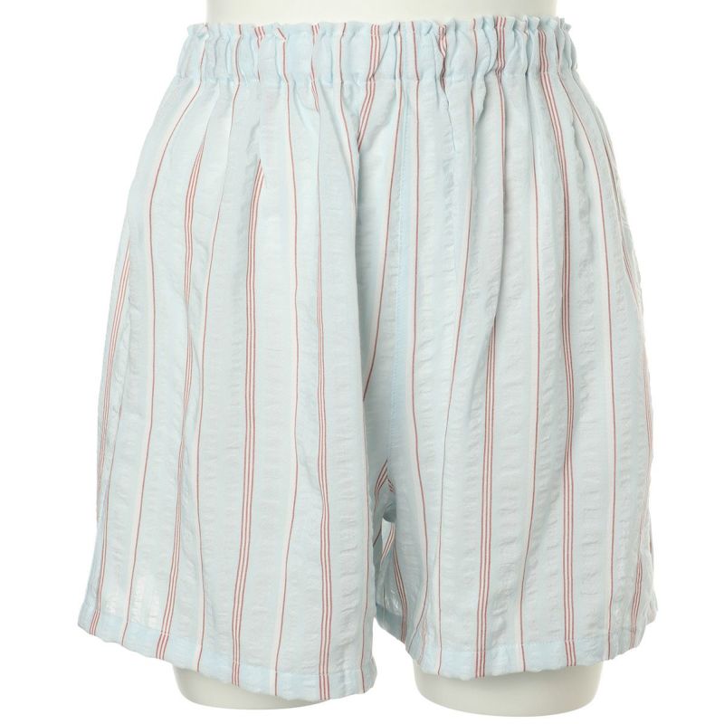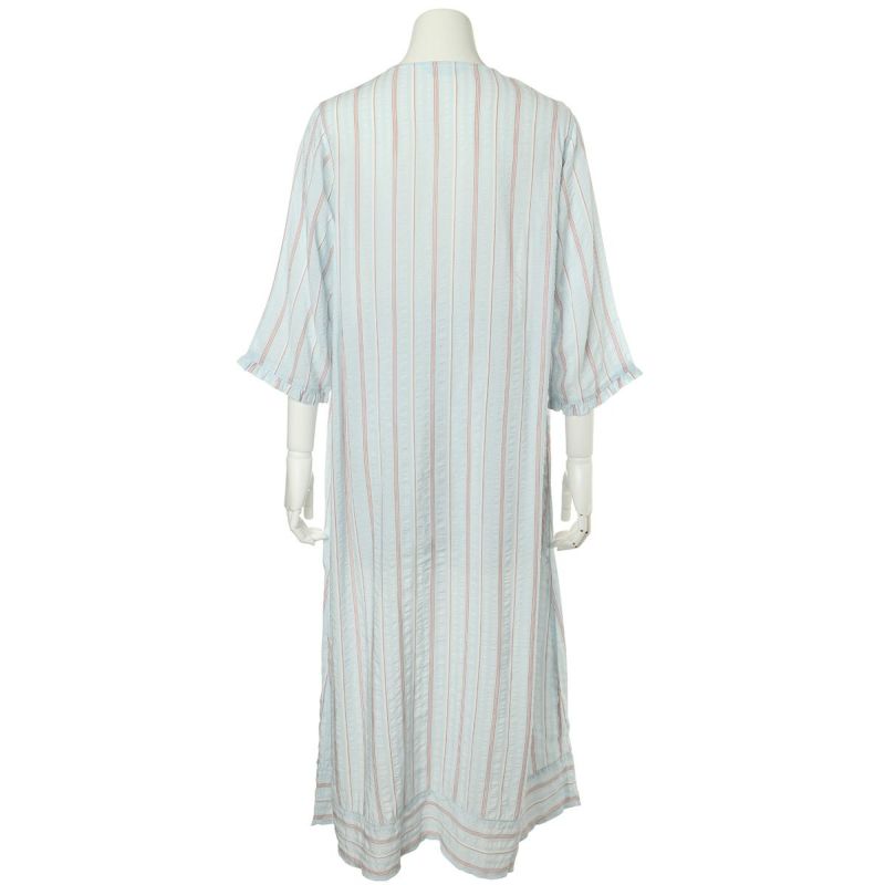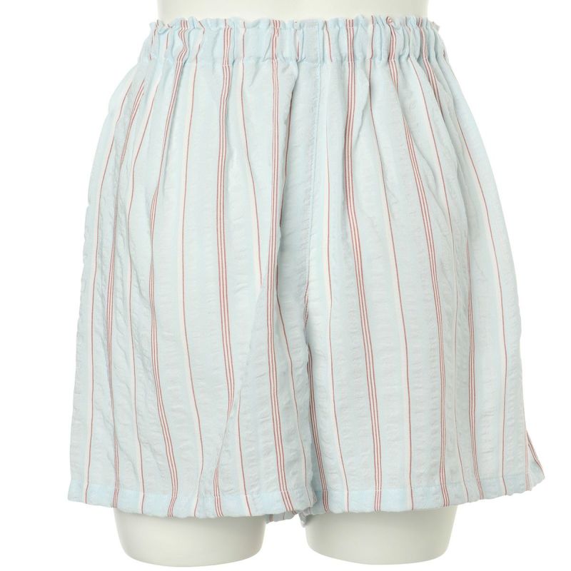 レーヨン混のサッカー素材を使用、自然な落ち感と凹凸がありシワが気になりにくいのが特徴。縦ラインを強調するストライプ柄は細見え効果も◎