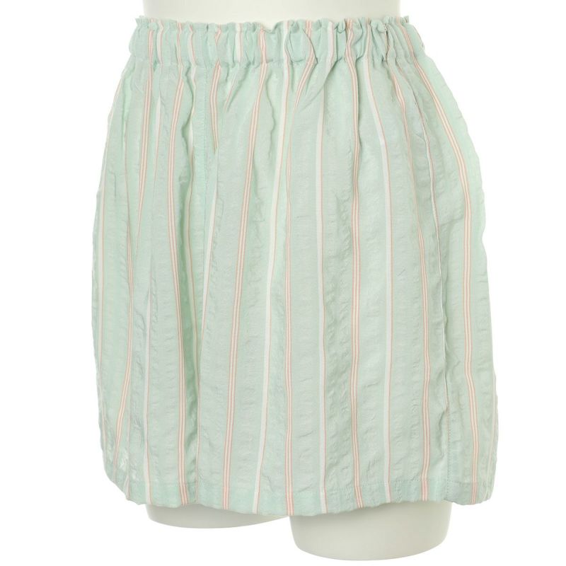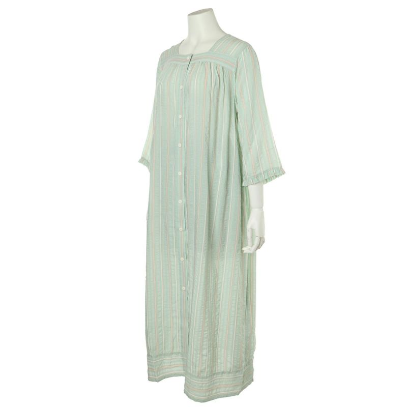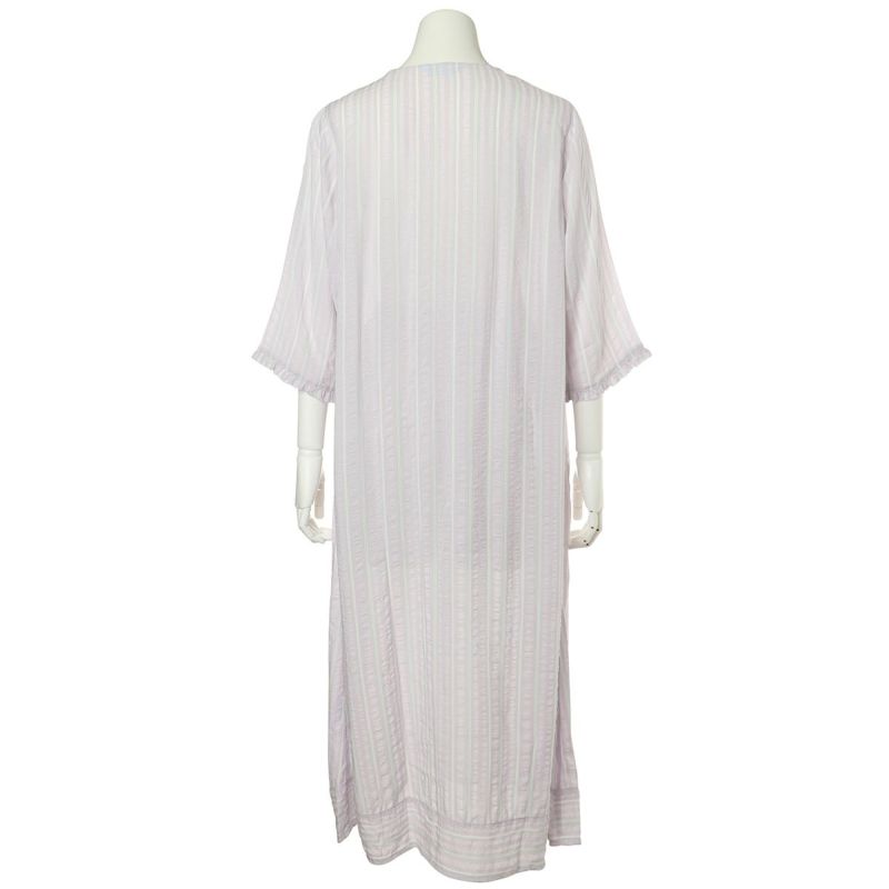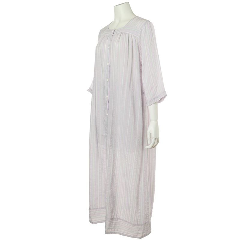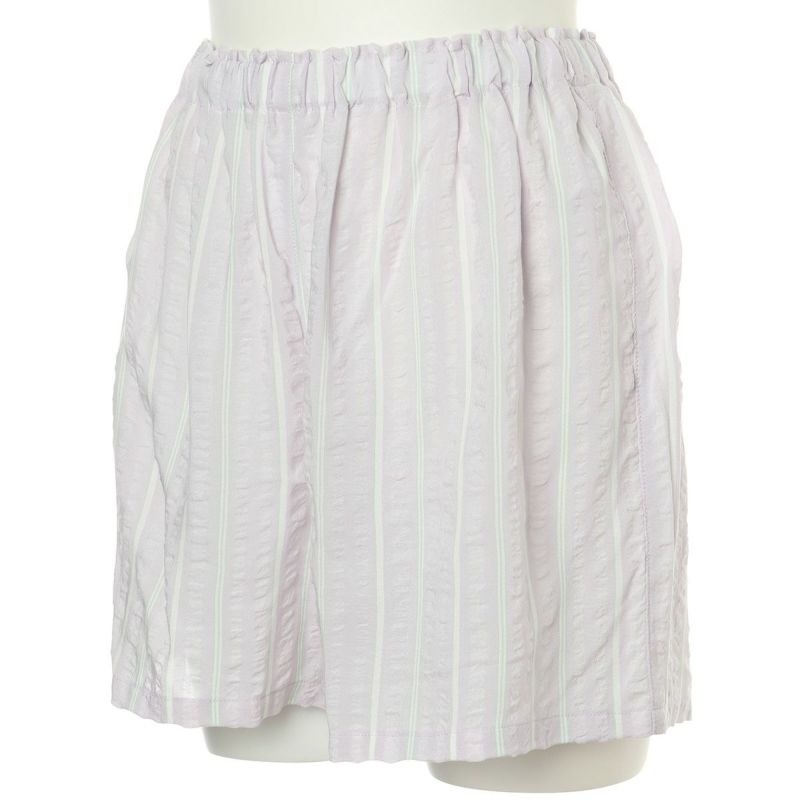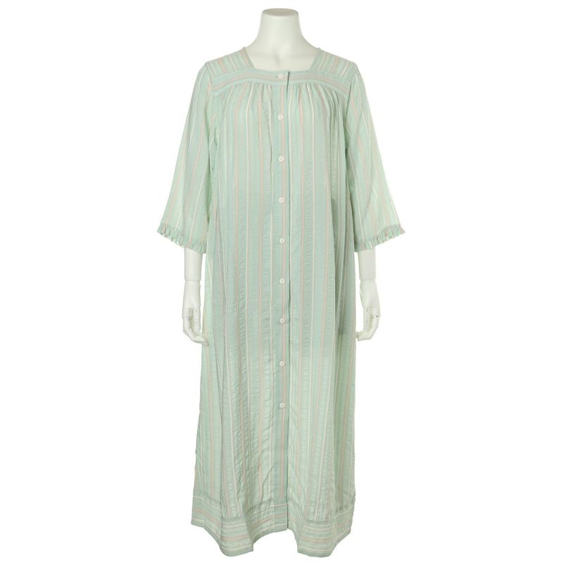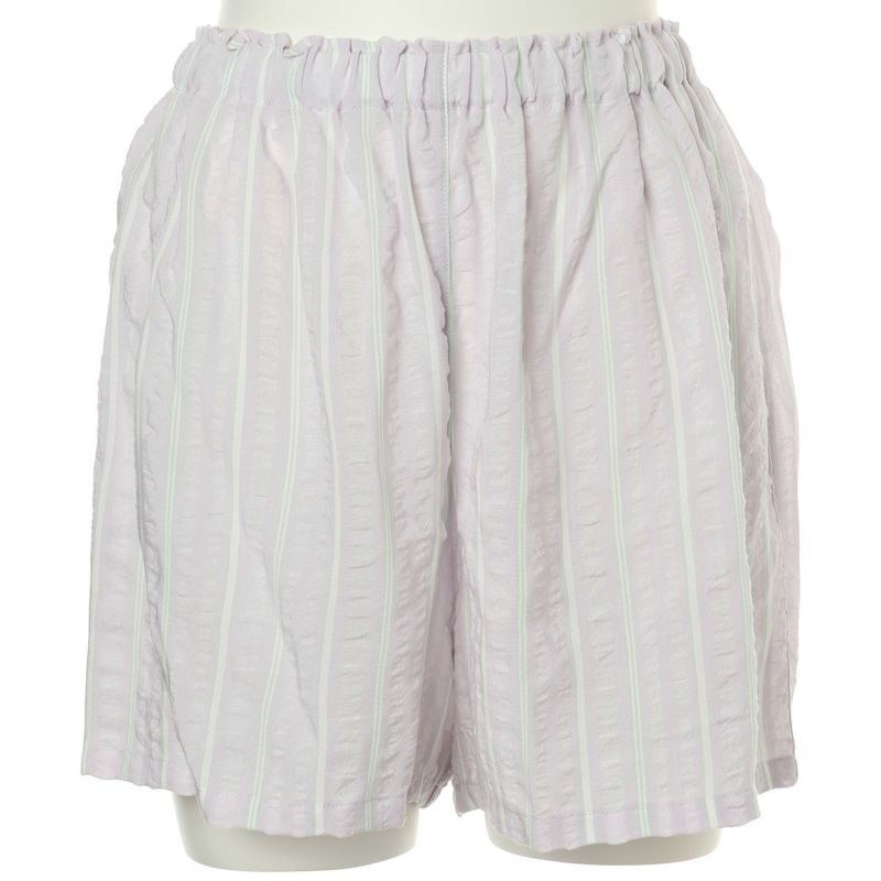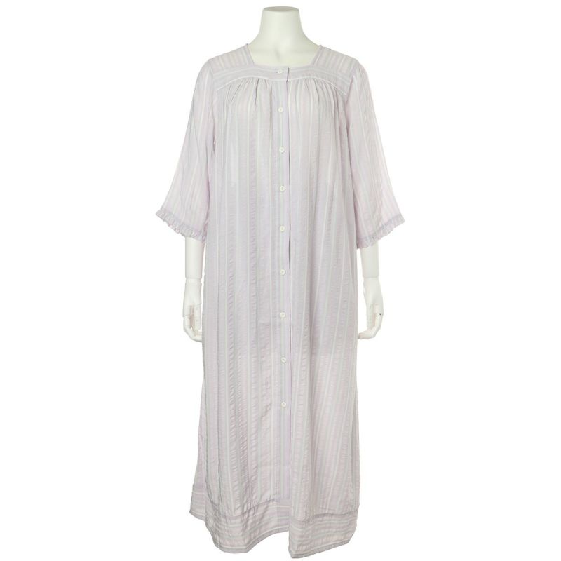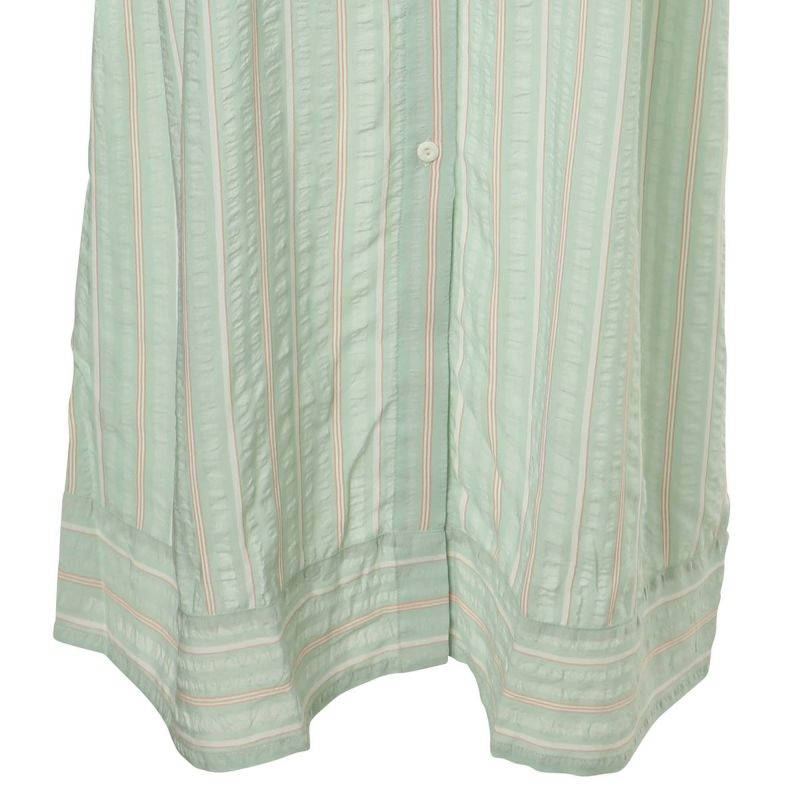 レーヨン混のサッカー素材を使用、自然な落ち感と凹凸がありシワが気になりにくいのが特徴。縦ラインを強調するストライプ柄は細見え効果も◎
