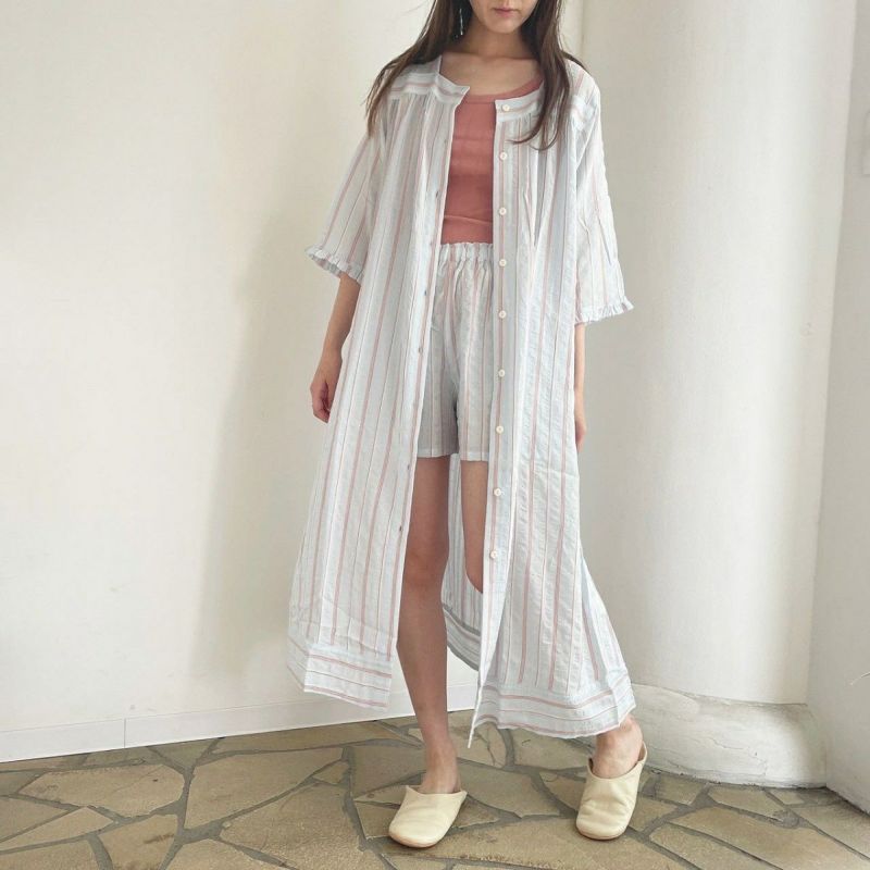 七分袖ナイティは、単体でも使えるショートパンツ付き。オーバーパンツとしてはもちろん、前を開いて羽織りコーデも。