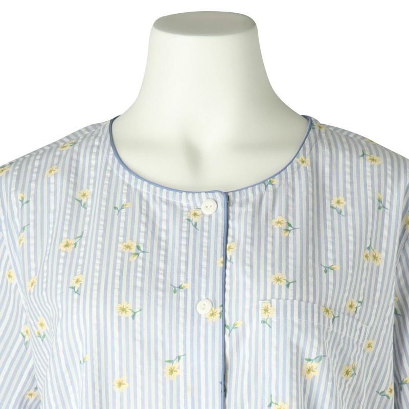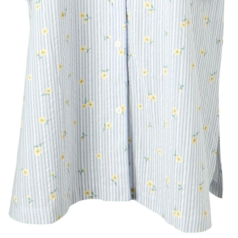 細さの違う糸で凹凸を出したサッカーストライプ生地にキッドブルーらしい小花柄をプリント。凹凸のあるさらっとした着用感。