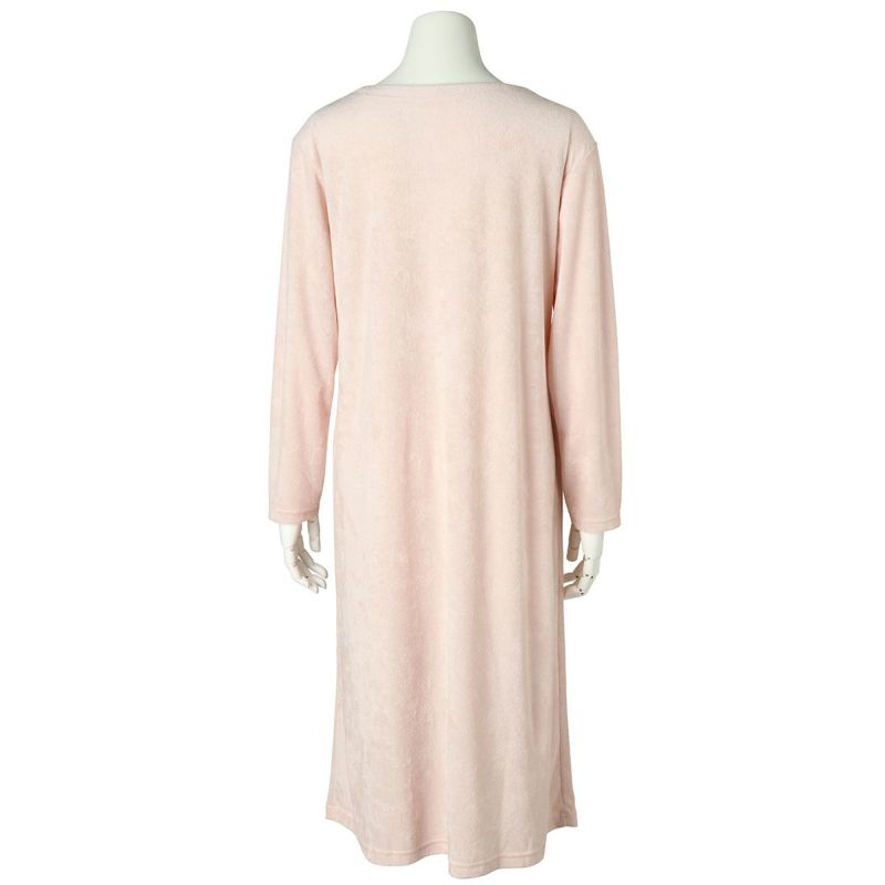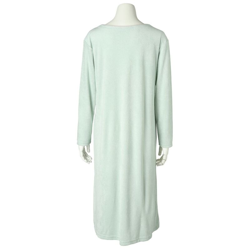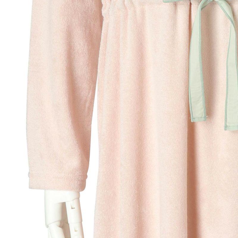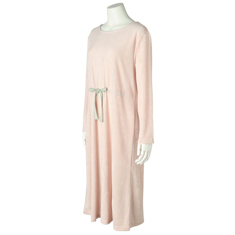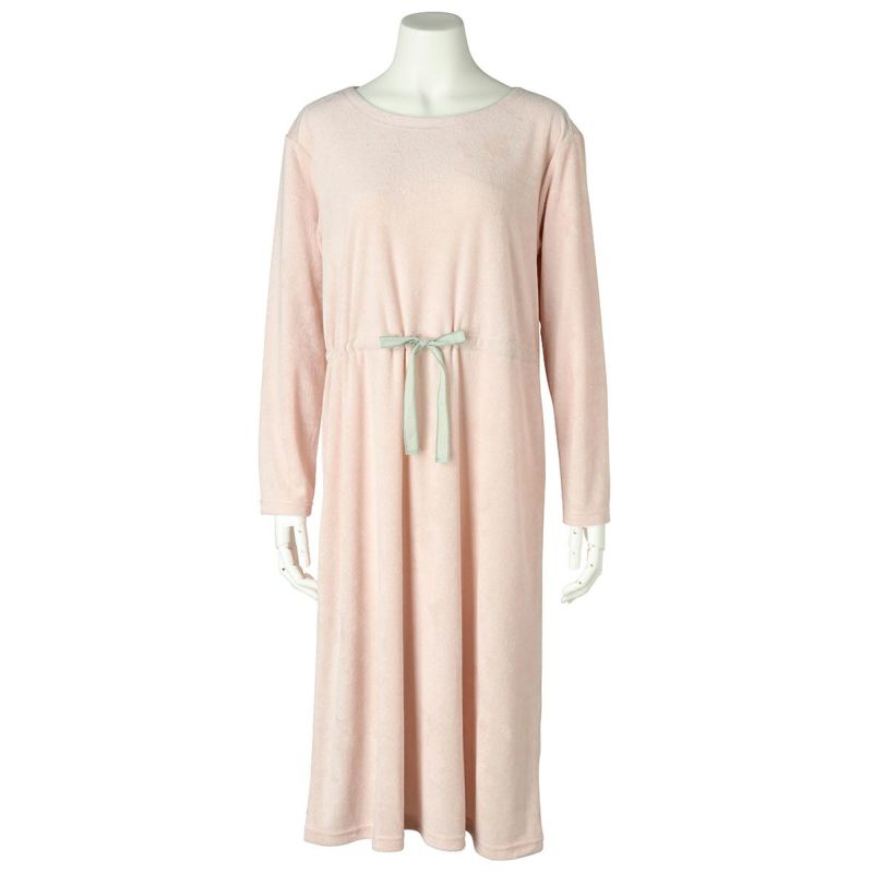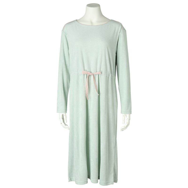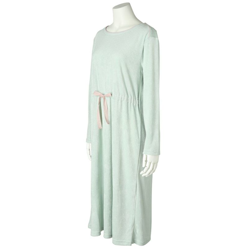 長袖ナイティは、配色の別布リボンを前面のみにあしらったデザイン。パイピングを施した衿ぐりは、ややゆったりな開きでデコルテがすっきり見える◎