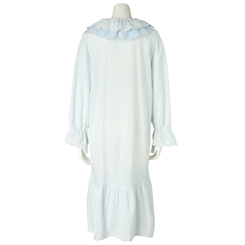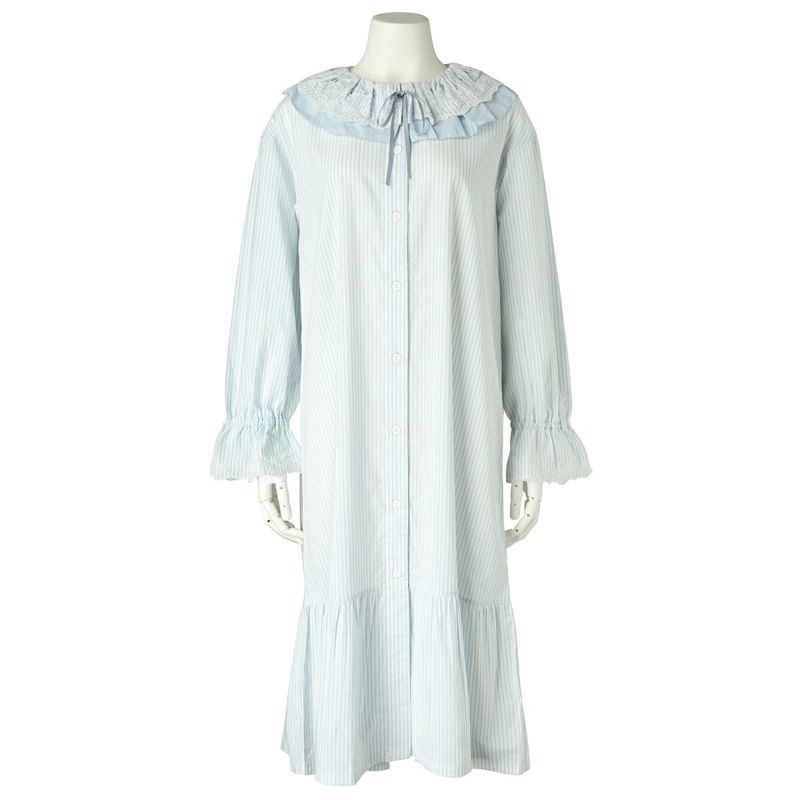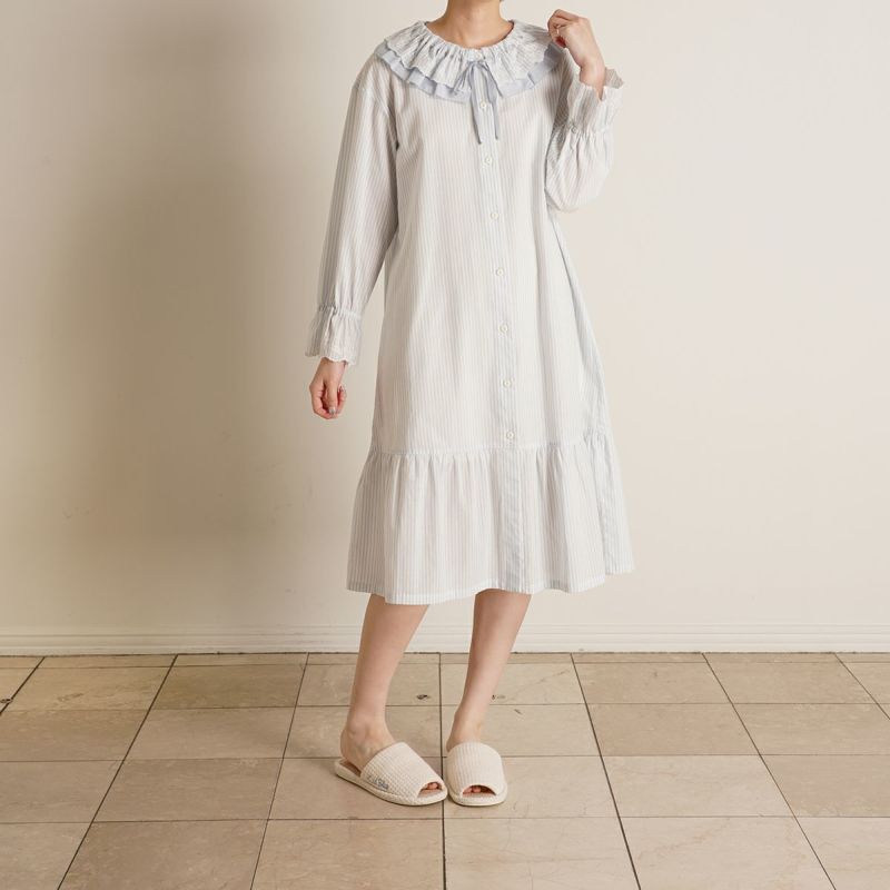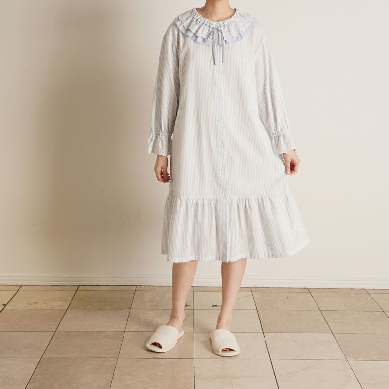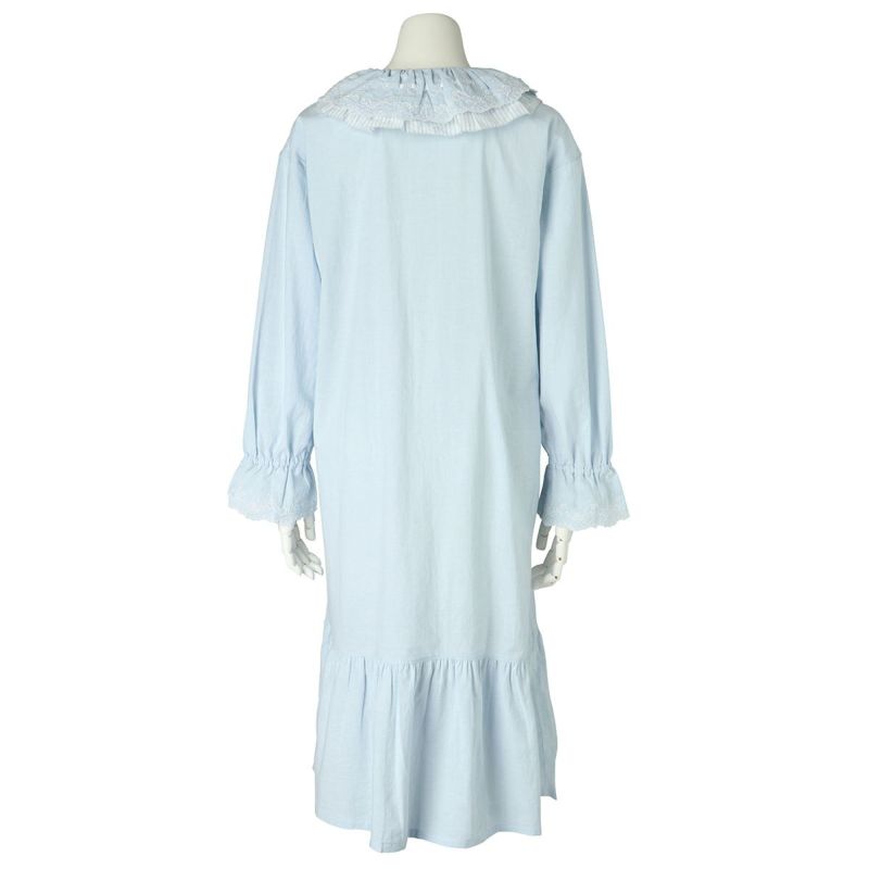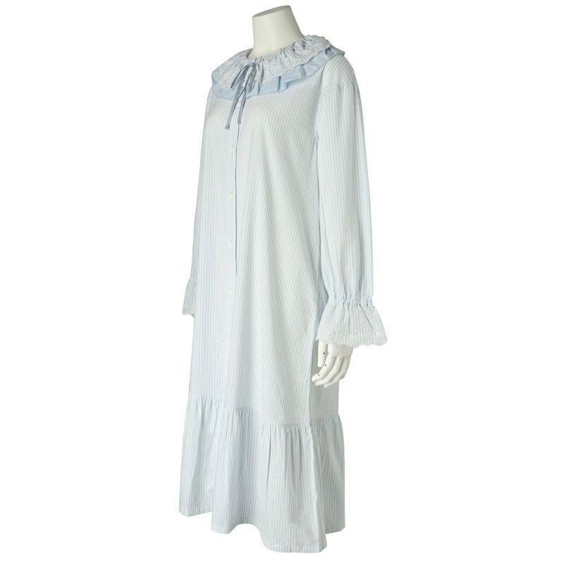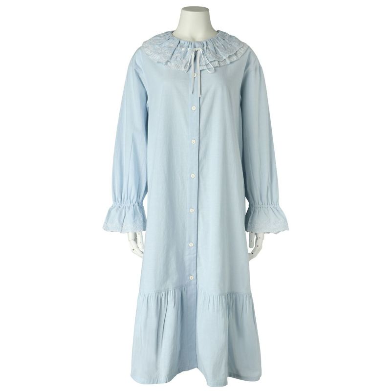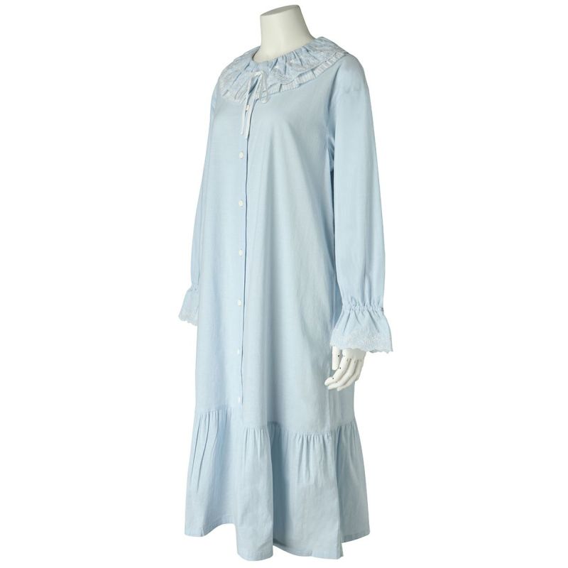 衿ぐりが華やかな長袖ナイティ。ギャザーフリルにしたエンブロイダリーレースのハシゴ穴部分にリボンを通したこだわりのディティール。袖口は、インゴム仕様でレースとスカラップでかわいさたっぷりに仕上げました。裾のギャザーを入れた切り替えもエレガント。