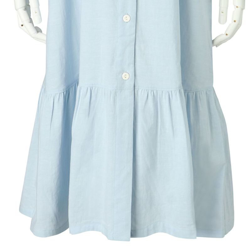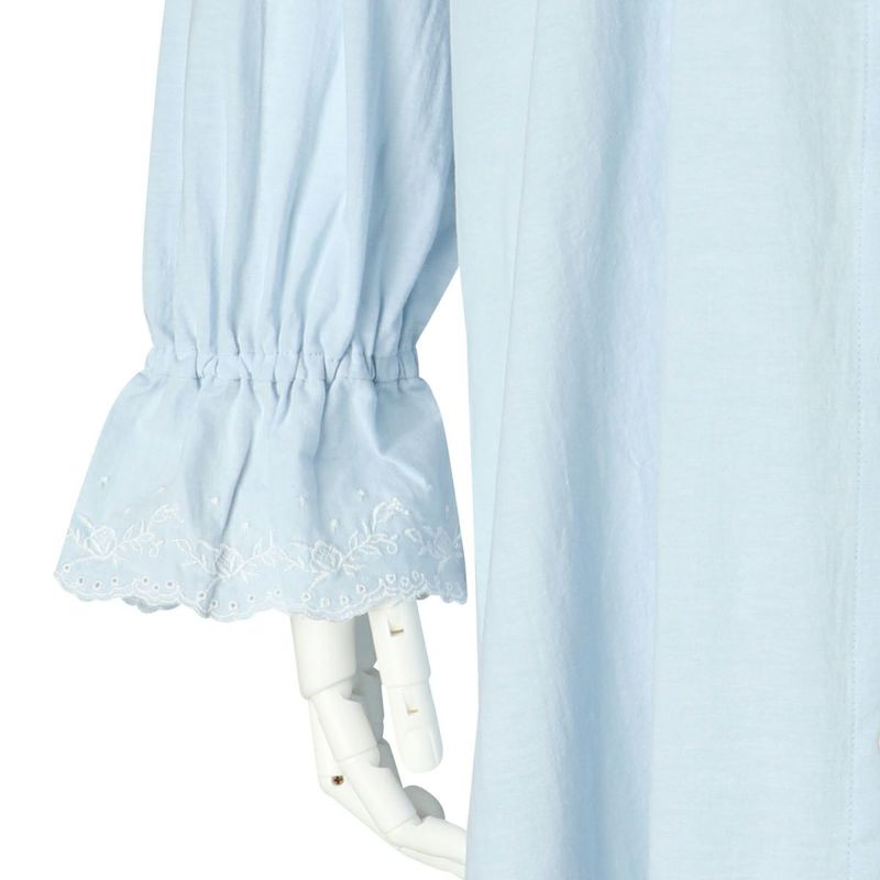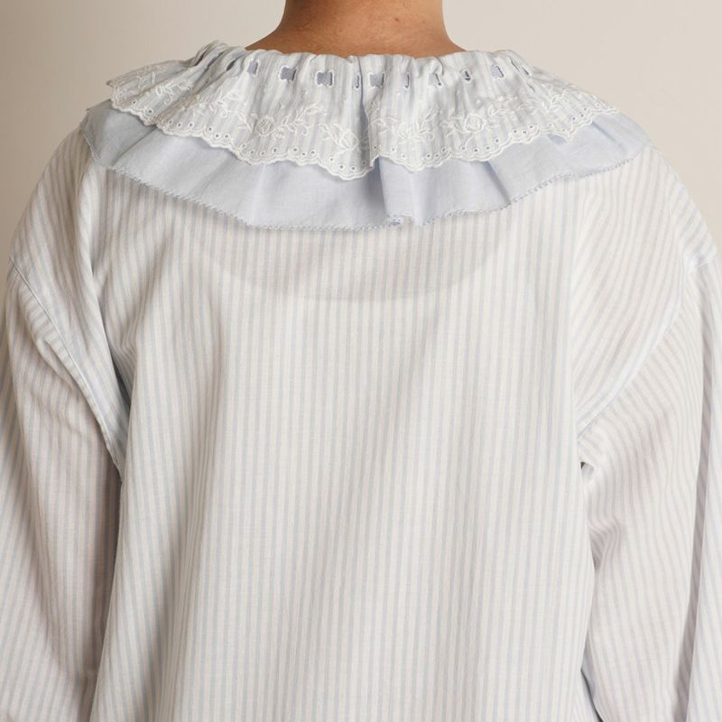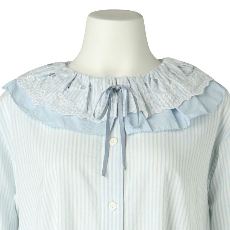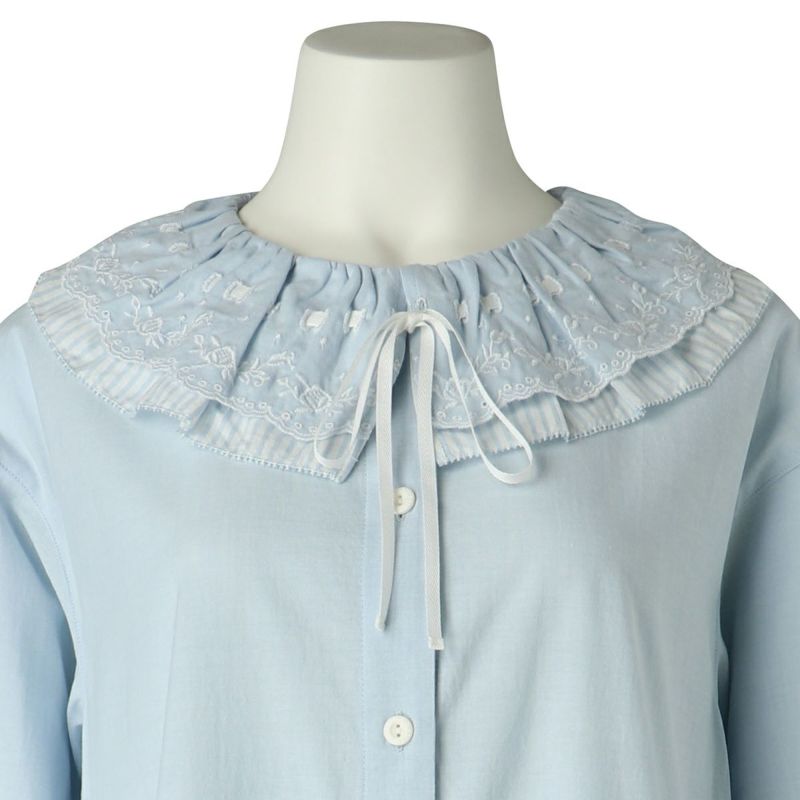 広幅のエンブロイダリーレースがフェミニンなシリーズ。さらっとした新素材コットンシャンブレーワッシャーを無地とストライプの2色をアイテムにより効果的に組み合わせました。春を感じるキッドブルーらしい爽やかでクリーンなカラーリング。