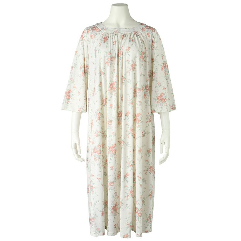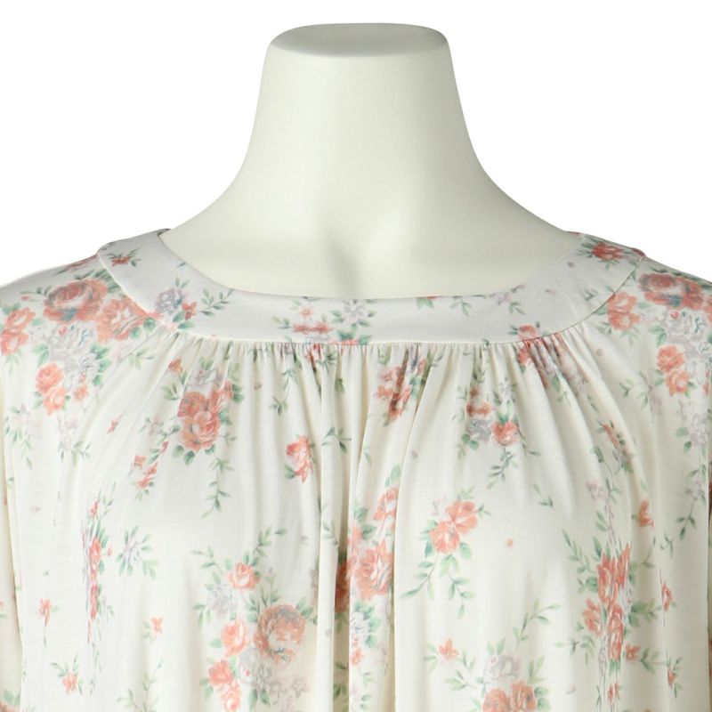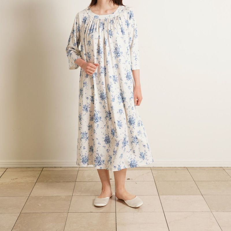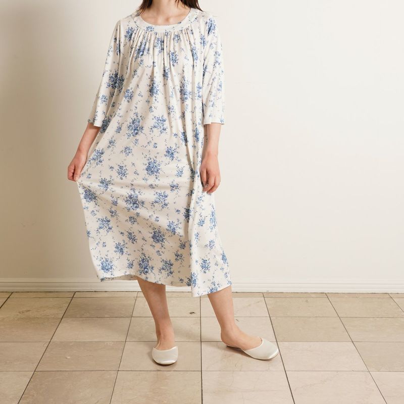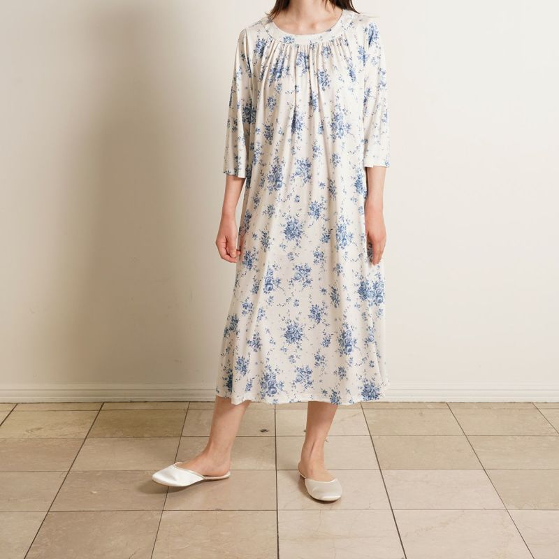 7分袖ナイティは、ゆるやかなカーブラインのラウンドネックデザイン。シルクならではのドレープ感が上品です。フレアな袖の甘さをひきしめるパイピングがアクセント。