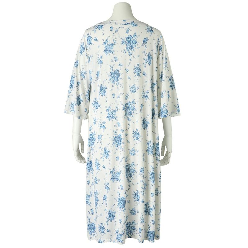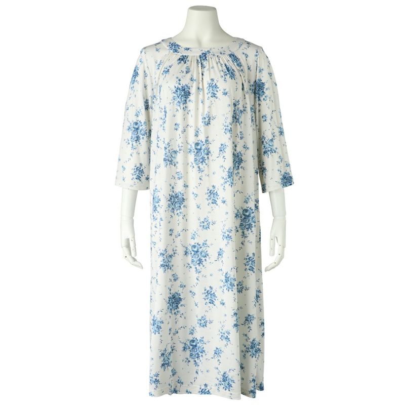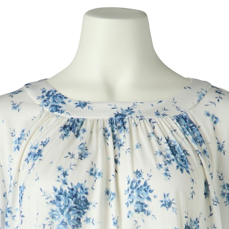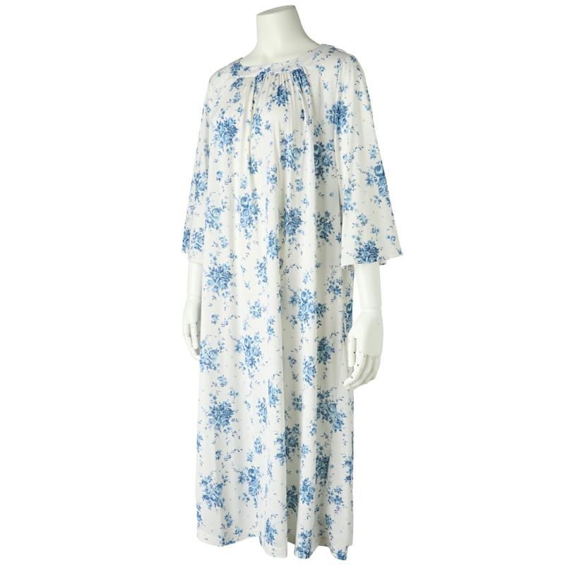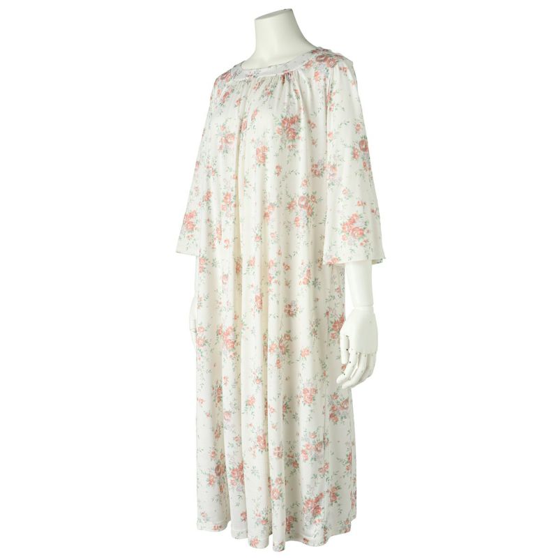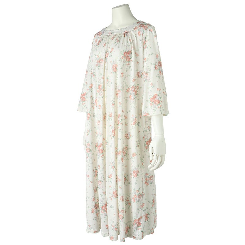 7分袖ナイティは、ゆるやかなカーブラインのラウンドネックデザイン。シルクならではのドレープ感が上品です。フレアな袖の甘さをひきしめるパイピングがアクセント。