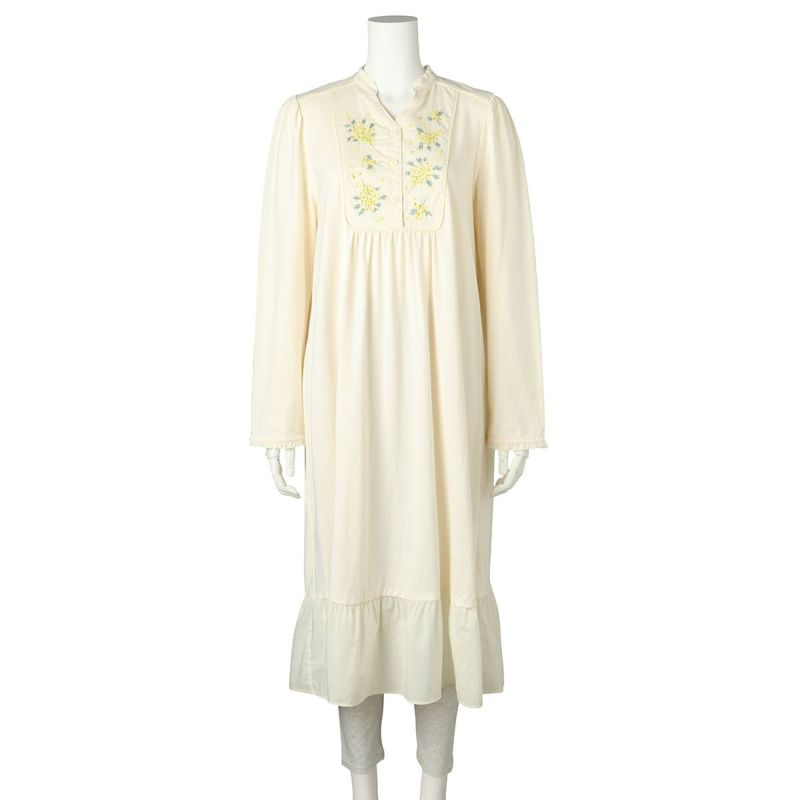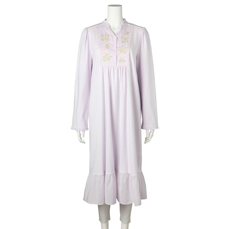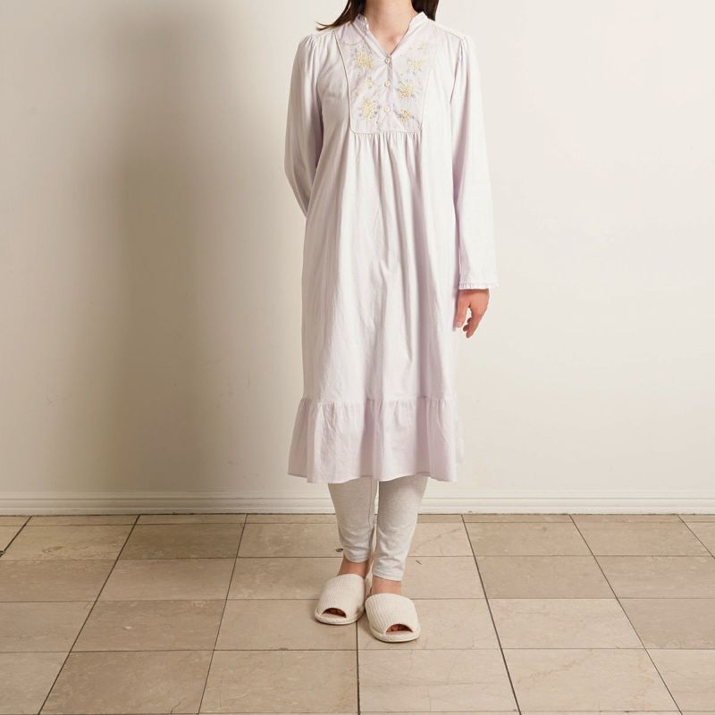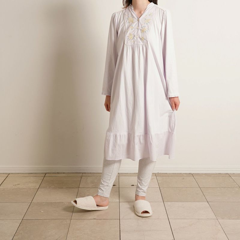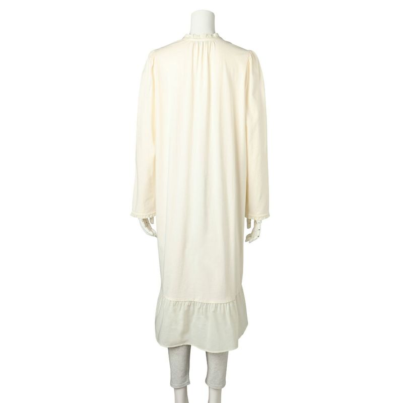 長袖ナイティは、裾の別布フリルが可愛らしいワンピースデザイン。ヨークは2枚仕立てで刺しゅうが肌に当たらない仕様。