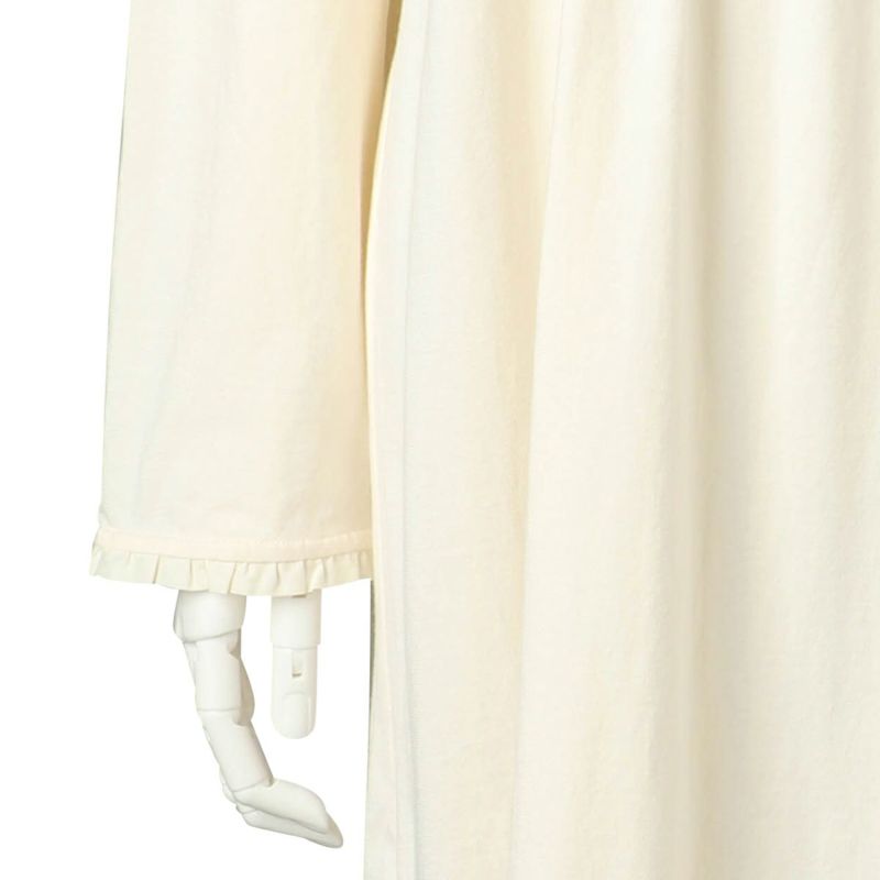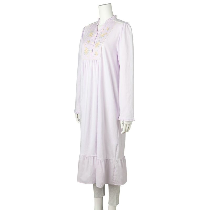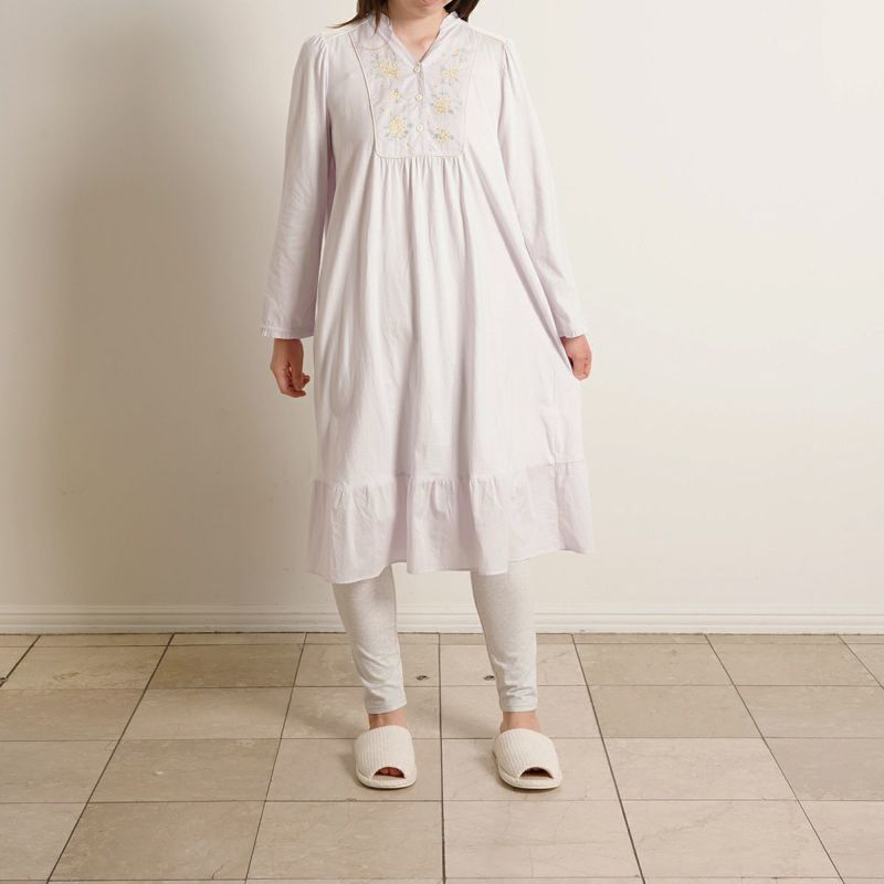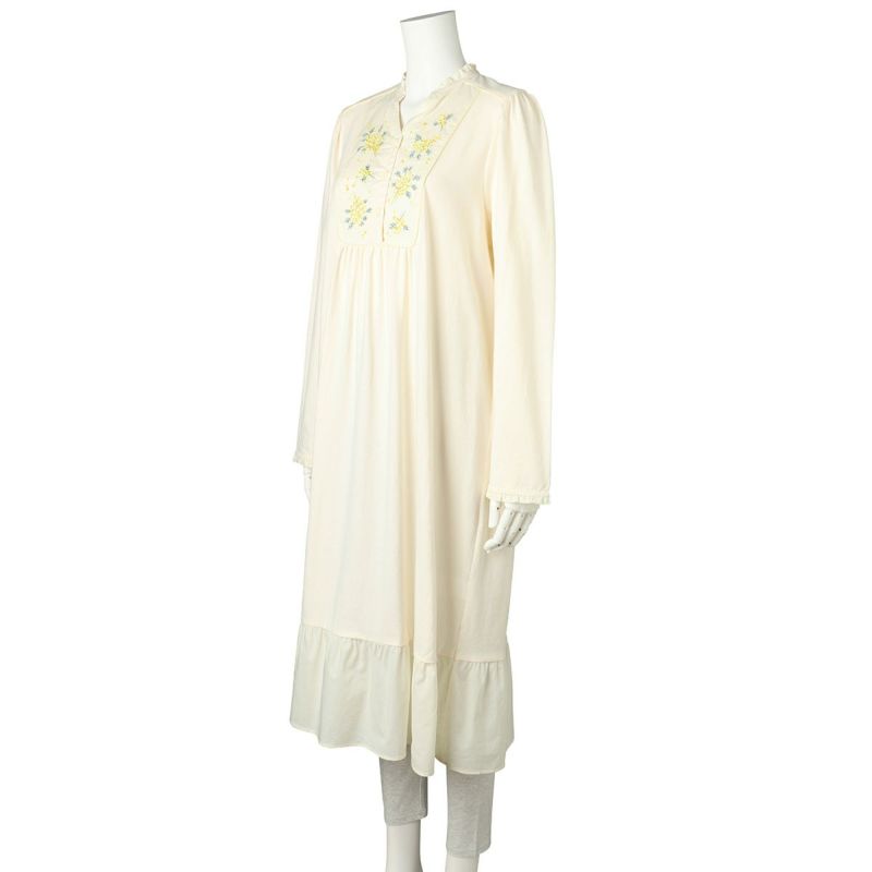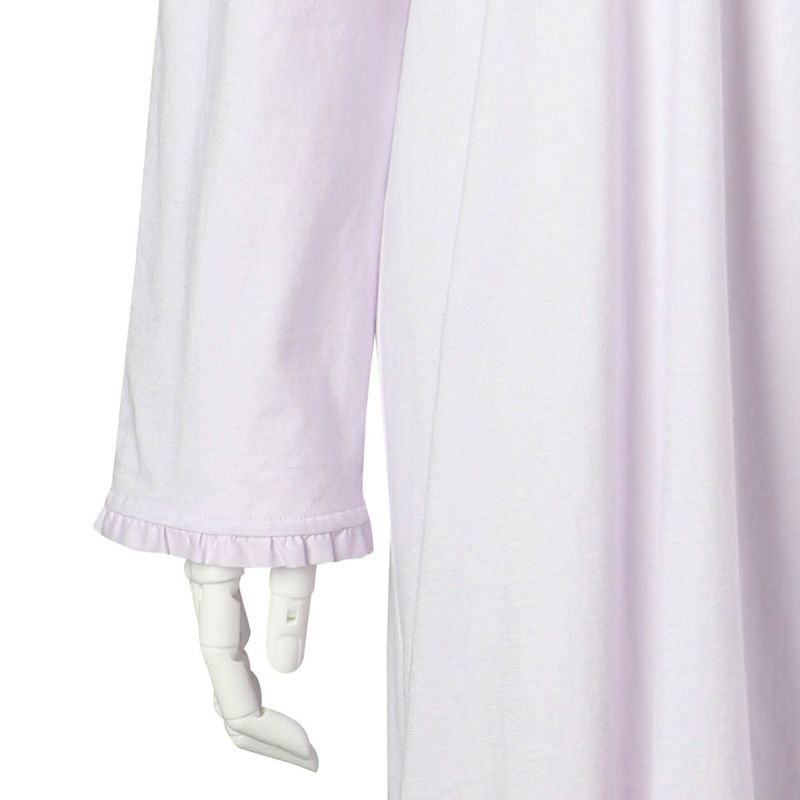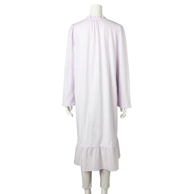 長袖ナイティは、裾の別布フリルが可愛らしいワンピースデザイン。ヨークは2枚仕立てで刺しゅうが肌に当たらない仕様。