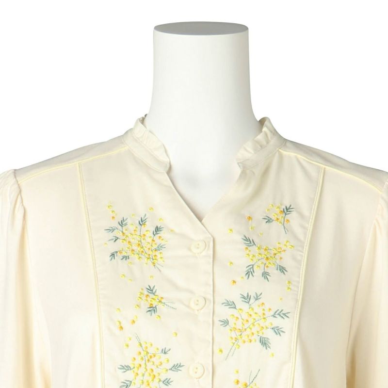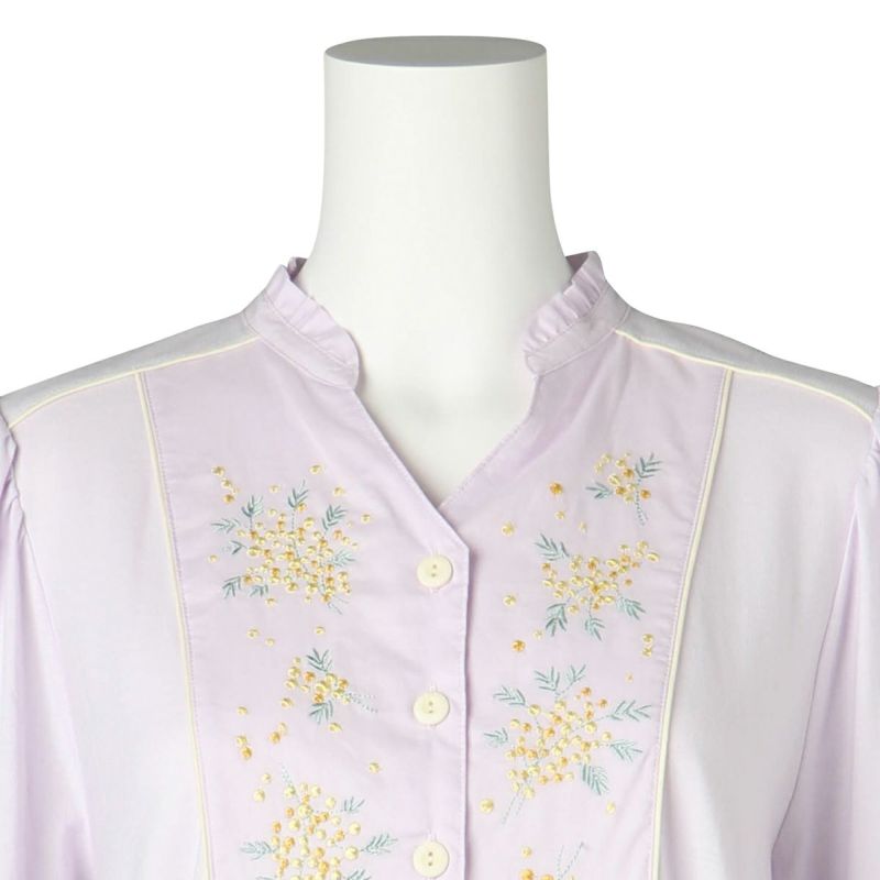 コットン100%の柔らかいカットソーの身生地と華やかなミモザ刺しゅうを施した布帛を組わせたシリーズ。アイボリーとラベンダーの上品なカラーリングと、サテンパイピングがデザインポイント。