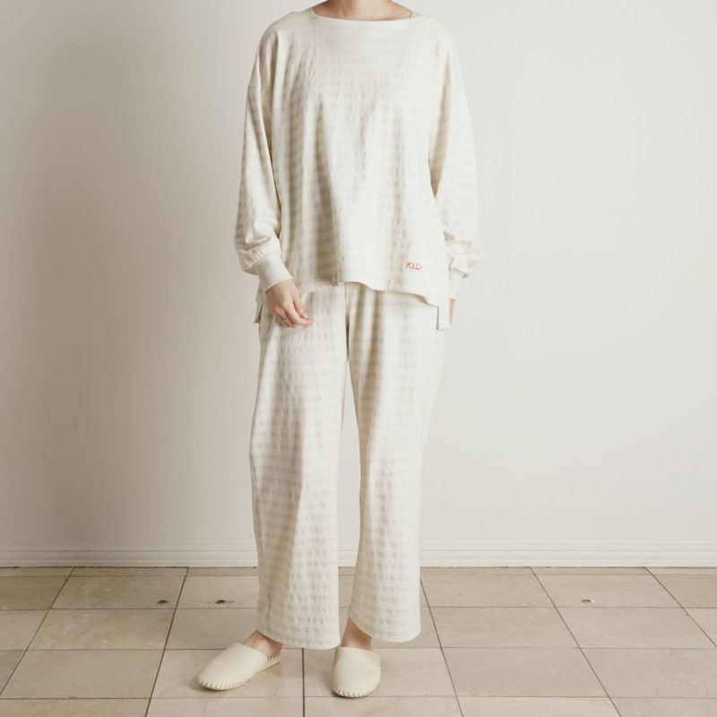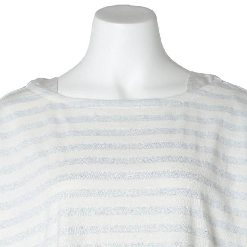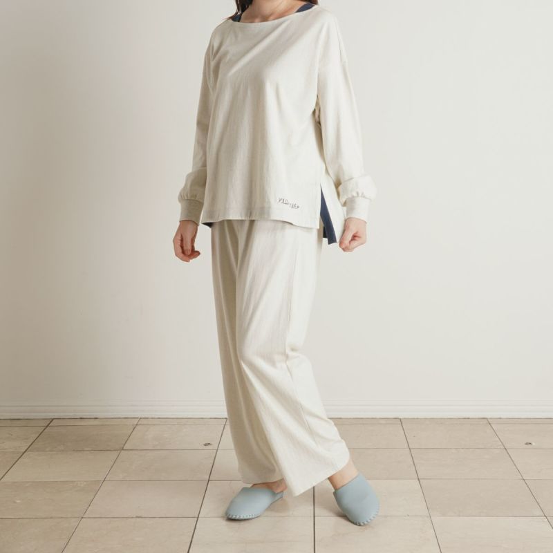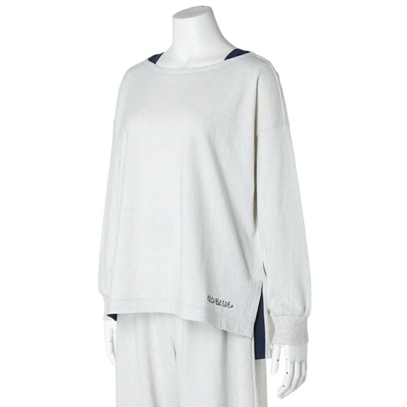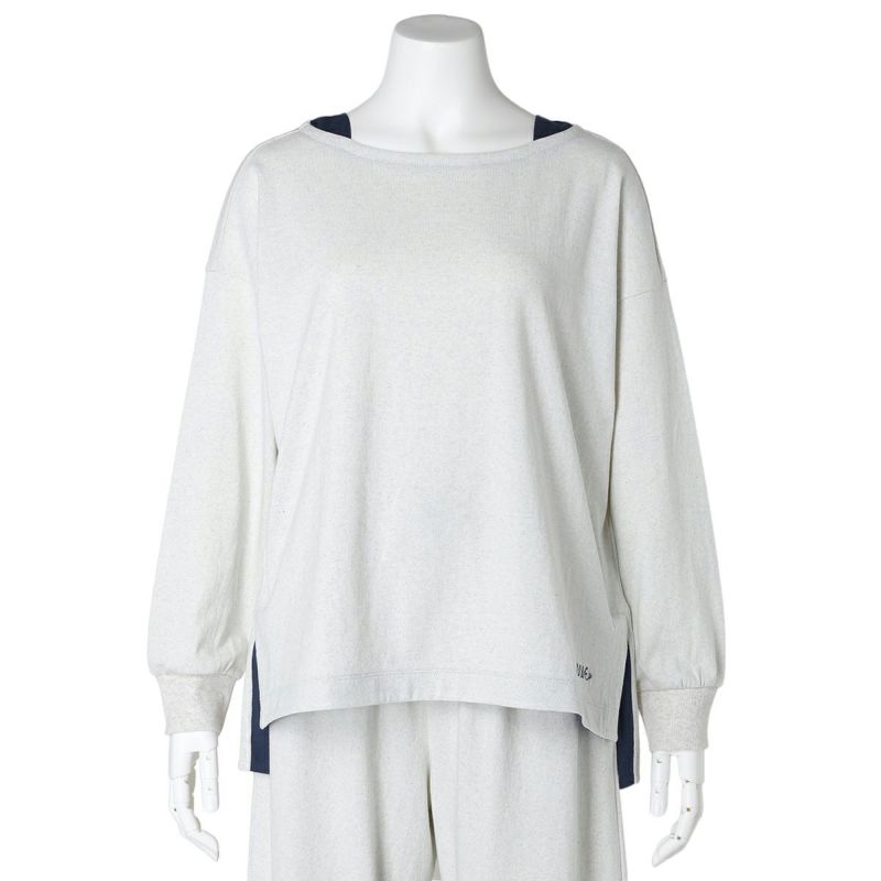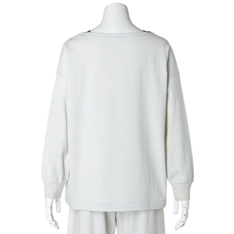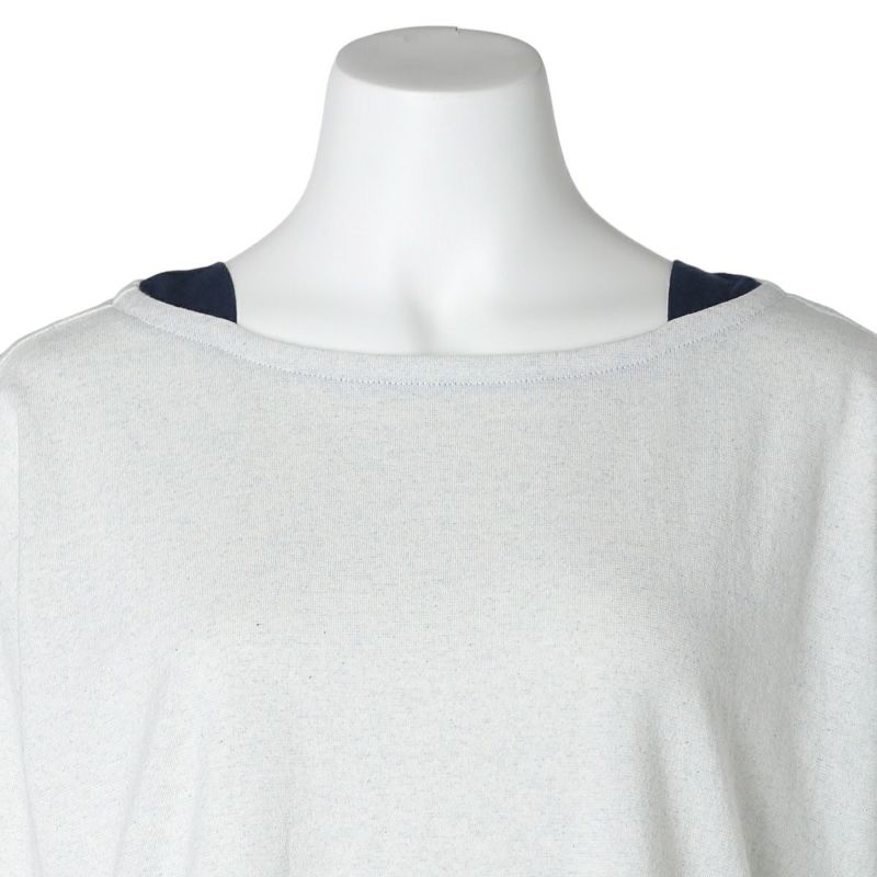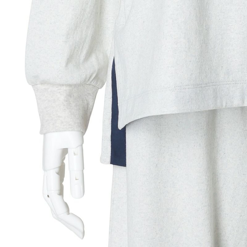 別布で裏側や襟ぐりにさりげなく施された配色と、脇にはスリットが入っており、前後差で裏の別布がちらっと見えるのがポイント。袖口はリブデザイン。