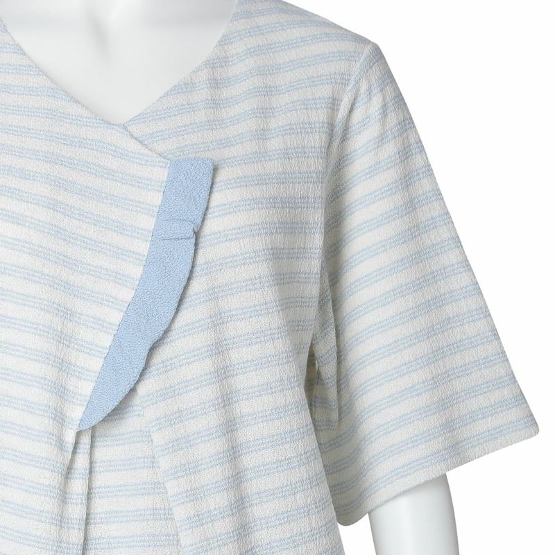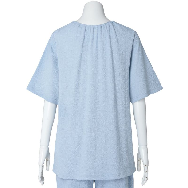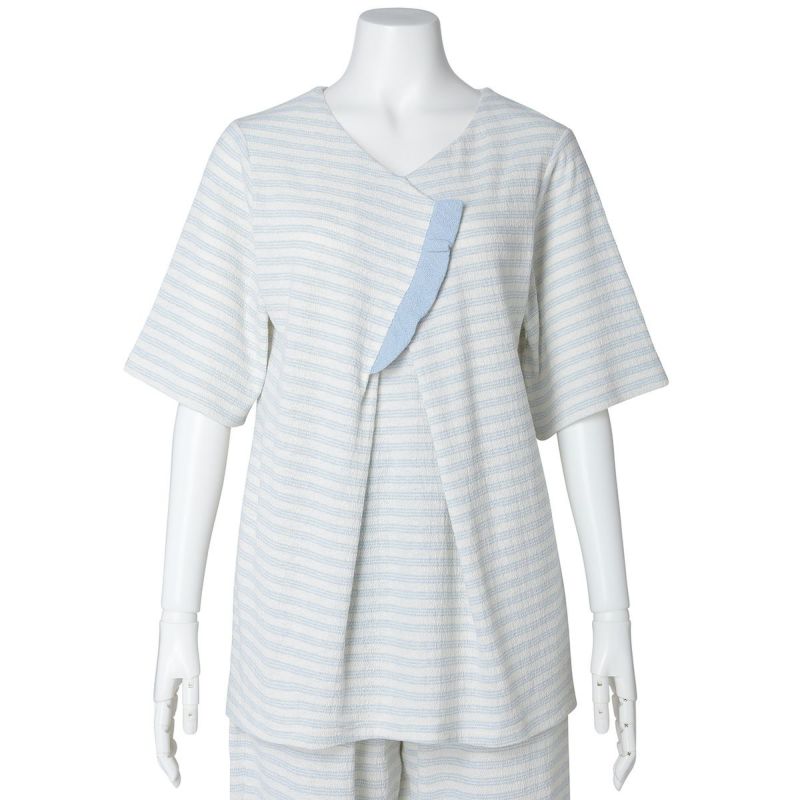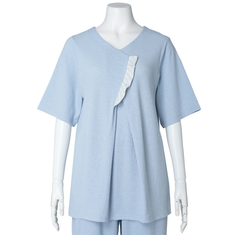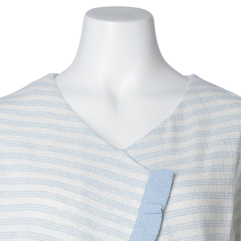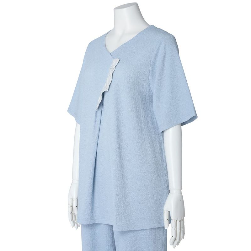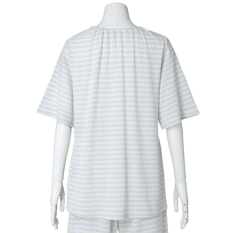 5分袖トップスは、胸元に施された配色のフリルが品よく仕上げたアクセントでほどよい甘さに。後ろ衿ぐりがインゴムで着脱しやすいのもうれしい。適度な伸度があり締め付け感がないので夏のおうち時間を快適に過ごすことができます。