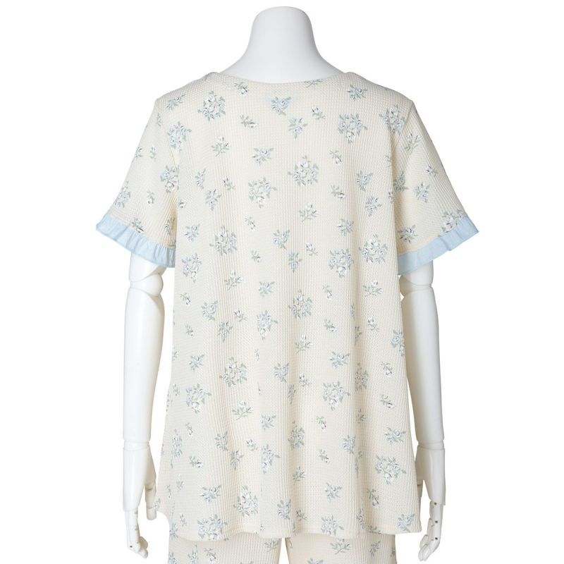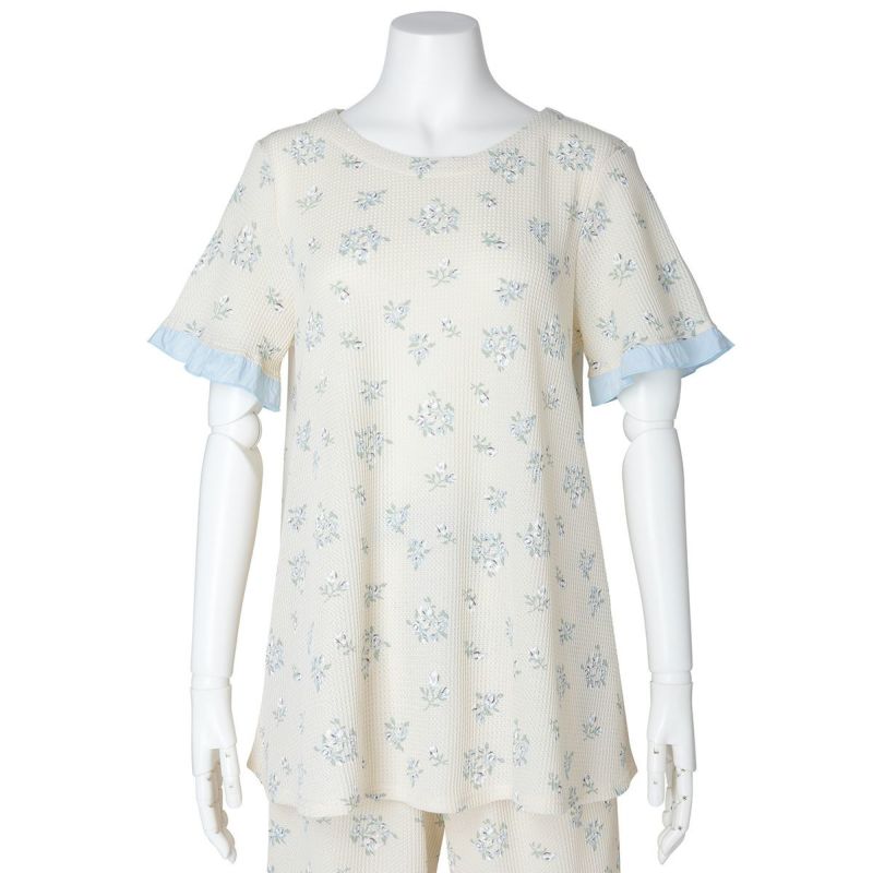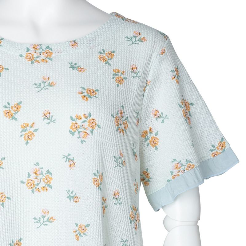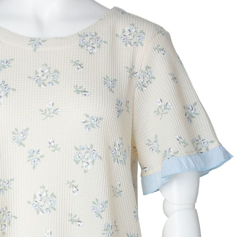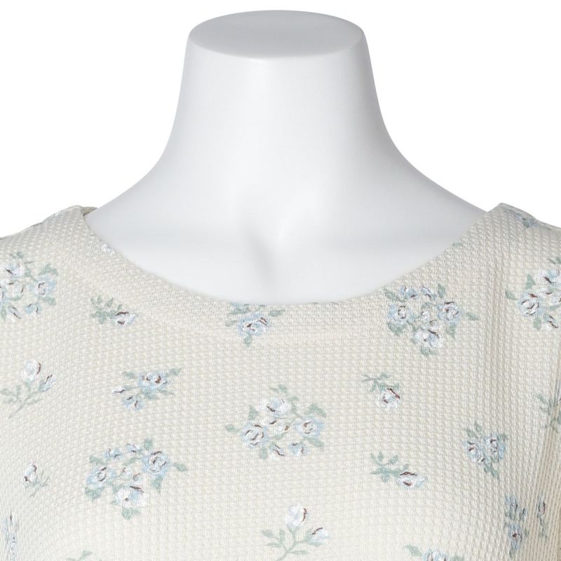 昨年大好評だった薄手のワッフル素材が新たなプリントで登場。ほどよい厚みでこれからの季節に活躍するおすすめ素材。コットンにポリエステルを混ぜることで型崩れしにくく、イージーケアがうれしい。ブーケプリントが大人のかわいらしさを演出します。