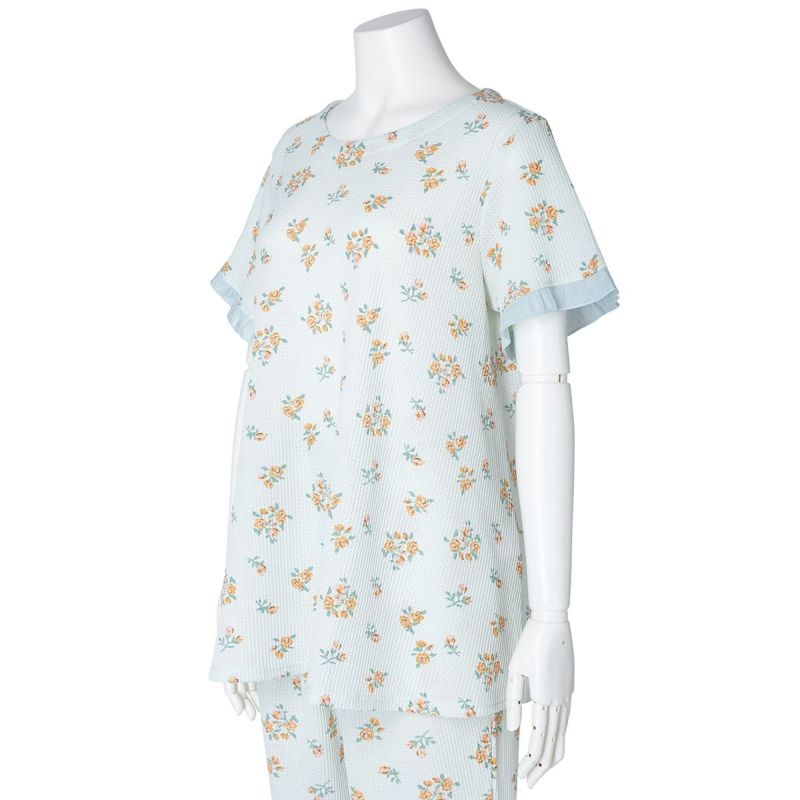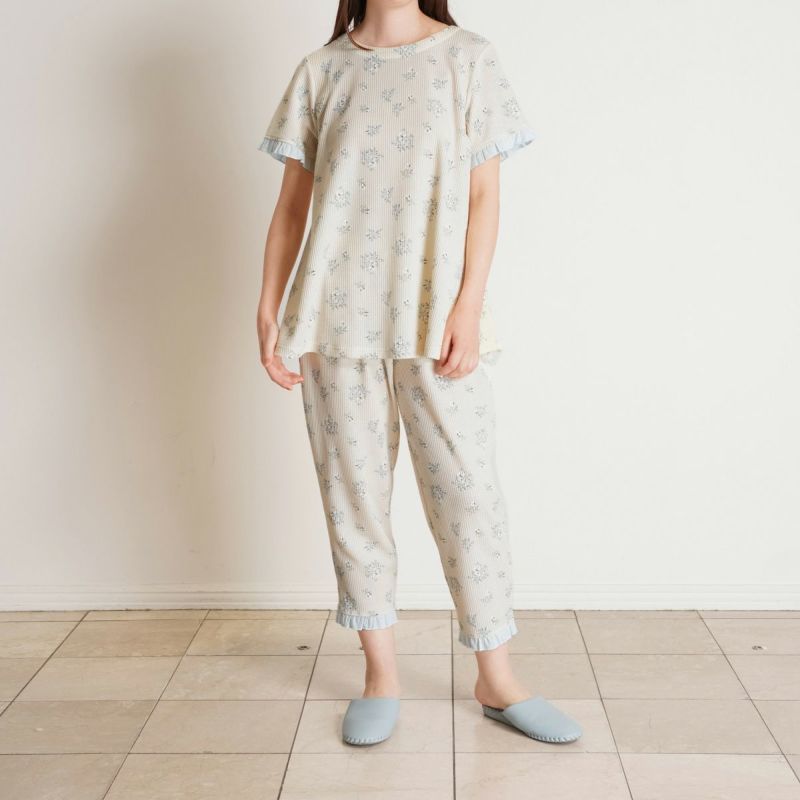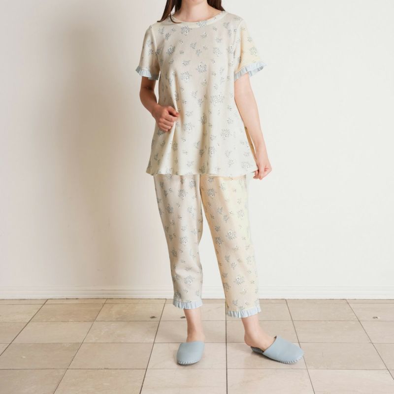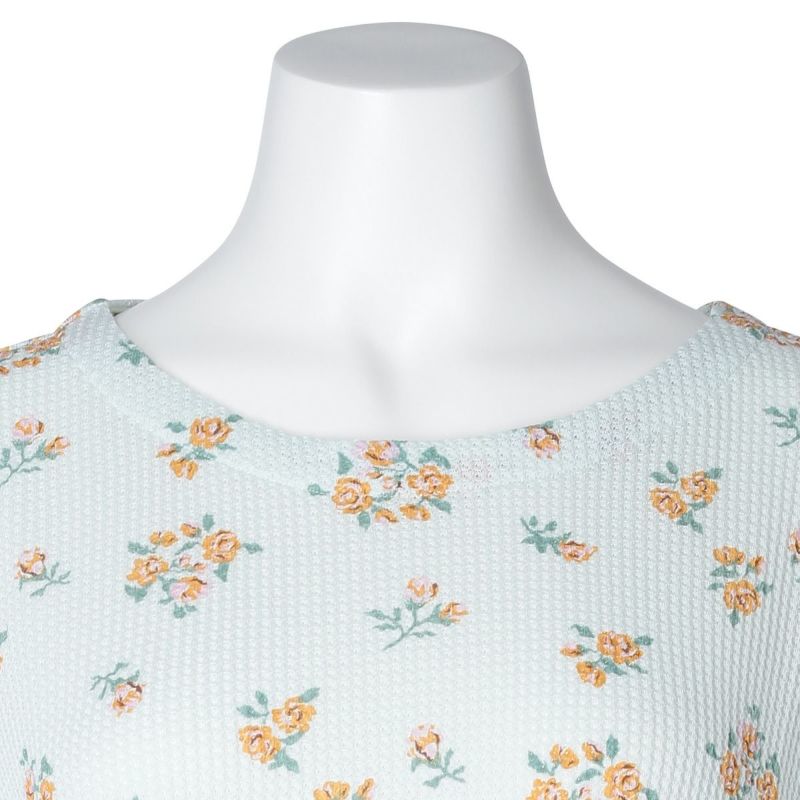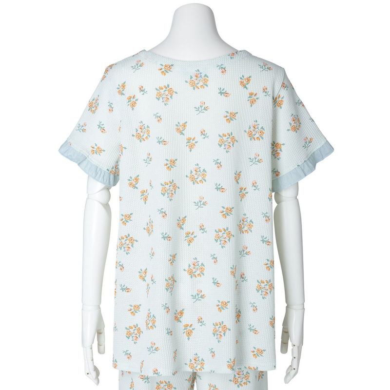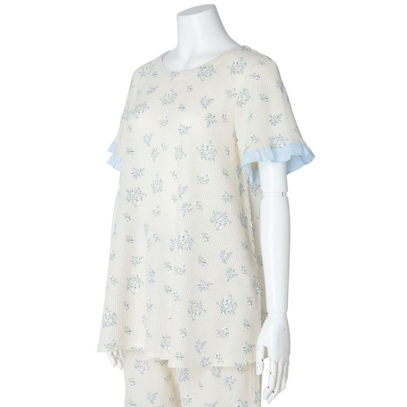 昨年大好評だった薄手のワッフル素材が新たなプリントで登場。ほどよい厚みでこれからの季節に活躍するおすすめ素材。コットンにポリエステルを混ぜることで型崩れしにくく、イージーケアがうれしい。ブーケプリントが大人のかわいらしさを演出します。