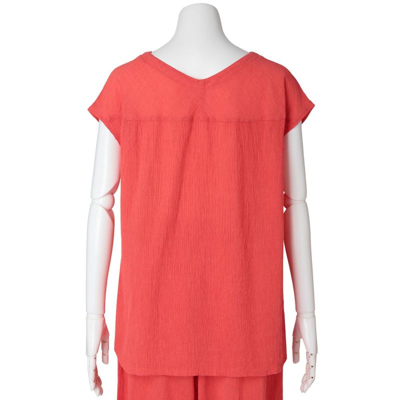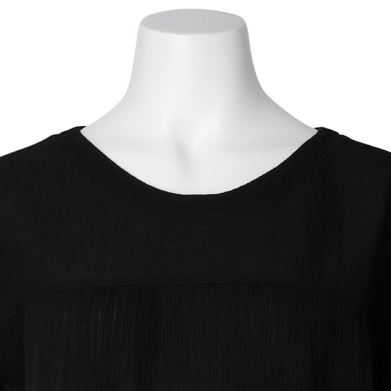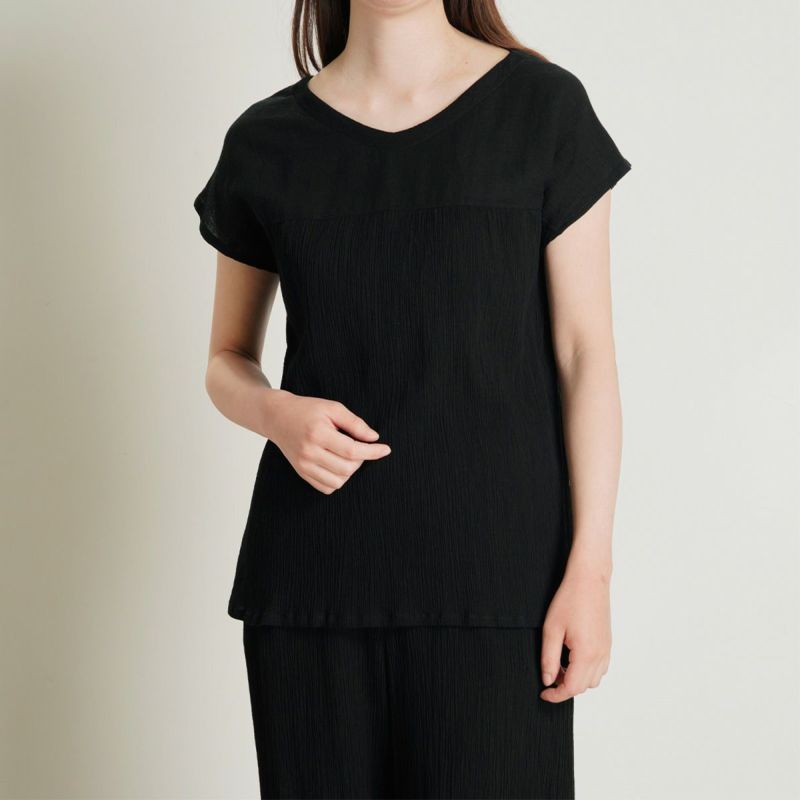 バスト部分で切り替えたゆったり着用できるトップス。すっきりきれいに見せるVとUの中間のような首元のカッティングがポイント。身頃から続く袖で縫い目をなくしより快適に。
