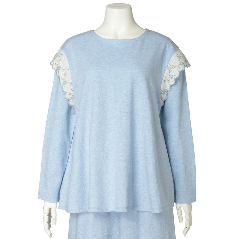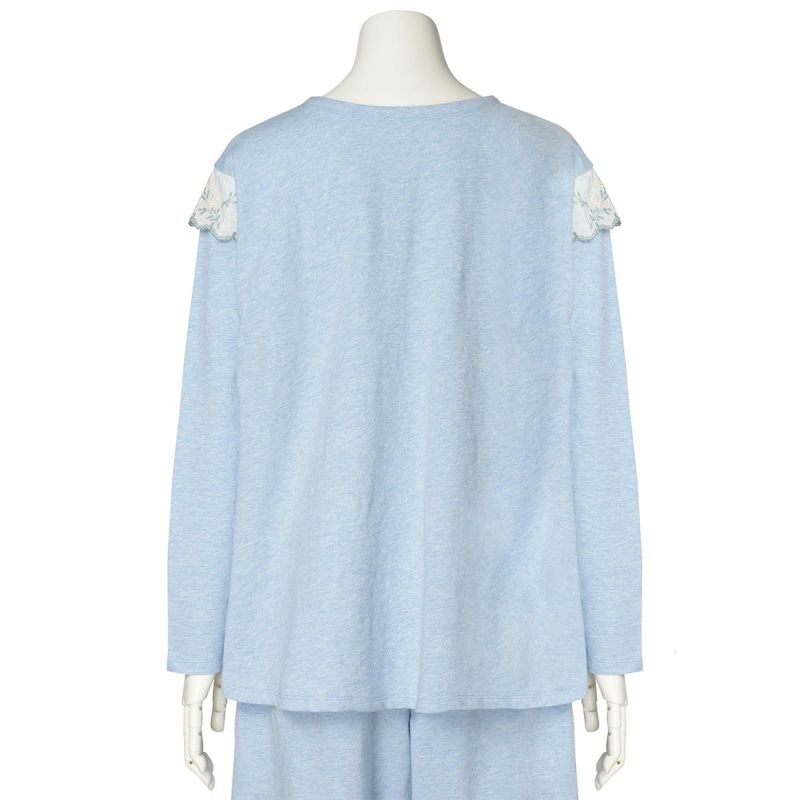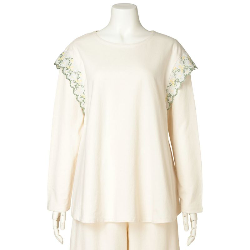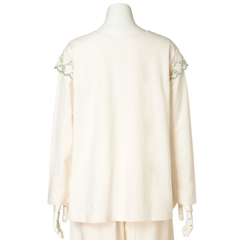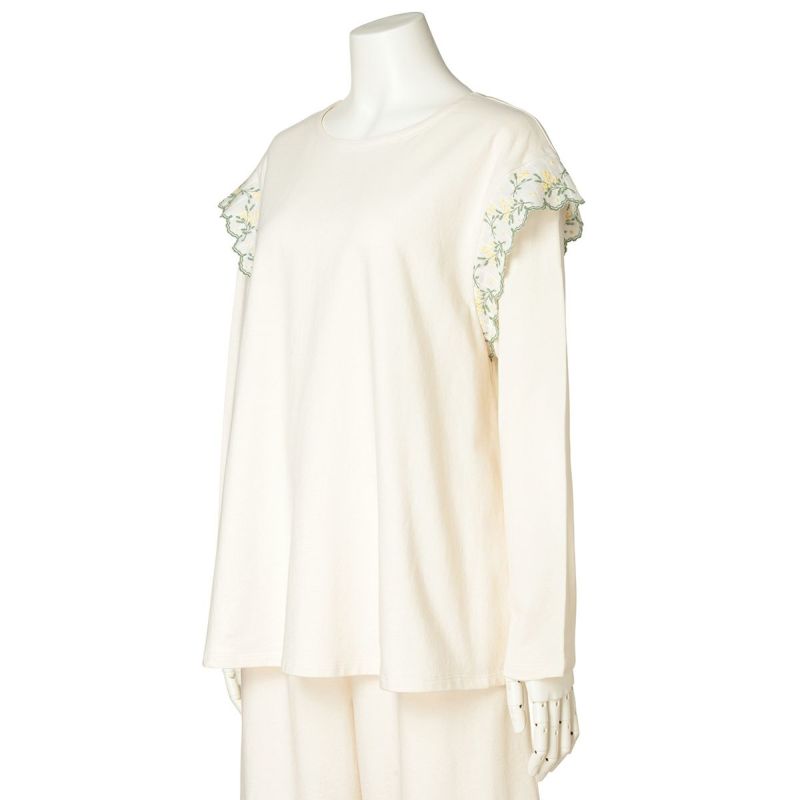 肩部分に施された繊細なミモザエンブレースが可愛らしいアクセントになっている長袖トップス。女性らしい上品さと快適な着心地を叶えます。横から見たときのシルエットも魅力的で、動くたびに表情が変わるデザインは、シンプルな中にもこだわりあり。