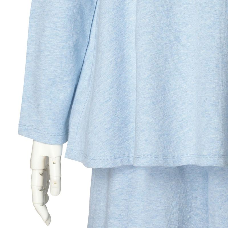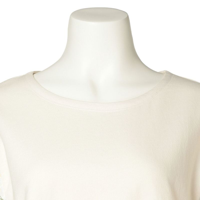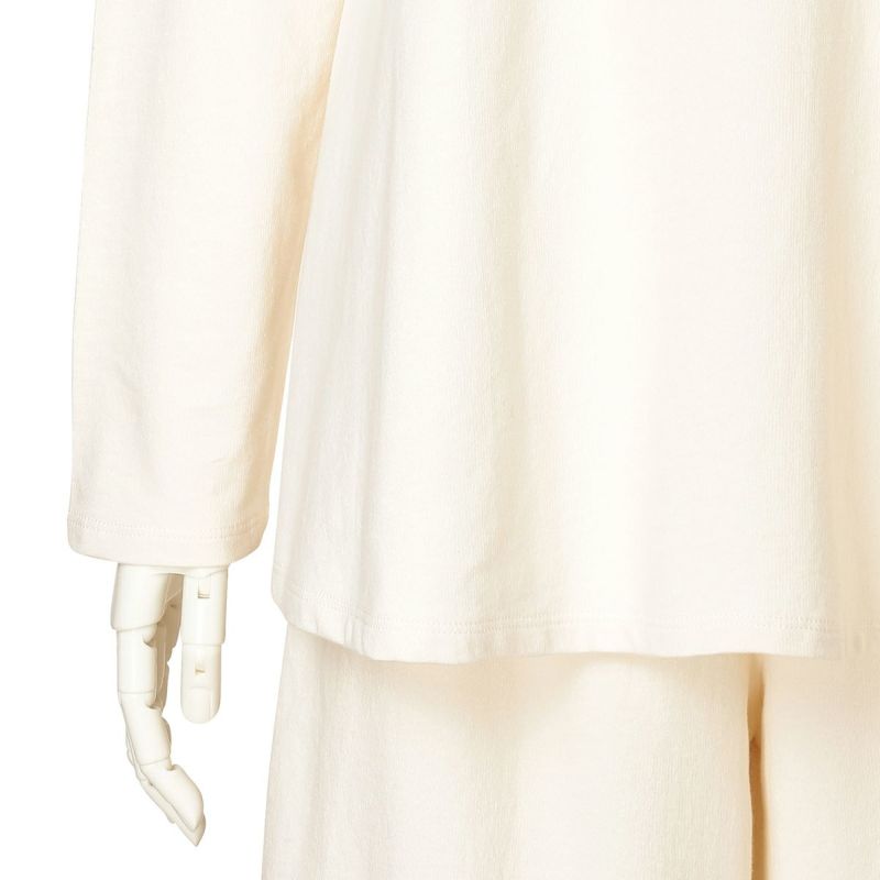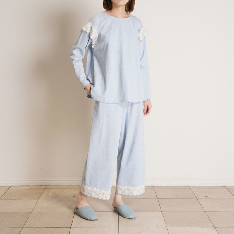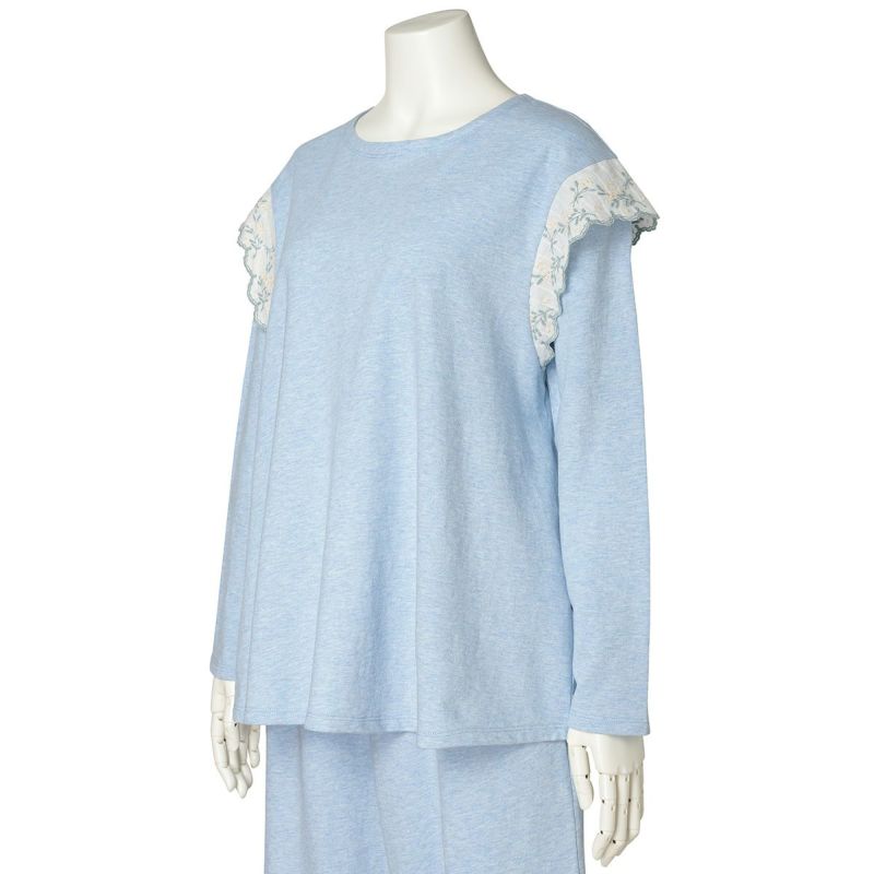 肩部分に施された繊細なミモザエンブレースが可愛らしいアクセントになっている長袖トップス。女性らしい上品さと快適な着心地を叶えます。横から見たときのシルエットも魅力的で、動くたびに表情が変わるデザインは、シンプルな中にもこだわりあり。
