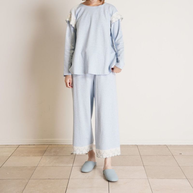 上品なミモザ柄のエンブレースがポイントのシリーズ。肌触りの良いコットン100%のインレイ素材を使用。ほどよい厚みで季節の変わり目や、春先のジャストシーズンにぴったりの仕上がりです。ソフトな雰囲気でレースが映えるアイボリーと、爽やかな杢調サックスの2色展開。25ベアフライスとのクロスコーディネートも楽しめます。